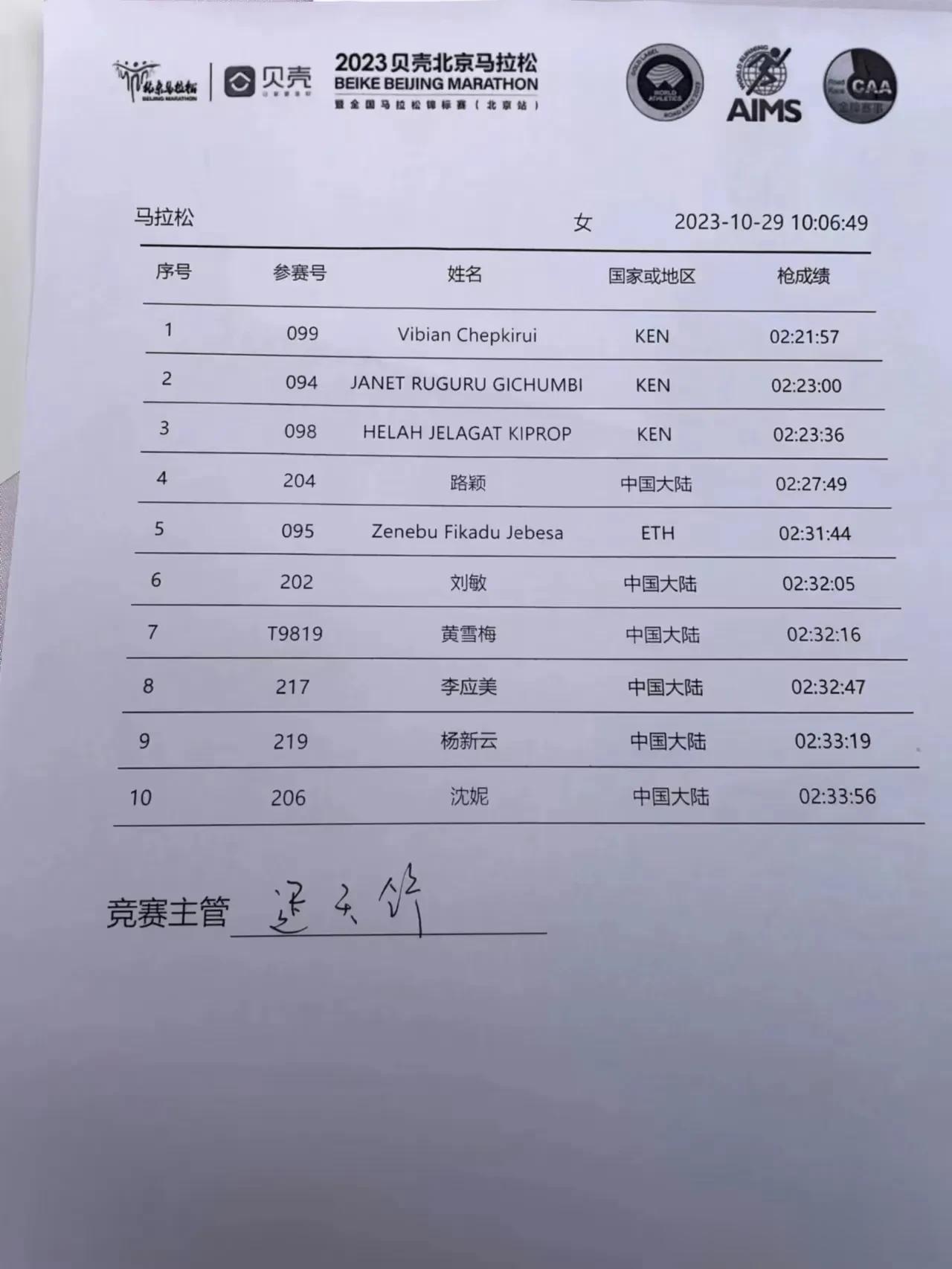 北京马拉松男女前10名成绩出来了,这应该是枪响成绩。 男子第一埃塞俄比亚选手乌尔法塔2小时7分41秒 男子国内第一陈天宇2小时8分11秒,陈天宇的这个成绩也是中国马拉松的第三好成绩,大幅的刷新了PB(2:13:15) 女子第一名肯尼亚选手切普吉鲁伊2小时21分57秒 女子国内第一路颖2小时27分49秒 获得国内男女第一名的陈天宇和路颖都跑出了非常不错的成绩,中国马拉松也在一点点进步[赞][给力] #北京马拉松加油# #北马加油!!!#