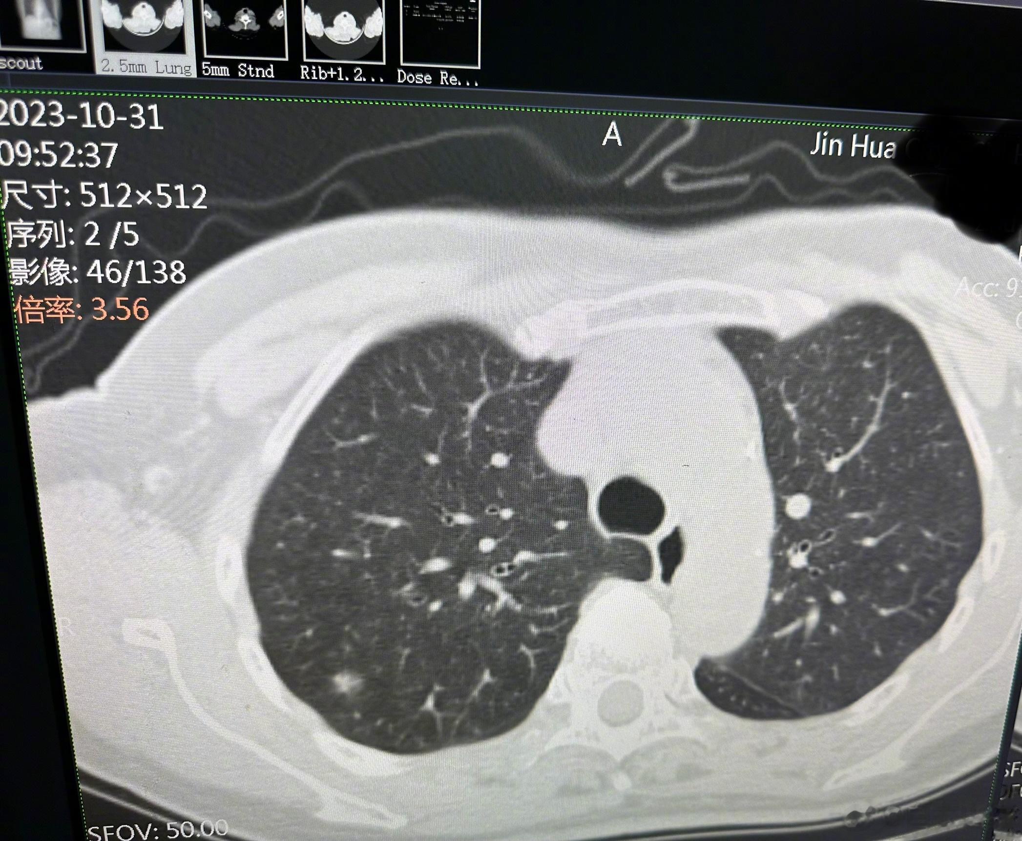 在2021年初,她在体检的时候发现了肺结节,毛玻璃样,右肺上叶两个、右肺下叶一个,左肺上叶一个。此后每六到八个月,复查一次肺部CT,一直到今年的两月份,肺结节都没有明显的变化。