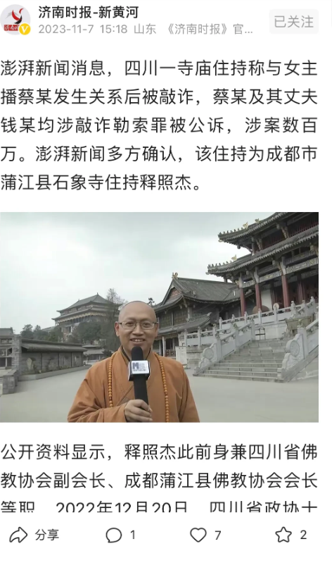 四川一寺庙住持被性敲诈一事整得沸沸扬扬,至少有几点值得注意: