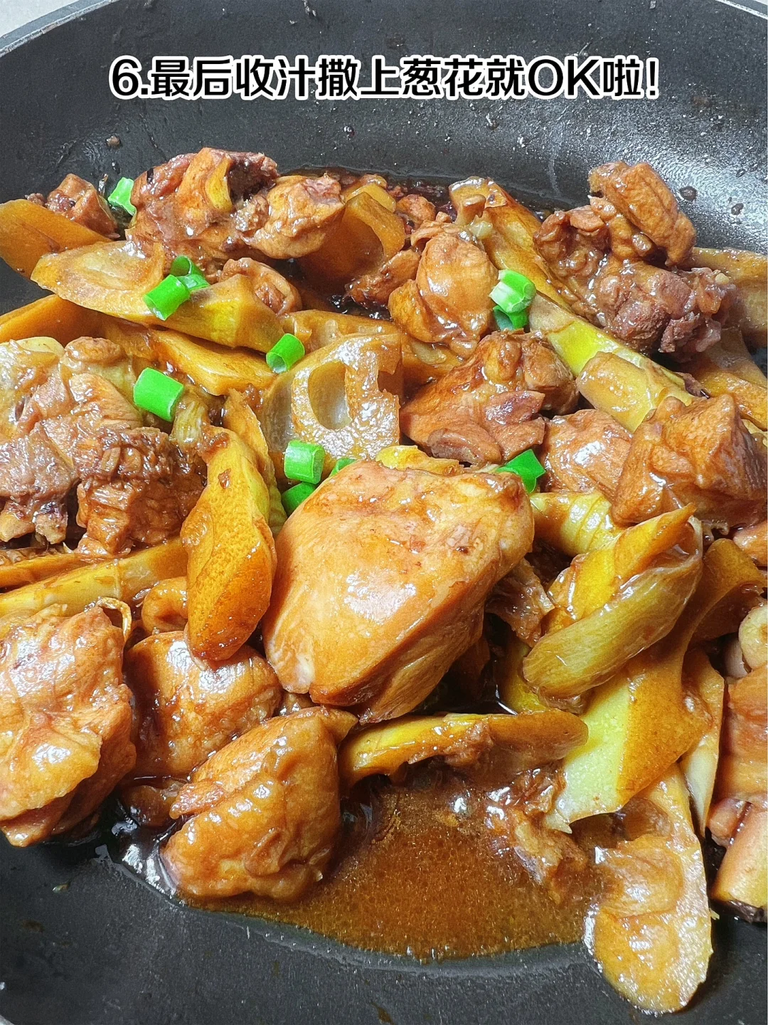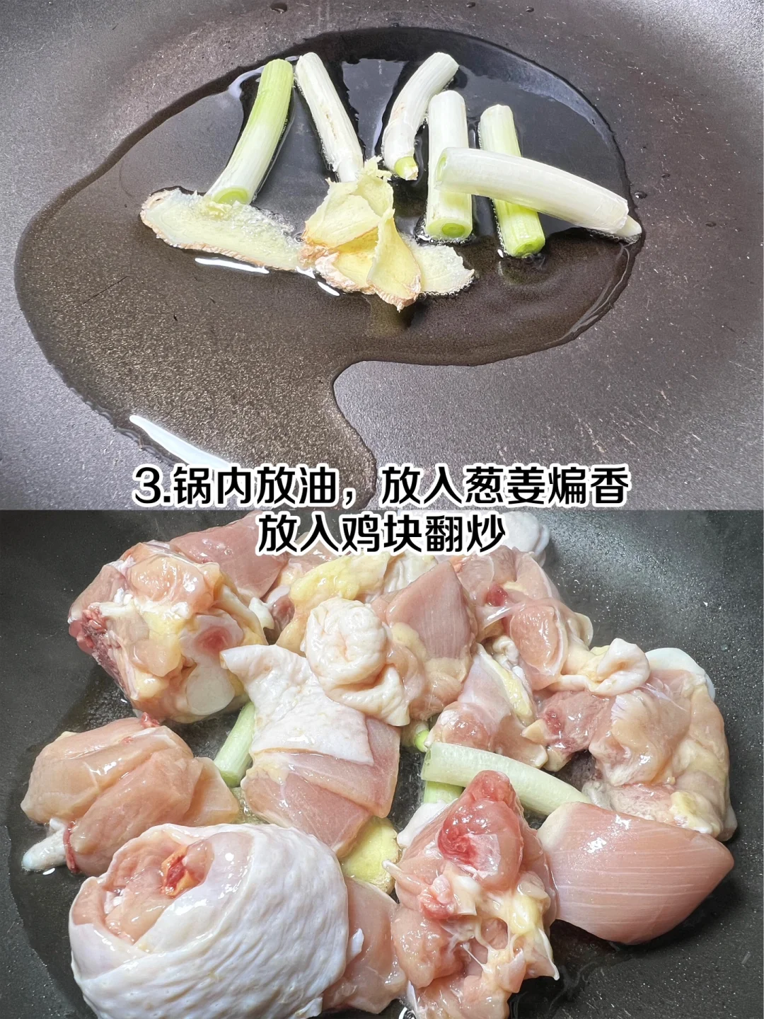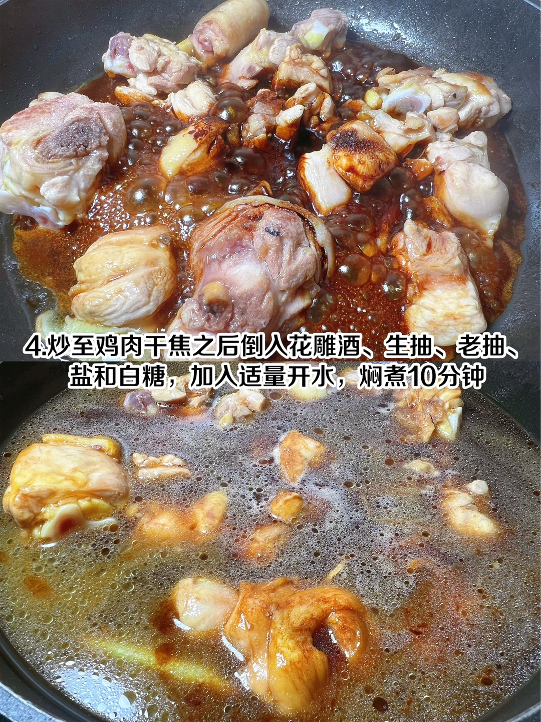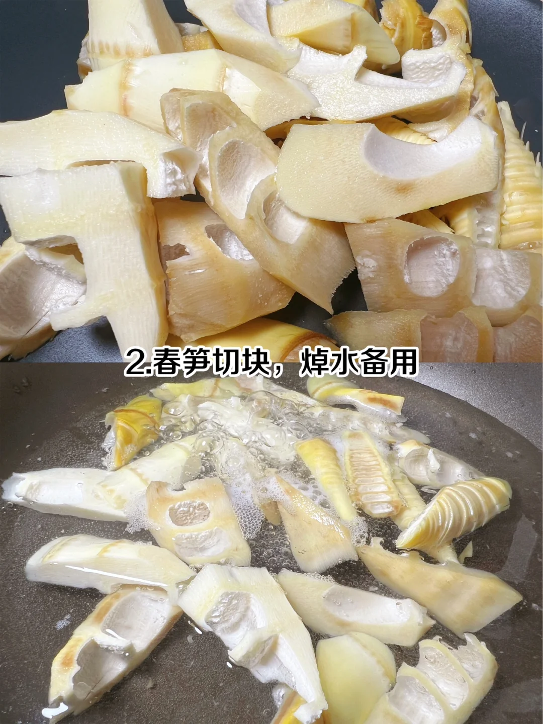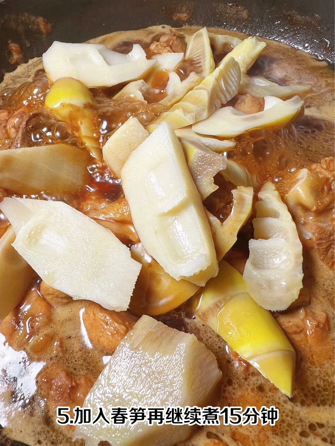 【享受春日美味】热气腾腾的春笋鸡煲,滋补又暖胃,绝对是你的春日必试菜! 步骤 1、鸡肉切块,浸泡出血水 2、春笋切块,焯水备用 3、锅内放油,放入葱姜煸香,放入鸡块翻炒 4、炒至鸡肉干焦之后倒入花雕酒、生抽、老抽、盐和白糖,加入适量开水,焖煮10分钟 5、加入春笋再继续煮15分钟 6、最后收汁撒上葱花就OK啦