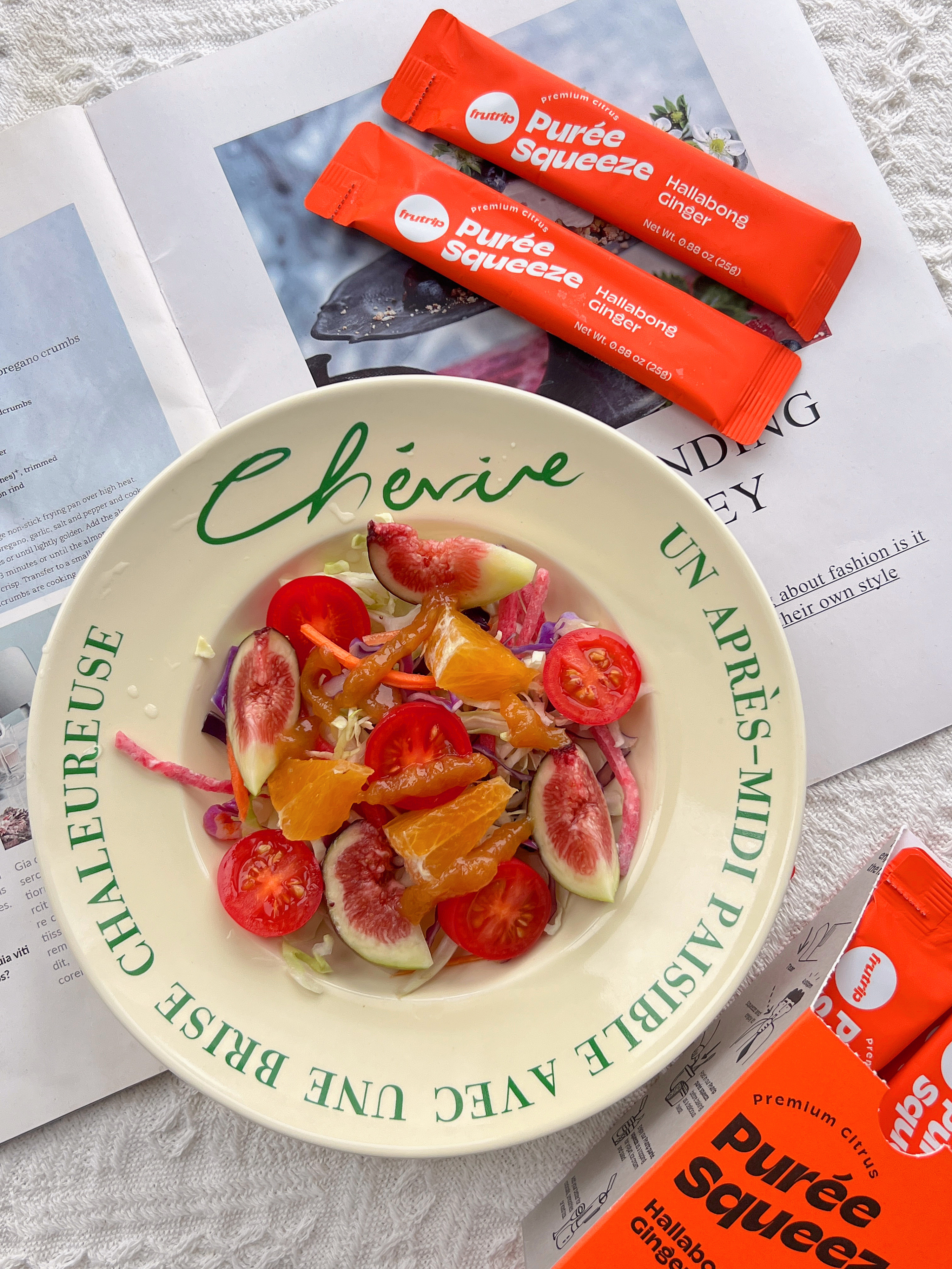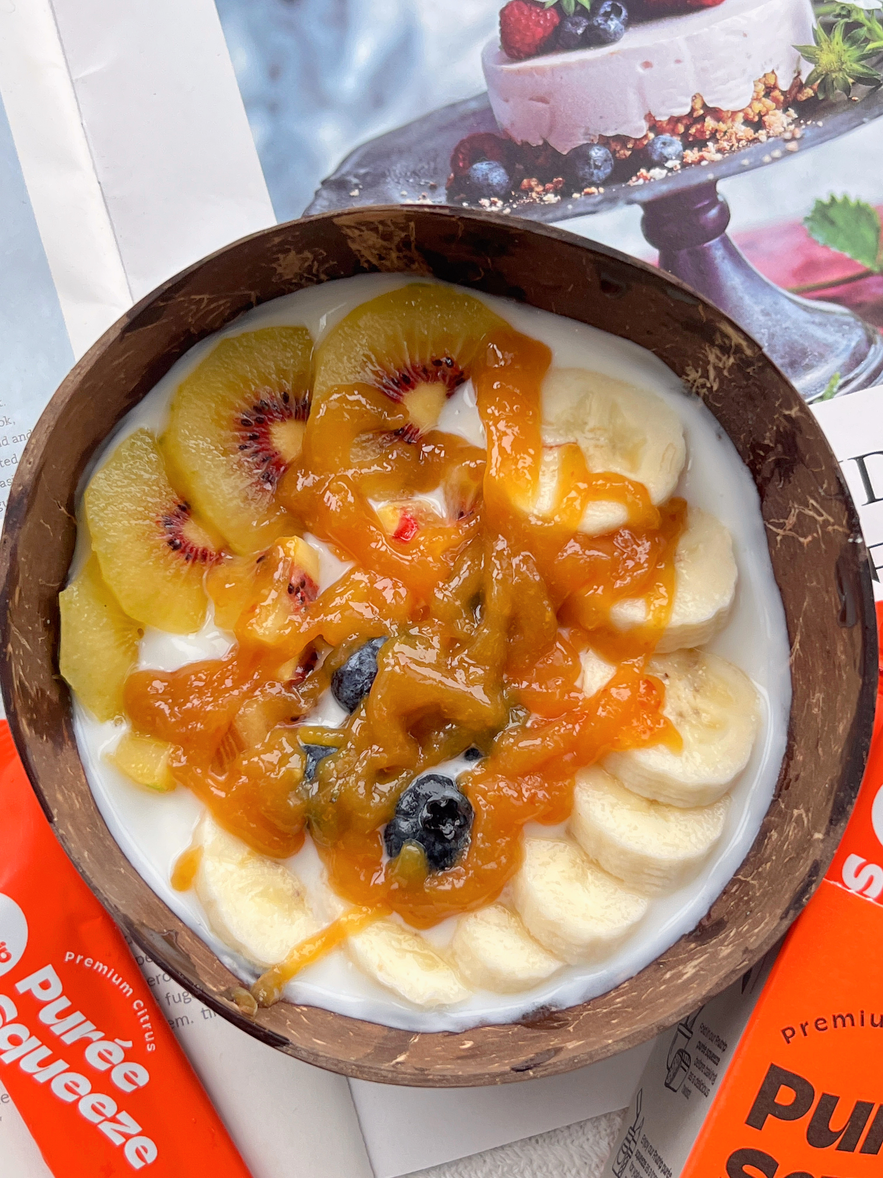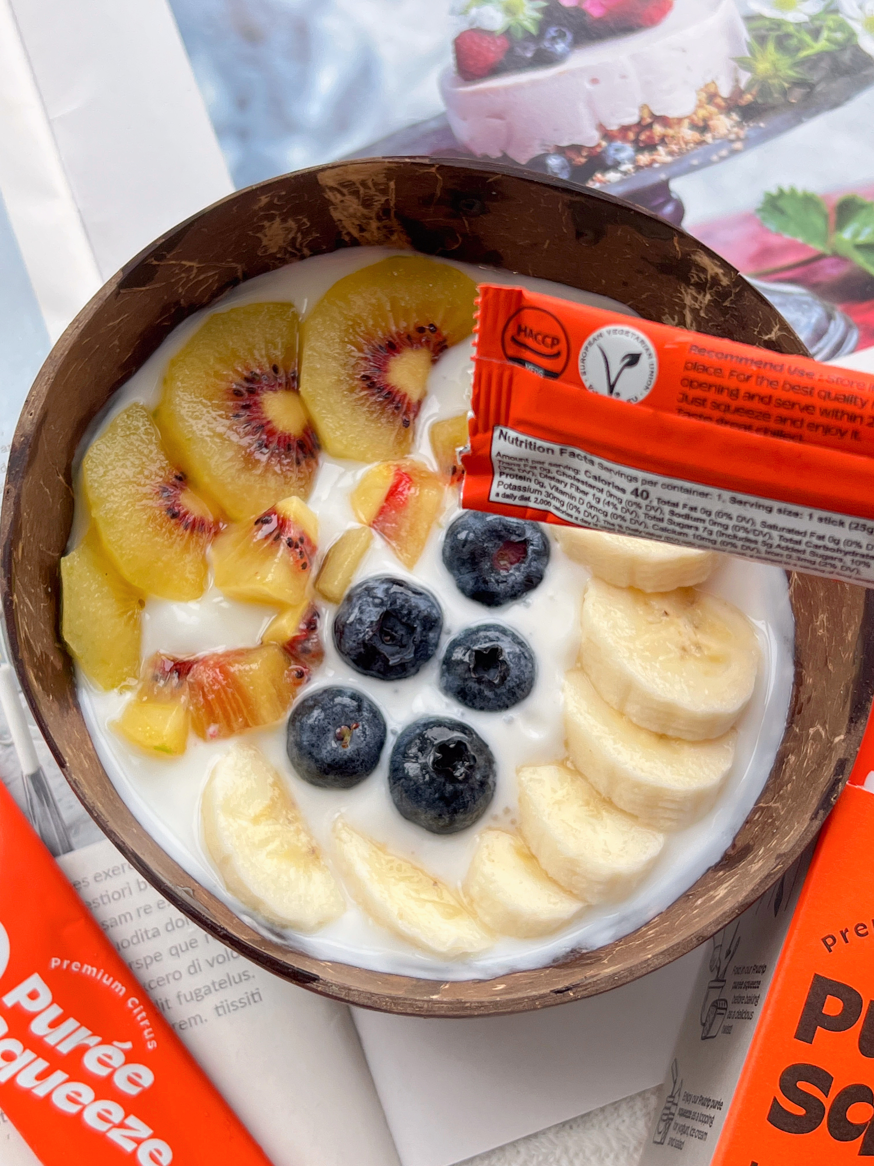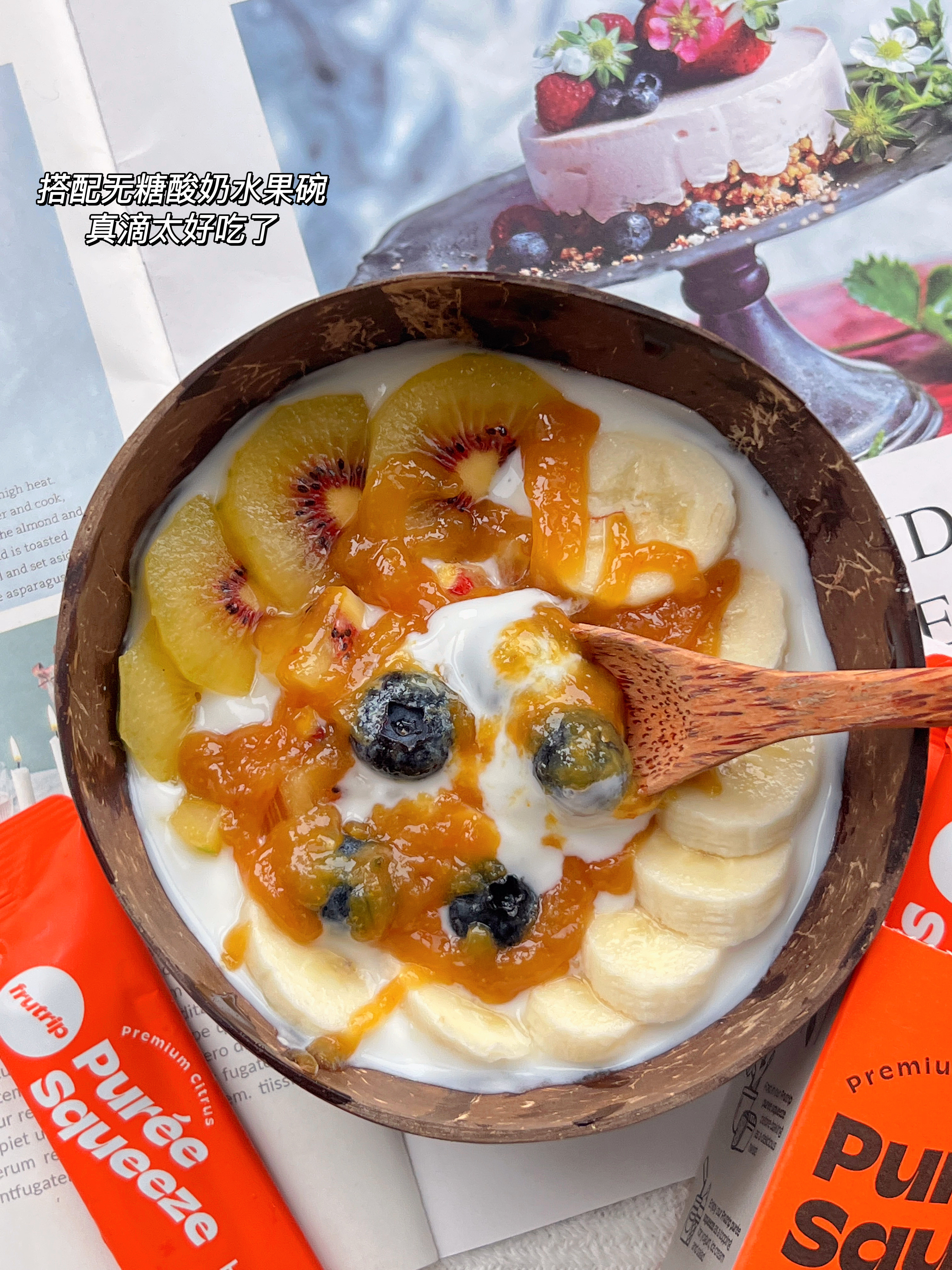 为了控糖控体我现在都把每天的加餐换成了无糖水果酸奶碗和沙拉啦 不过无糖酸奶真的酸的难以下咽 这也让我发现了一款好吃又健康的搭配神器 就是Puree Squeeze Line柑橘果泥, 它是由带皮水果和蔬菜以及 100%鲜榨果汁混合而成的果泥 含有丰富的维生素D和膳⻝纤维 而且它的升糖指数也非常低 控糖减脂期和孕妈也可以吃🍊