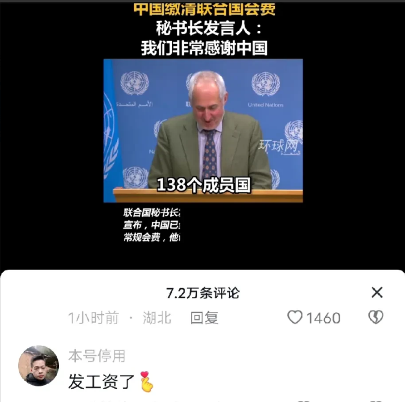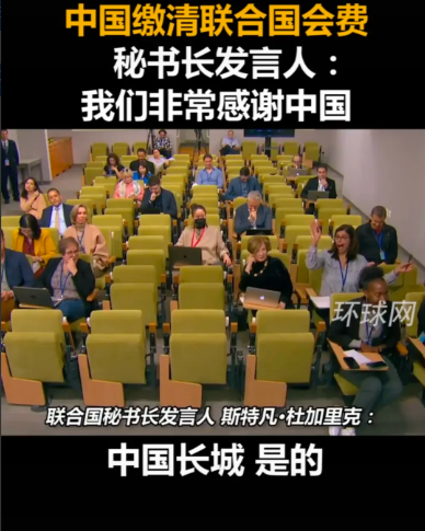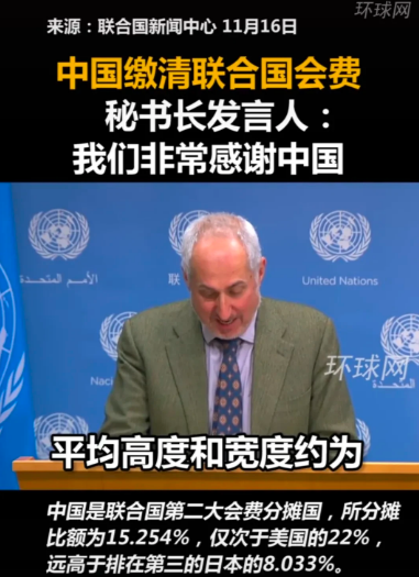 联合国发言人高兴地宣布中国交齐了今年近5亿美元的会费,还现场夸起了中国长城。网友:发工资了,能不高兴吗? 目前中国是联合国第二大会费分摊国,分摊比例为15.254%,仅次于美国的22%,第三的日本是8.033%!
