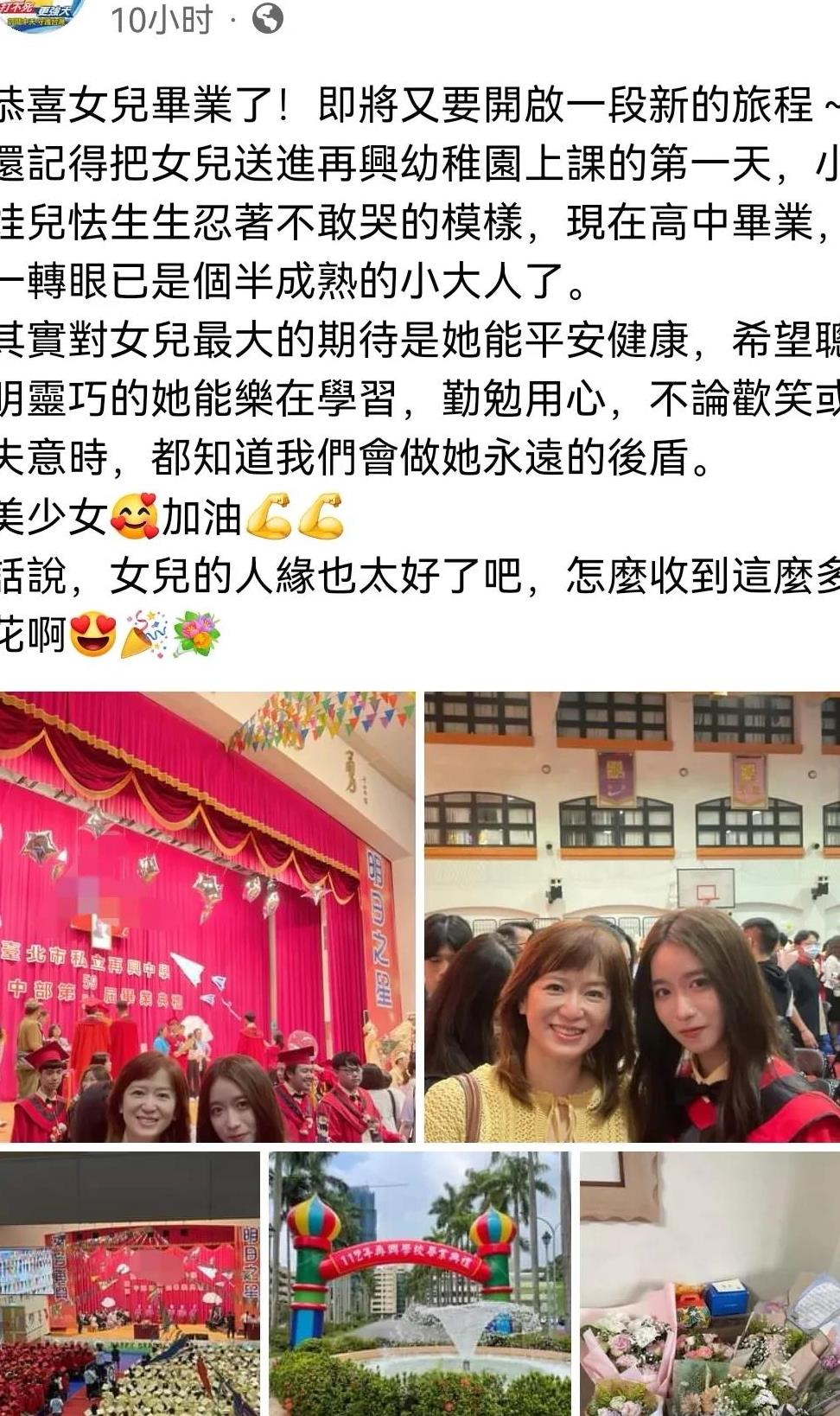主播周玉琴昨天参加了女儿的高中毕业典礼,女儿在台北市再兴中学成功毕业,表现出色。 该校是台北的一所明星私立学校,许多政商名流子女都选择在这里就读,包括马英九、严家淦、宋楚瑜的子女。
