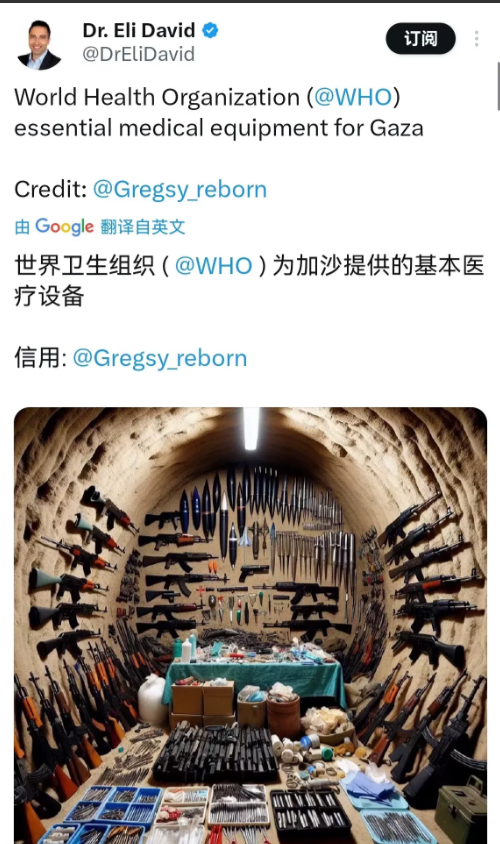 以色列人造假被抓包实锤,自从有了Ai合成照片造假就特别简单了。一位以色列大V在网上发布了一则推文说“世界卫生组织为加沙提供的基本医疗设备。”并配了一张照片做支撑,俨然一副有图有真相的样子。结果被网友现场拆穿,墙上挂的枪居然还有两端都是枪管的,这明显就是Ai合成图。网友惊叹这比洗衣粉还离谱,另外这些枪是用磁铁吸在土洞壁上的吗?居然可以不用借助任何悬挂支撑。