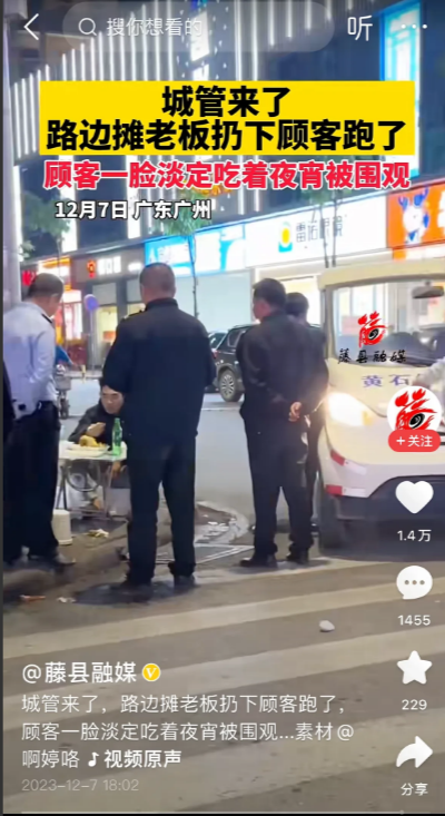 这一幕发生在广州街头,那么既然摊主跑了,城管为啥还不走呢?原来是这里还有摊主的支的小桌子,估计城管需要把这个收走,但是呢顾客是花钱消费了,还没有吃完,所以他们也不好下手,只好等着,然而看顾客心理素质如此强大,不慌不忙吃的津津有味,估计城管也没想到更拿他没办法,哈哈……