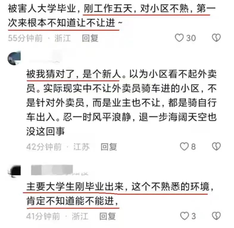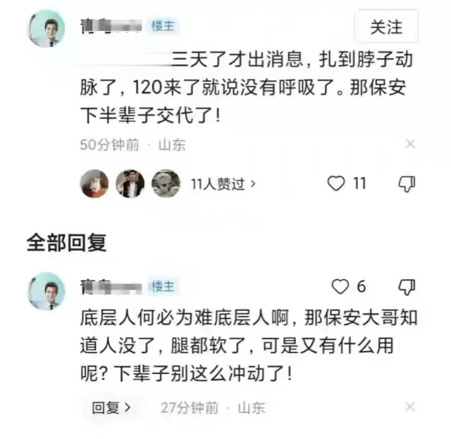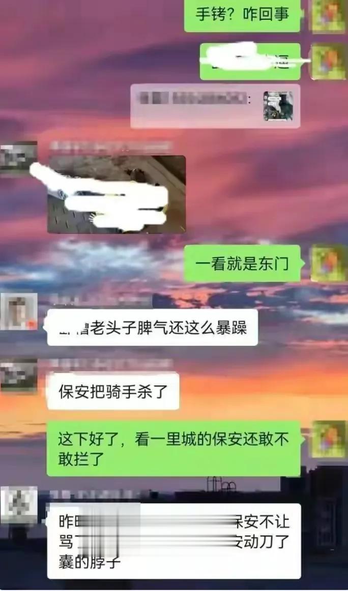 【到底谁疯了?】 保安,外卖小哥。 有人说疫情三年,保安翻身做财主。 疫情过去了,保安又恢复正常表情。 今天,又发生一场血案。 外卖小哥去进去送外卖 保安拦截不让进去 两人发生争执 结果外卖小哥要闯进去 保安突然拔出刀, 外卖小哥看见刀,拔腿就跑。 保安抓住外卖小哥的衣角 上前就刺了几刀。 后来该骑在外卖小哥身上继续捅几刀。 直到周围群众上前拉开,保安海外哪里继续捅人。 后续真相:外卖小哥是女的,大学生刚做外卖,她并不知道,她送地方是外卖小哥们都知道最难送地方,没有人愿意去。 只可惜她不知道,为了一单3元钱,她搭上一条命。 网友们说说看看?