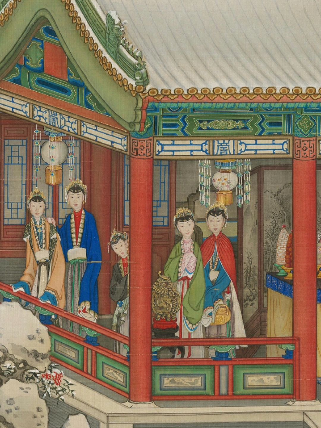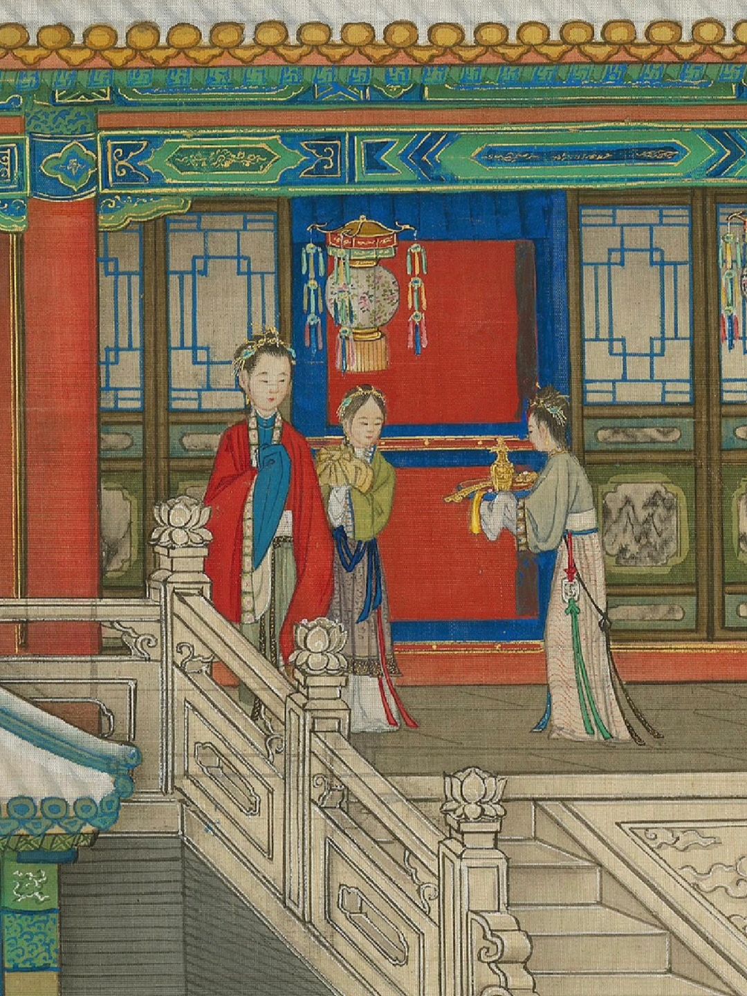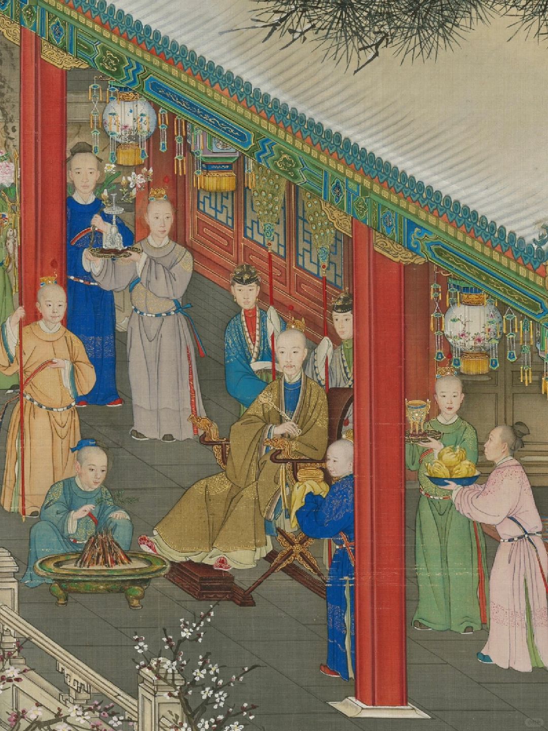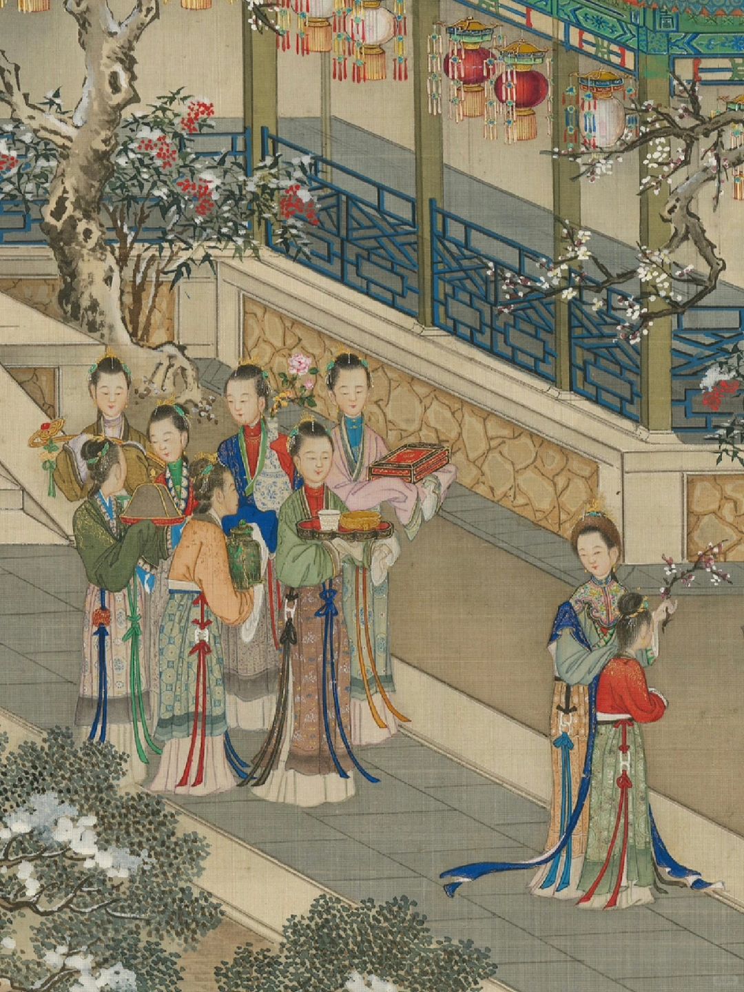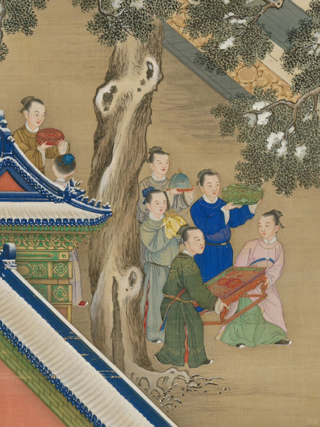 《弘历喜雪图》大概创作于乾隆十年,属于皇家宫廷写实画。作者佚名。画中场景为皇家园林圆明园,背景是山水间皑皑的白雪与错落其间的宫殿建筑。画中乾隆皇帝(弘历)与他的后妃、皇子皇子、公主一起赏雪的情景,反映了皇室后宫的一个侧面,具有浓厚的生活气息。画面渲染出了皇家岁朝喜庆祥和的氛围,展示出乾隆帝作为丈夫、父亲与诸后妃、皇子间浓浓的亲情。
