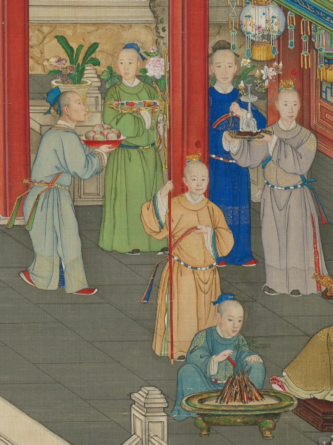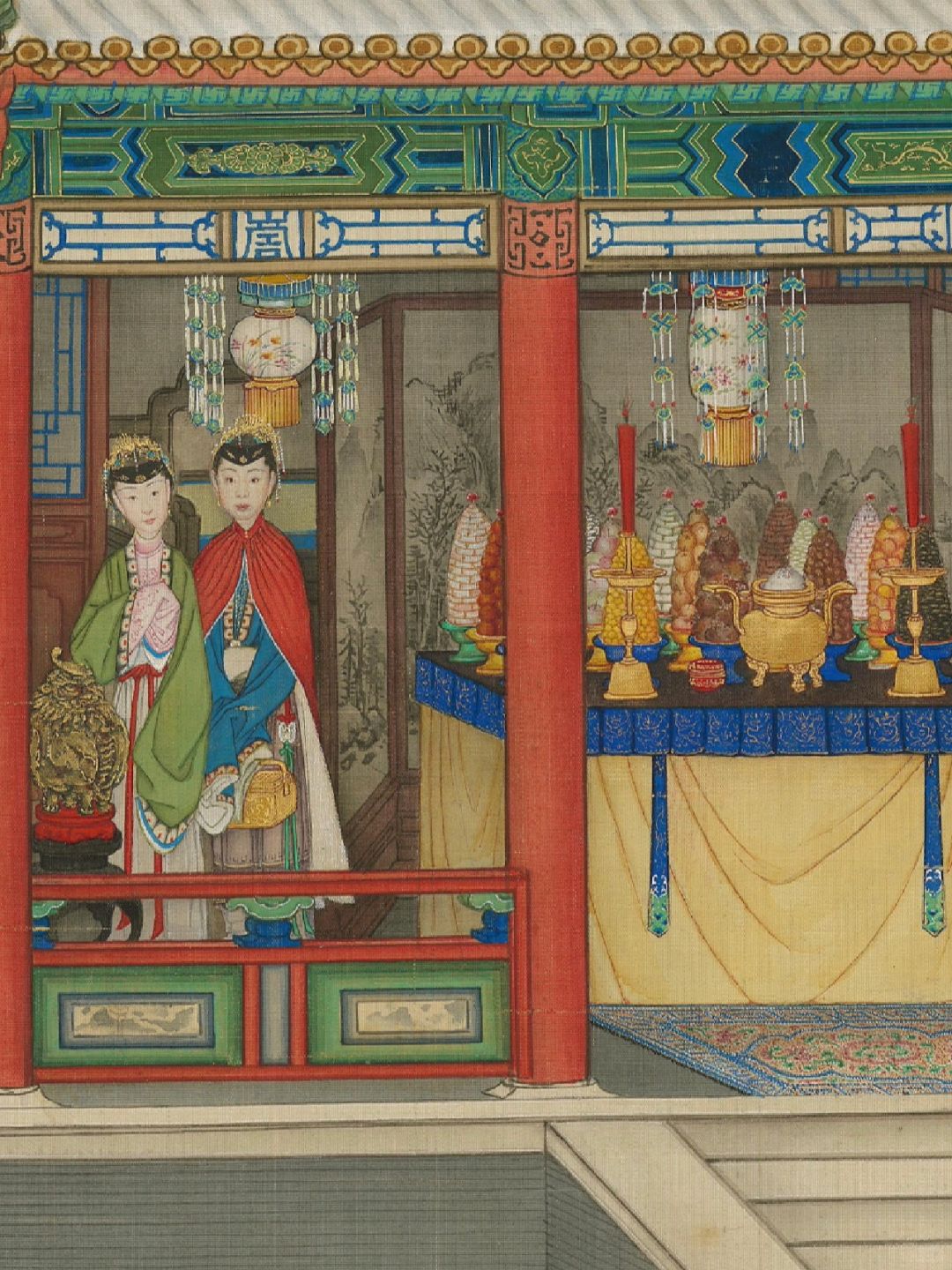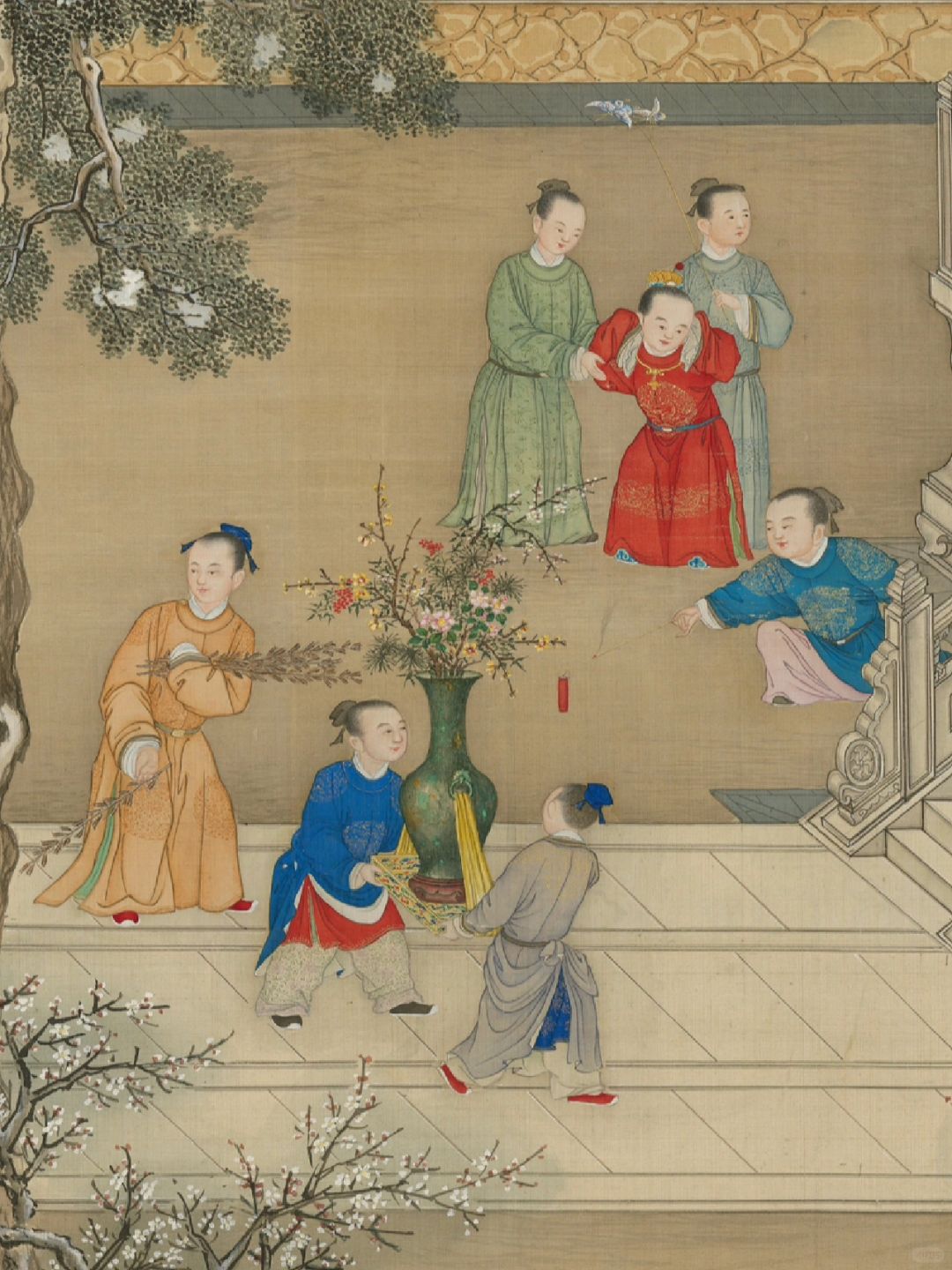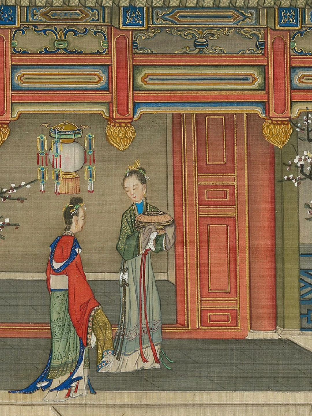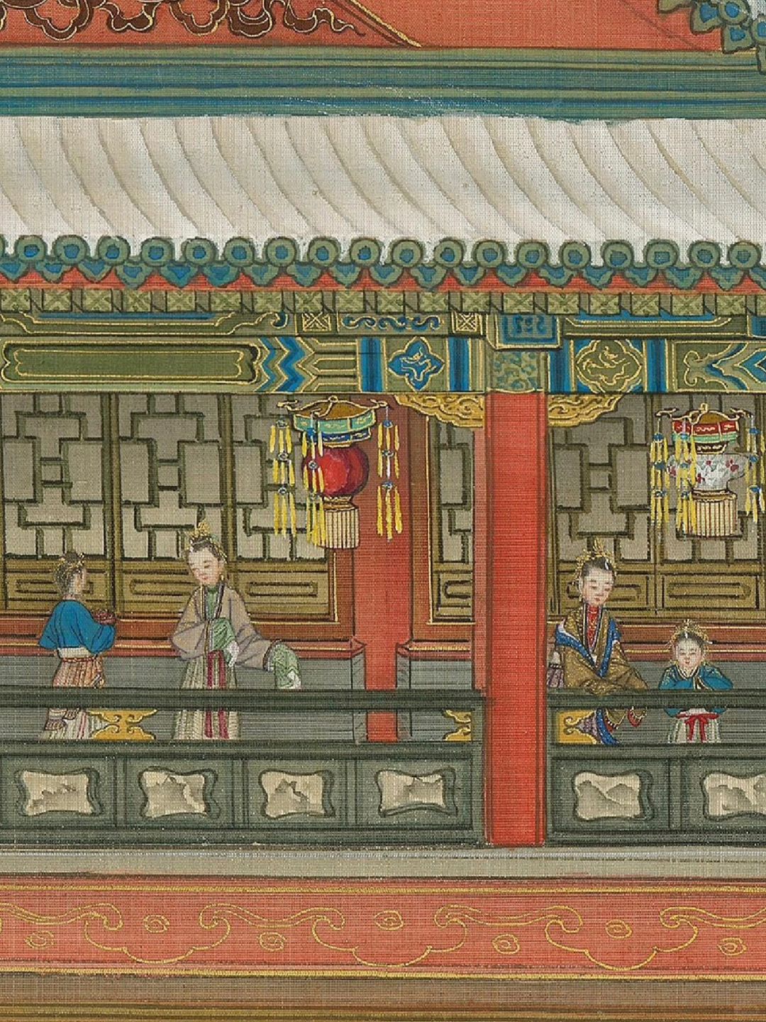 《弘历喜雪图》大概创作于乾隆十年,属于皇家宫廷写实画。作者佚名。画中场景为皇家园林圆明园,背景是山水间皑皑的白雪与错落其间的宫殿建筑。画中乾隆皇帝(弘历)与他的后妃、皇子皇子、公主一起赏雪的情景,反映了皇室后宫的一个侧面,具有浓厚的生活气息。画面渲染出了皇家岁朝喜庆祥和的氛围,展示出乾隆帝作为丈夫、父亲与诸后妃、皇子间浓浓的亲情。