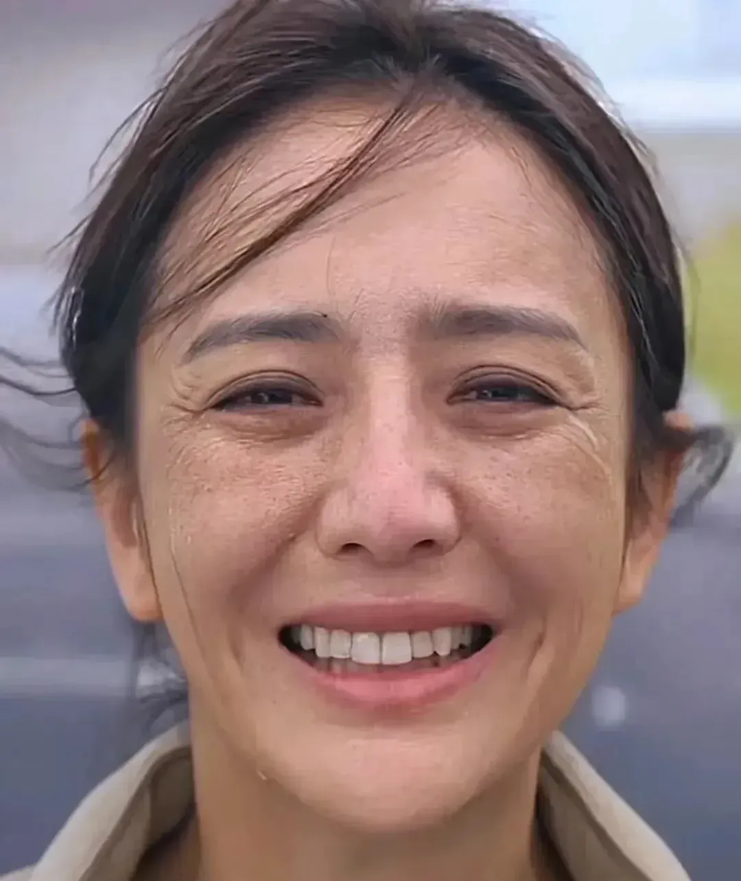 照片中,佟丽娅虽然对着镜头微笑,头发凌乱,眼角布满皱纹和雀斑,没有化妆的她露出一口洁白的牙齿,但双眸有神充满温柔感。