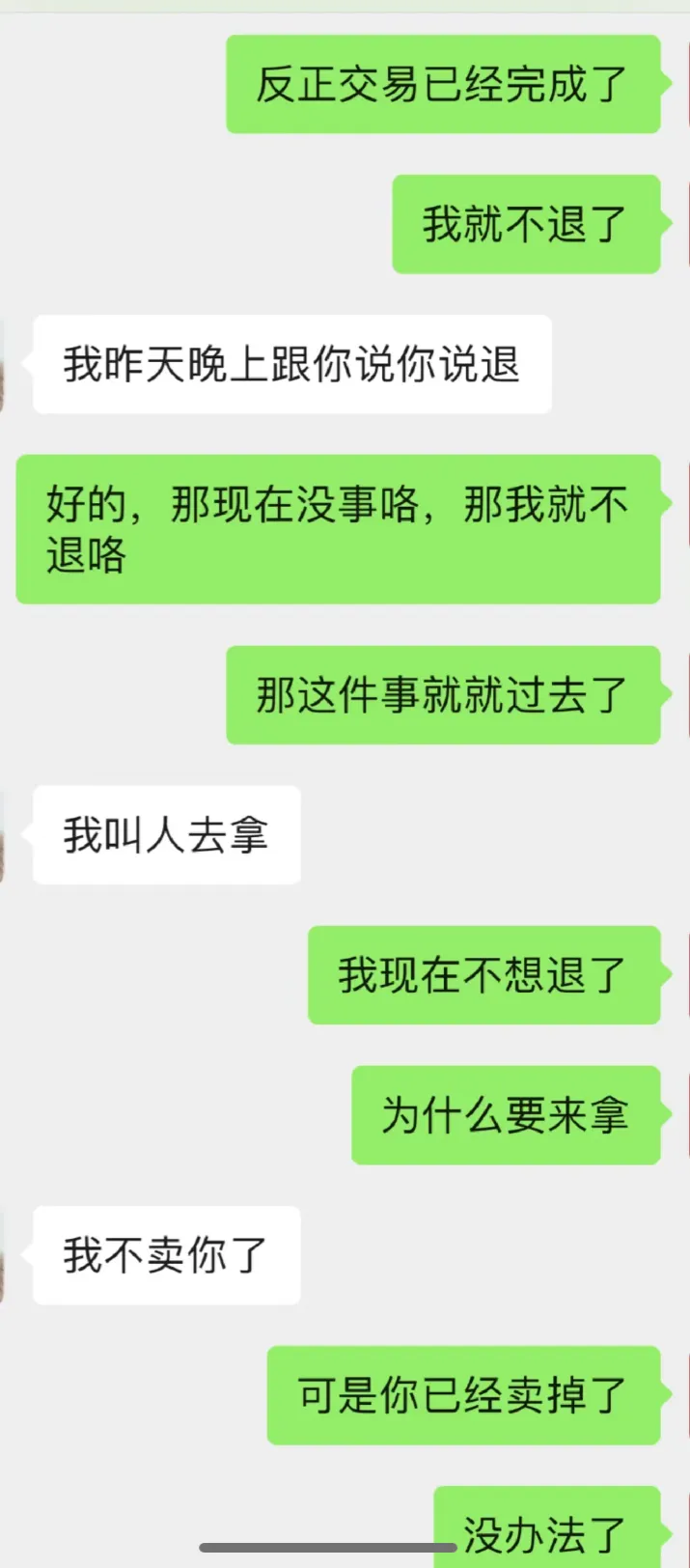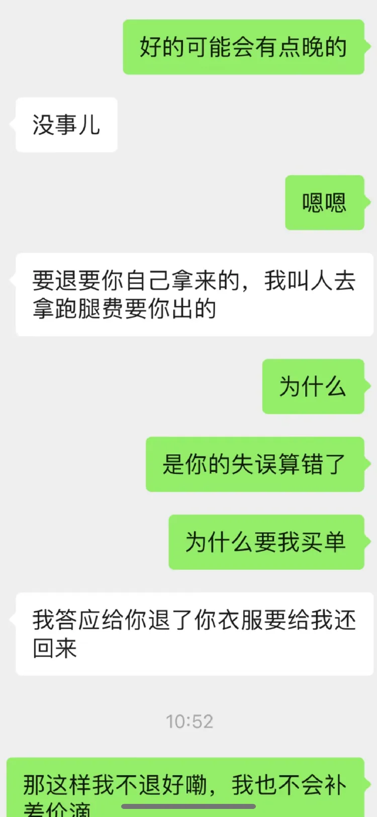 昨天买衣服,老板娘给我报价600多,但经过我一番砍价最后以520元成交,结果我刚到家,她就和我说她算错了!(之前有在网上看到商家故意这样操作为了骗钱)所以我就说,要不我退掉,我不要了,让她过来拿!因为我是走过去买的衣服,不可能再走过去还给她吧? 经过一系列商讨,她最后说他叫闪送,我说好的,结果老板娘和我说运费需要我出!这我就无法理解了,为什么是她的失误却让我买单?难道我衣服没买到还要贴运费吗? 结果她以我提出退款为理由,让我出这个钱,那我就说,我不退了,这笔交易也已经完成了,那这件事就过去了! 然而她可能是觉得自己赚的太少了,就偏要我退,最后经过她一系列操作,我确实很生气,就是不想退了恶心她,可能看我年纪小,她就以报警来吓唬我,可是我真的很不理解他的操作,真的很不理解!大家都评评理为什么她的失误要我买单呢?