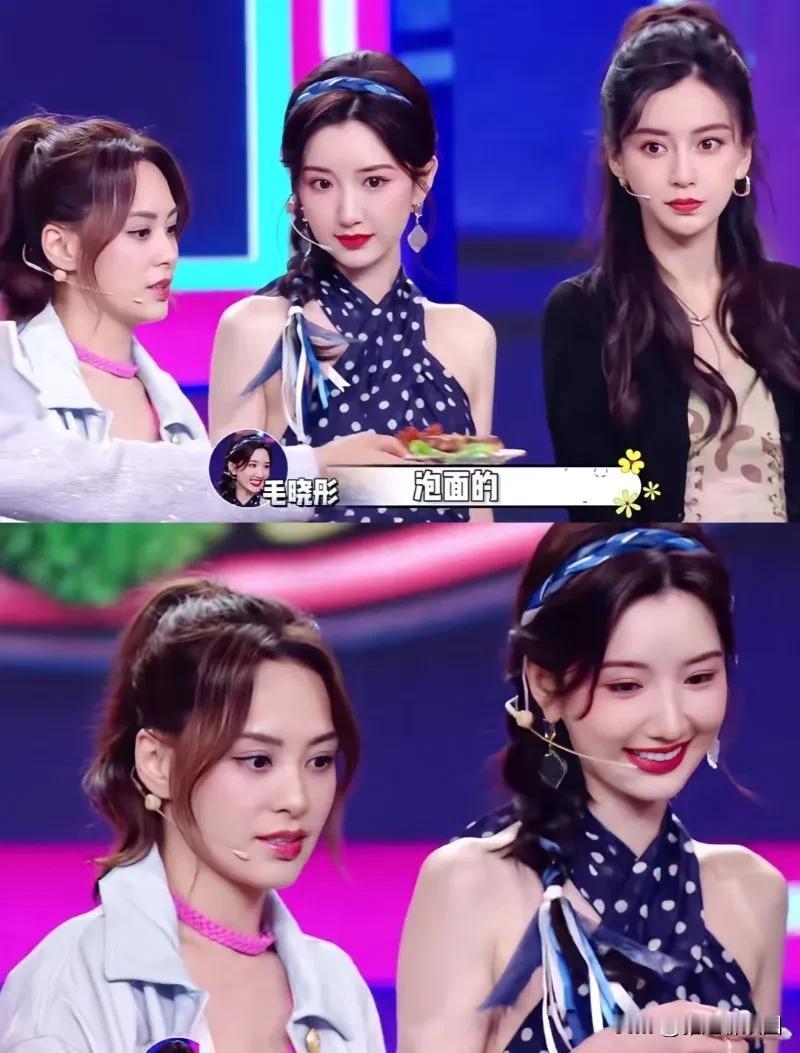 阿娇、毛晓彤、杨颖在某综艺同框,你们觉得谁最美?个人还是最喜欢阿娇,阿娇的脸是毋庸置疑的,就是这造型头发能不能弄好看点,一点氛围感都没有,还拉低了颜值。 气色和饱满真的很重要,明明毛晓彤只是一般般的小美女,另外两位是惊艳的大美女,而这张图片,因为她脸部饱满,面色红润,看起来比另外两位好看。其实按严格来说,阿娇脸蛋最精致,只是这里造型不太好,很明显阿娇的角度不对啊,她离镜头最近,还斜着身子,图片滤镜那么重,有些人就不适合滤镜重,磨的轮廓都看不清了,阿娇骨相好,看生图她肯定更能打。当然这只是个人看法,不代表任何。