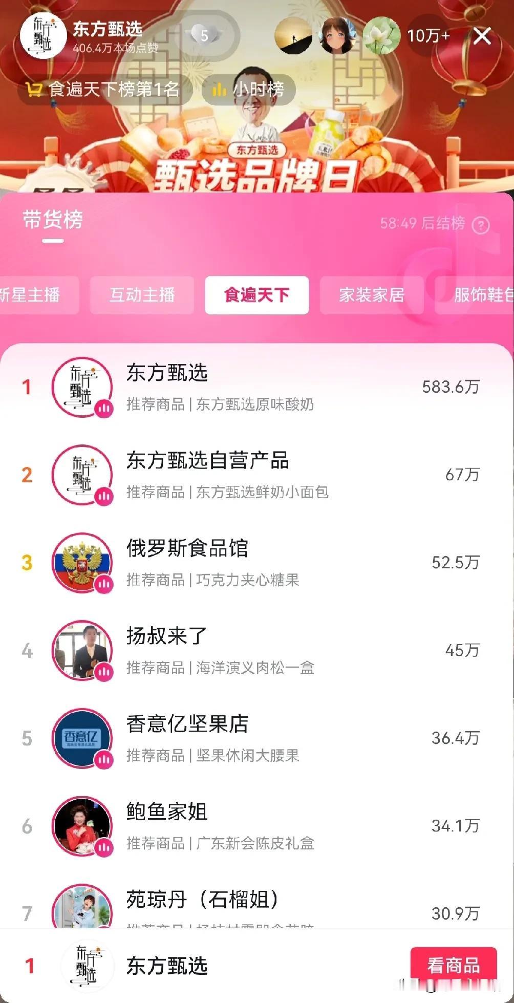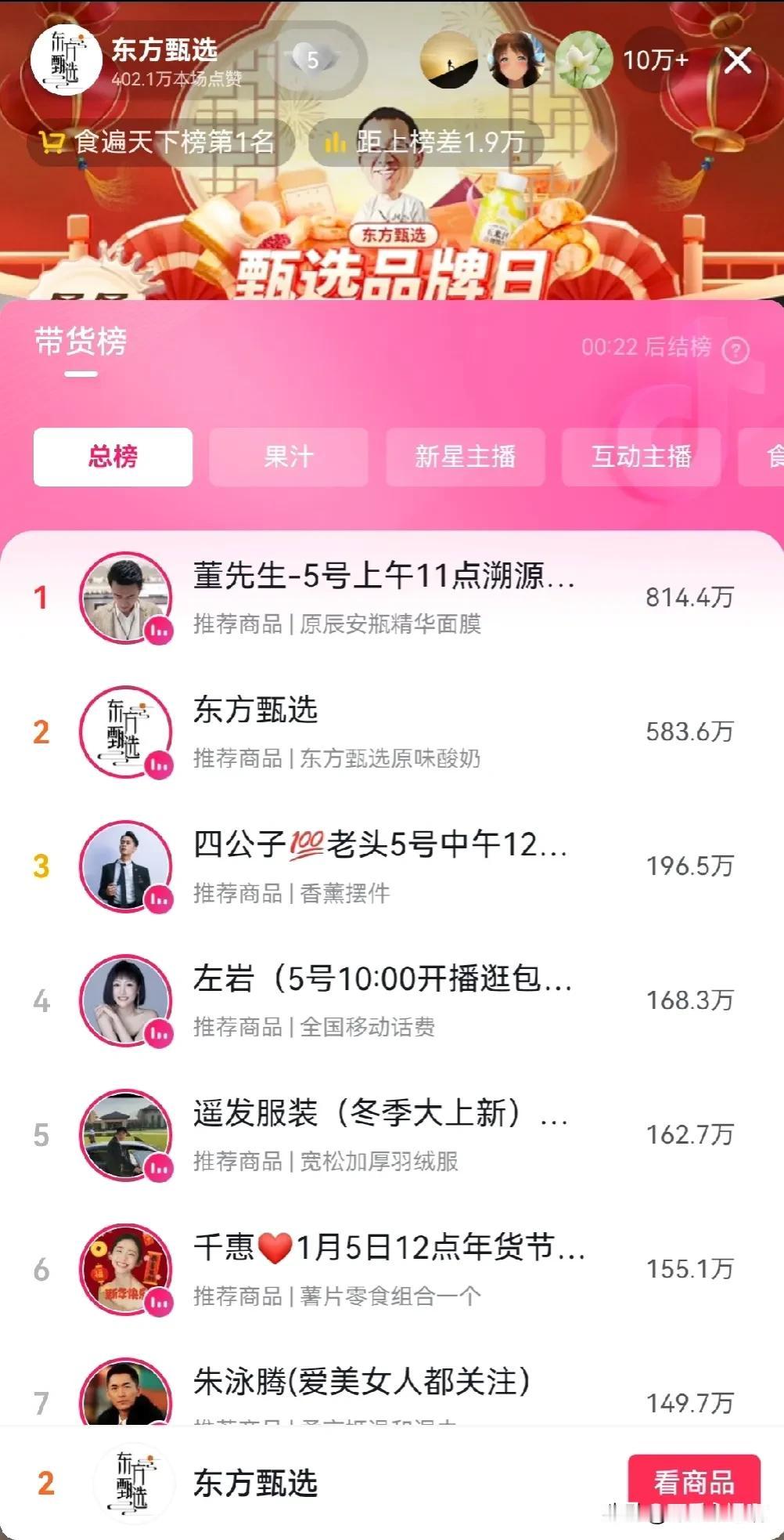 还是董宇辉厉害,把ceo干成了主播,把主播干成了总裁。 中午12:00小孙准时来到东方甄选直播间,直播间人数10万+,评论区,礼物区那是相当热闹,上播一小时销售额583.6万。食播天下第一名,总榜第二名,成绩相当不错。 从蓝莓原浆讲到防御近视,再讲到育儿经,都是侃侃而谈,一看就是上播前做了充分的准备。 #冬日生活打卡季#