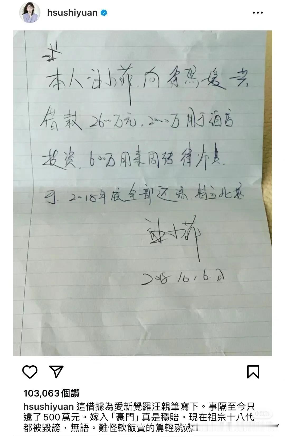 大S完美诠释了不爱一个人什么样子!|||以前在一起说对方长得帅,后来分开了就觉得对方啥也不是,这借条打的,文字可见她是恨透了这个汪小菲,结婚以后没有得到,还失去了2000万,被诋毁祖宗十八代,指责对方是吃自己的软饭。 #娱乐# #大s#