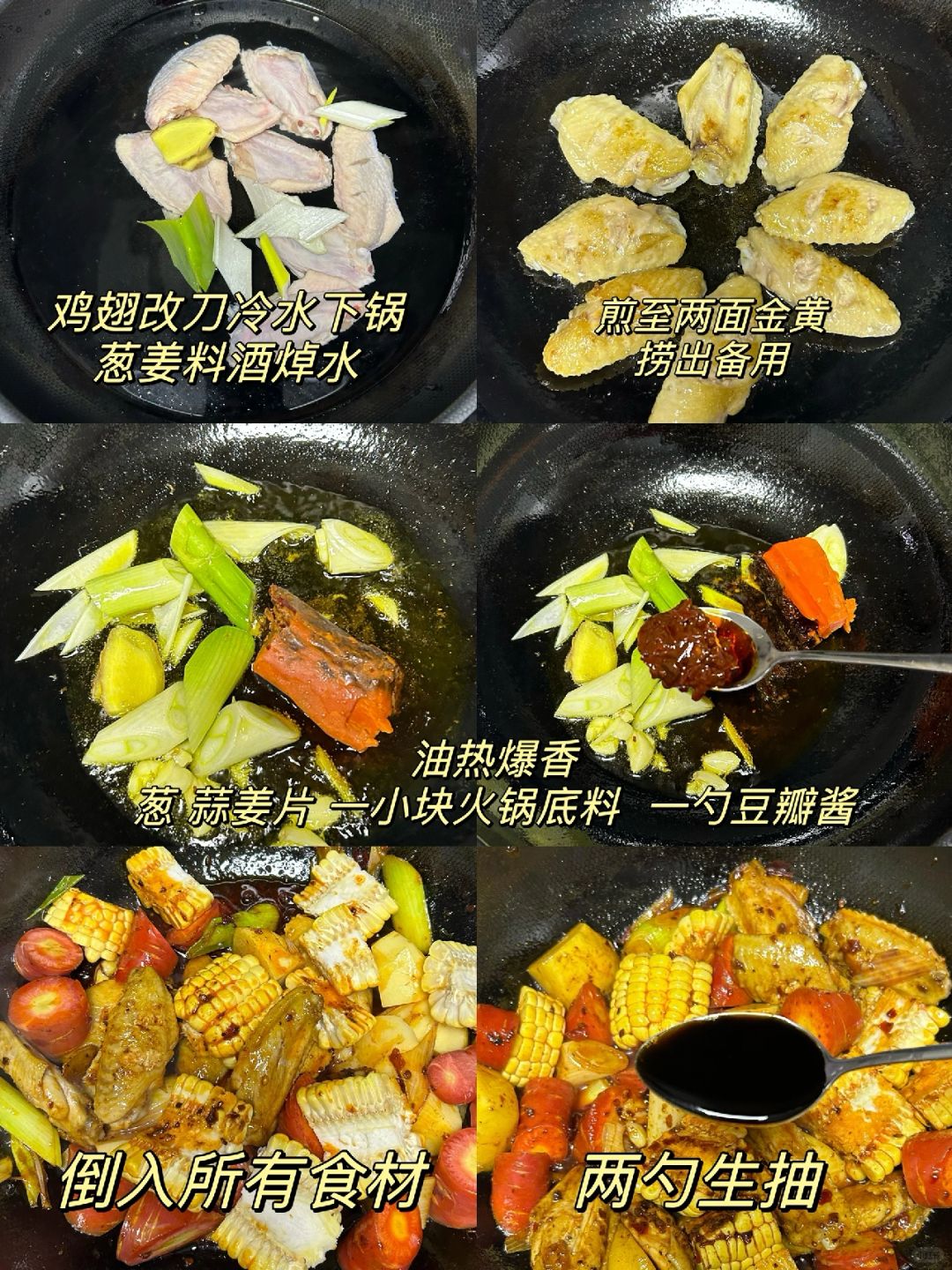 热气腾腾的三餐 想向全世界安利这个鸡翅煲,太香了,香辣过瘾,特别下饭,做法也超级简单一定要试试[偷笑R] ✅准备食材 鸡翅 玉米 土豆 胡萝卜丁 ✅做法:1️⃣鸡翅改刀 冷水下锅葱姜料酒焯水捞出冲洗干净2️⃣玉米土豆 胡萝卜切块 3️⃣鸡翅煎至两面金黄捞出,油热爆香大葱段 姜蒜片 火锅底料一勺豆瓣酱炒出红油。 4️⃣倒入所以食材,放两勺生抽一勺老抽 蚝油 适量盐白糖,加清水中火盖盖煮25分钟最后撒上芝麻即可(中途记得观察水量,不够又加水)
