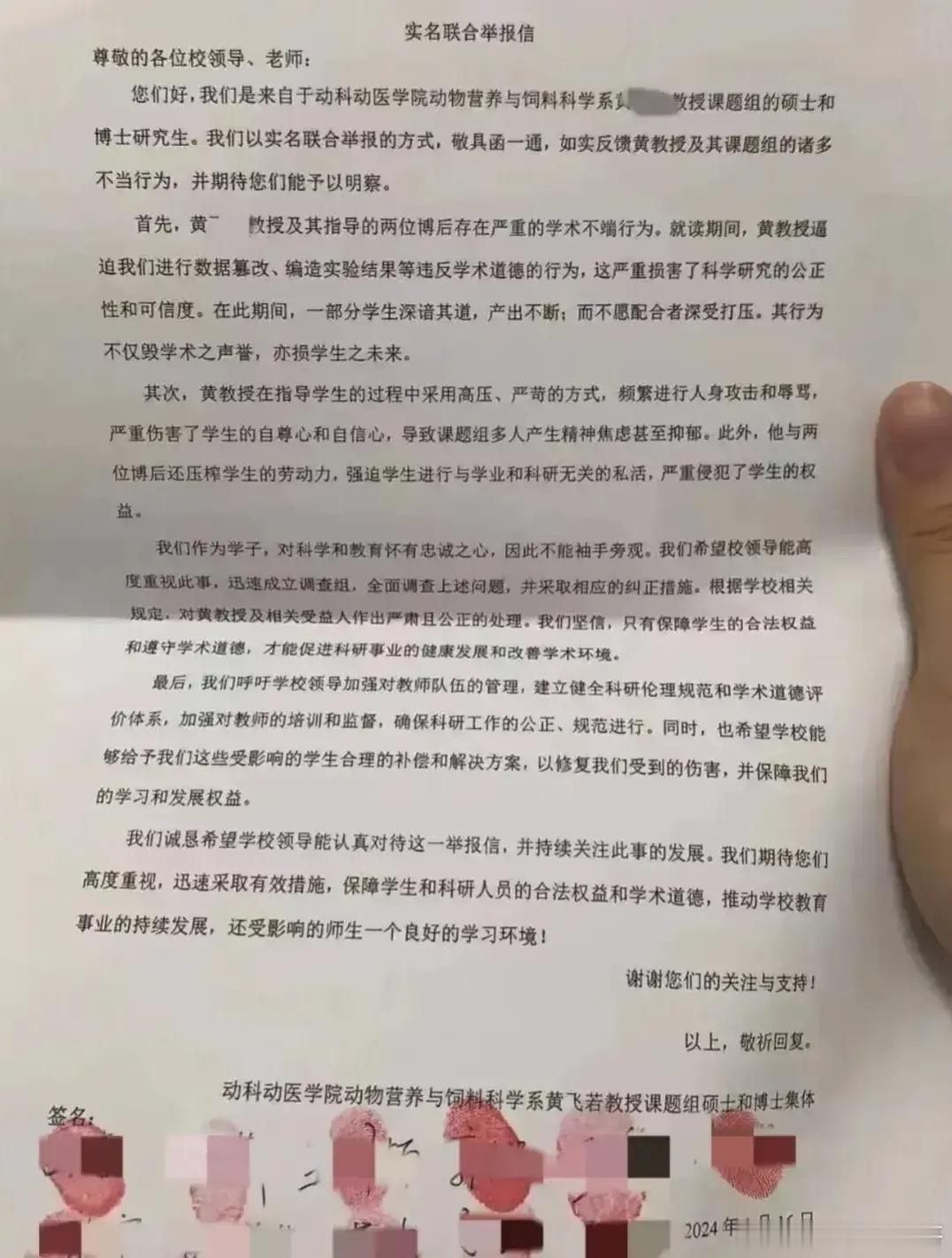 华中农业大学11名学生不畏学阀,联名按手印,举报自己的导师黄某某,这下黄导师可算是摊上事了。