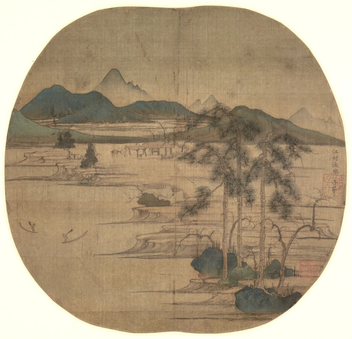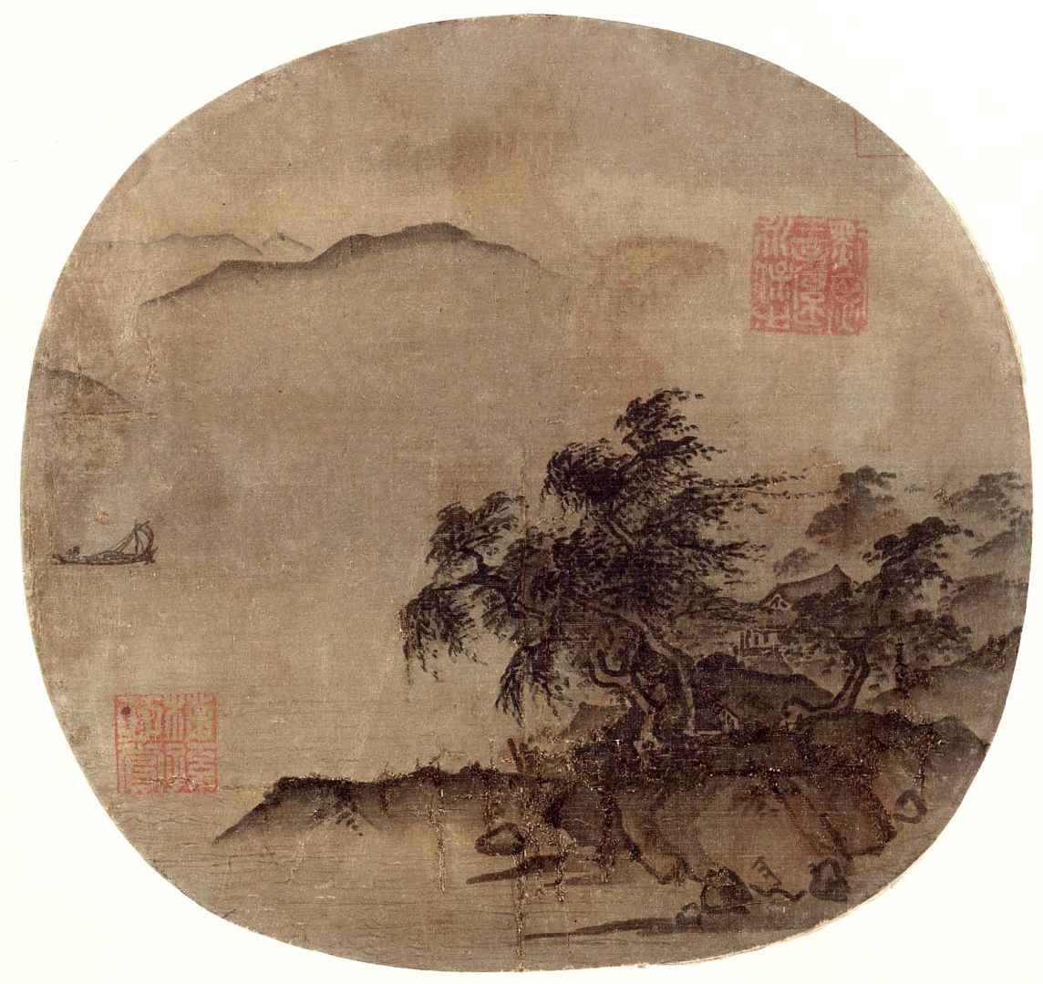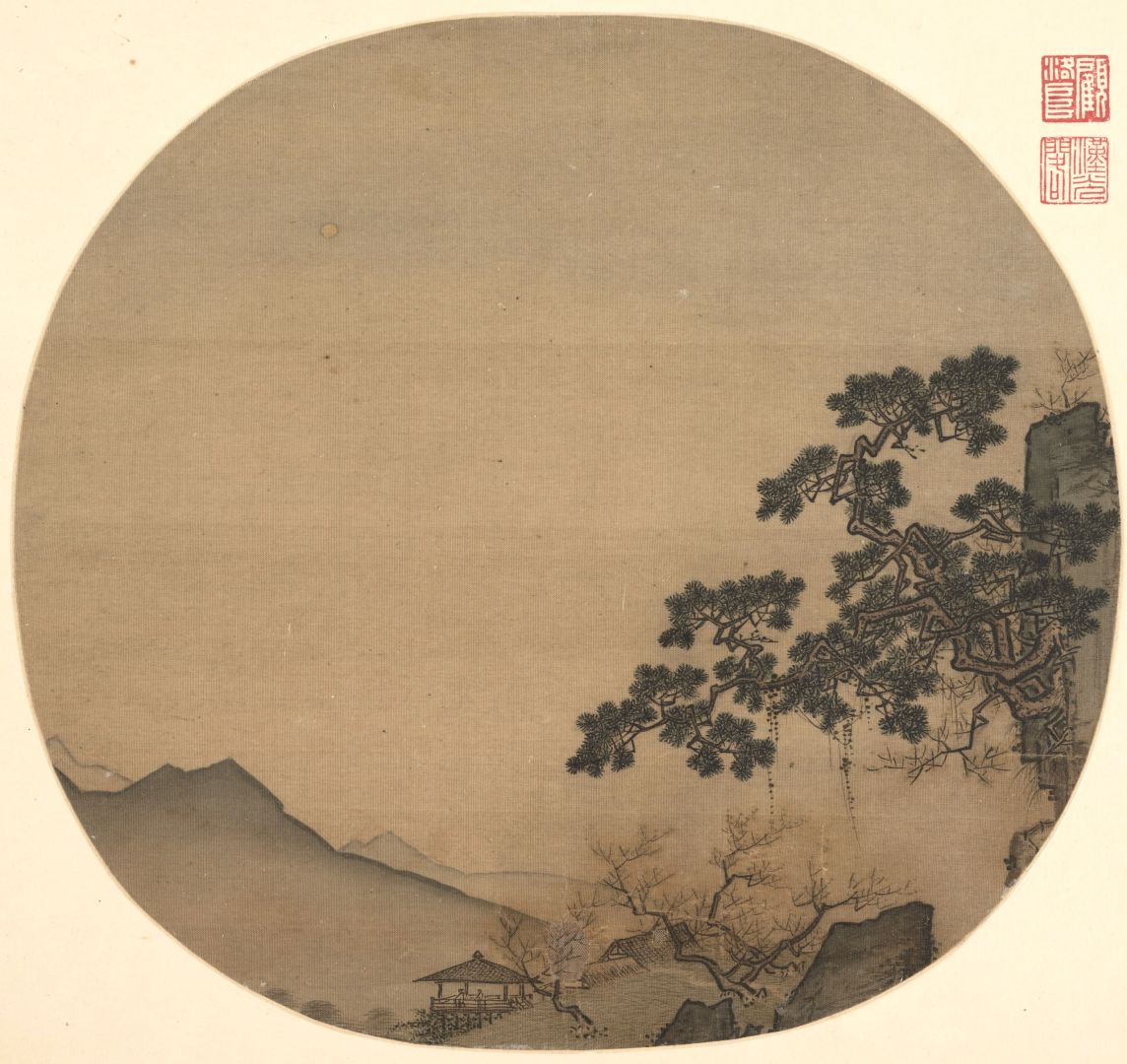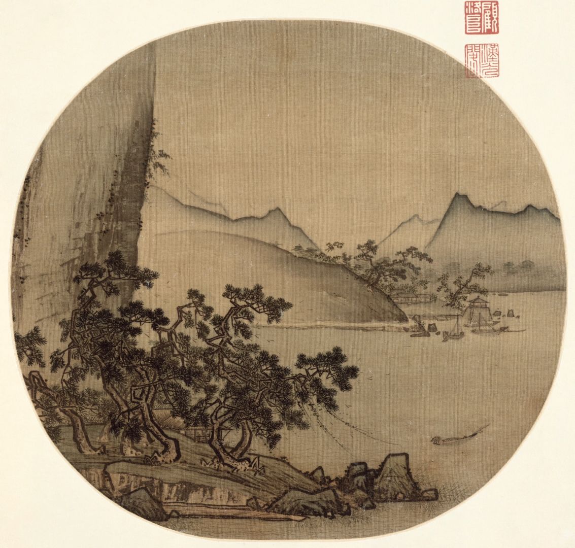 扇画是中国画中的一种独特表现形式。团扇画顾名思义,就是在团扇面上作画。团扇早在汉代宫廷中就有,古代人在扇面上作画,一来托情言志、二来装饰氛围,小小扇面寄情山水,传达出执扇人的某种情怀和隐喻。团扇画及至宋代达到高峰,元明清文人承继其美。在扇面上作画,种类繁多,大到千里江山、山水楼阁、小到宫女高士、花鸟鱼虫,都传达出文人们远离尘世喧嚣,远离官场仕途,寄情山水之间的情怀;画面上,大多呈现留白空旷、广袤无垠的自然意境,寒江独钓、一叶孤舟、远水仙棹、俯仰天地间衬托出人在自然面前的渺小,犹如一粒沙、一滴水,一微尘,如过客来去匆匆。