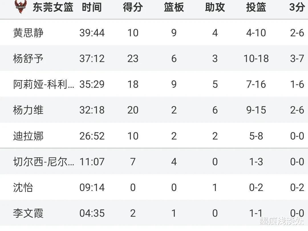反观对手广东东莞女篮,黄思静、科利尔、杨舒予、杨力维等主力多点开花,得分全部上双,最终从客场带走了一场宝贵的胜利。