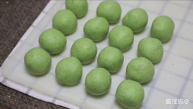 7、制作青团:将面团均分成16小剂子,揉成圆球。制作过程中,保鲜膜覆盖。