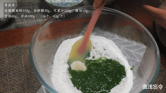 青团皮:水磨糯米粉250g、白砂糖30g、艾草汁250g、猪油15g、澄粉60g、开水100g:(16个,43g/个)