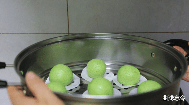 10、蒸青团:开水上锅,青团垫油纸,放入蒸锅,蒸10分钟左右。