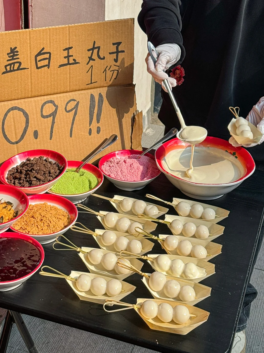 奶盖白玉丸子🍡老板每天现做的!!0.99r💰一串、还有各种不同的撒料可以选择😭😭糯唧唧脑袋真的不会失望!!