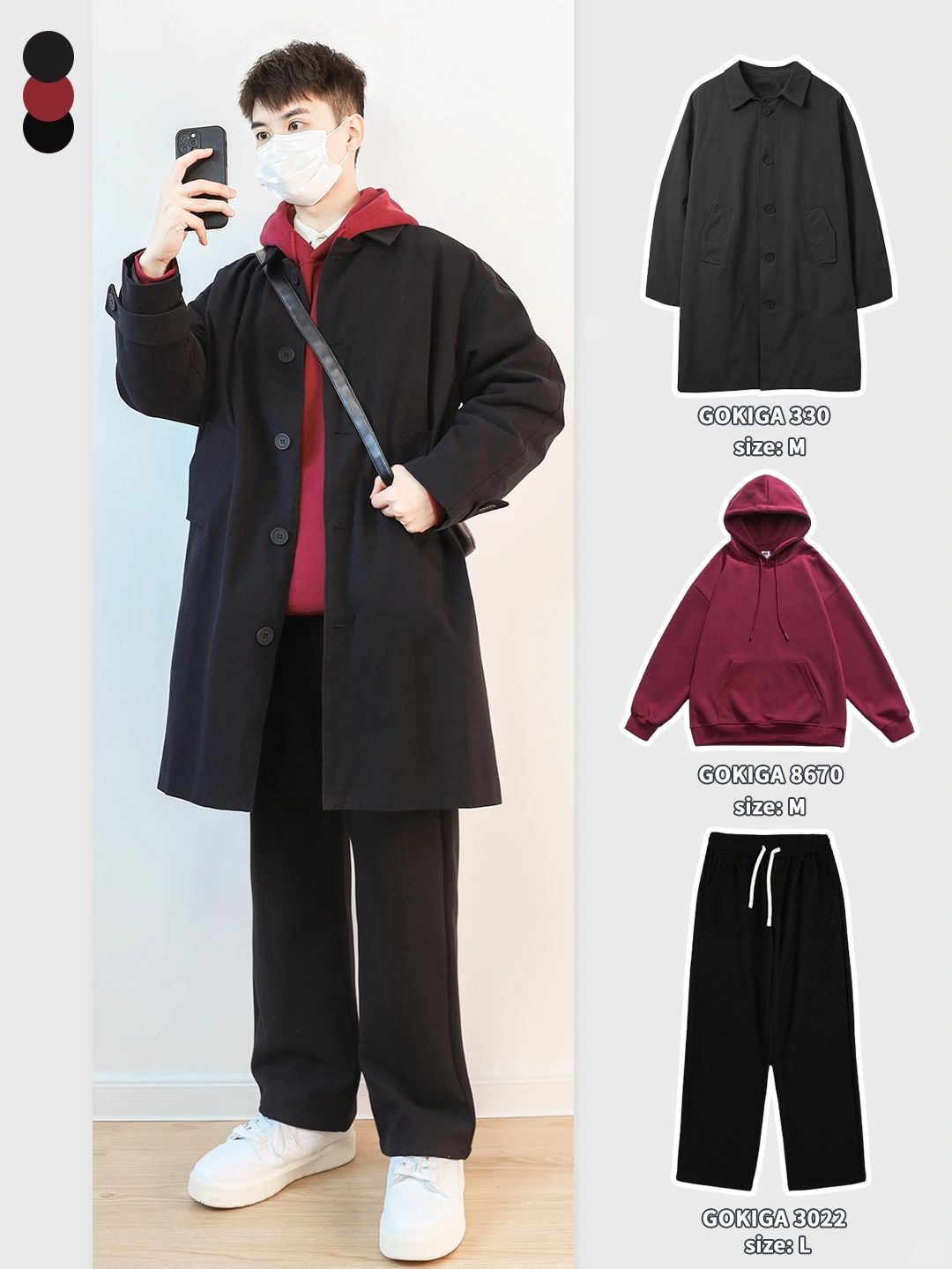 黑色中长款风衣➕红色连帽卫衣➕黑色休闲裤