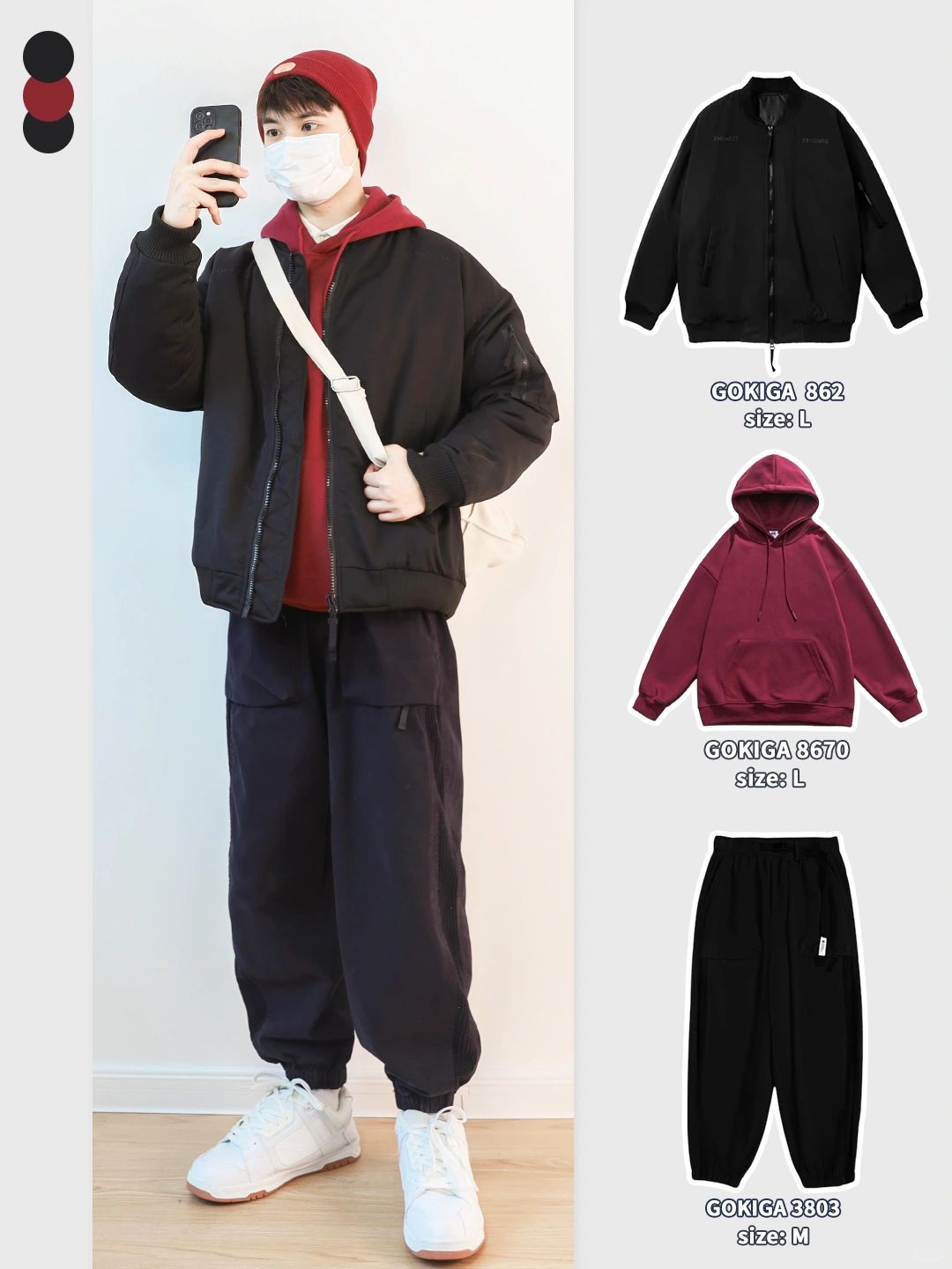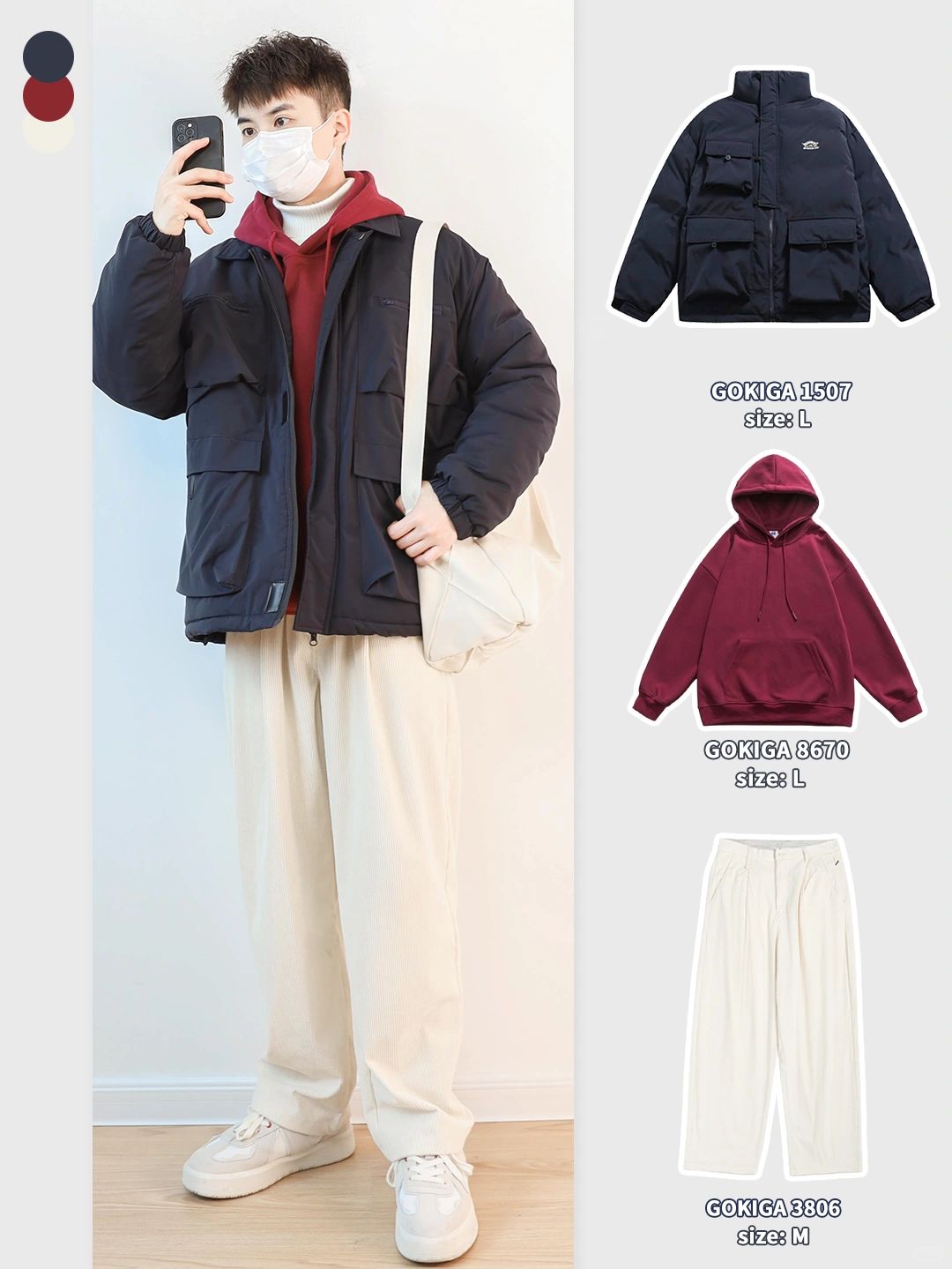 蓝色工装棉服➕红色连帽卫衣➕米白色休闲裤