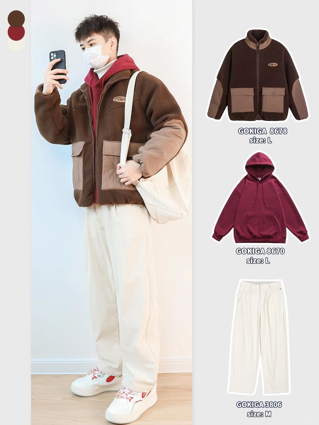 棕色摇粒绒外套➕红色连帽卫衣➕米白色休闲裤