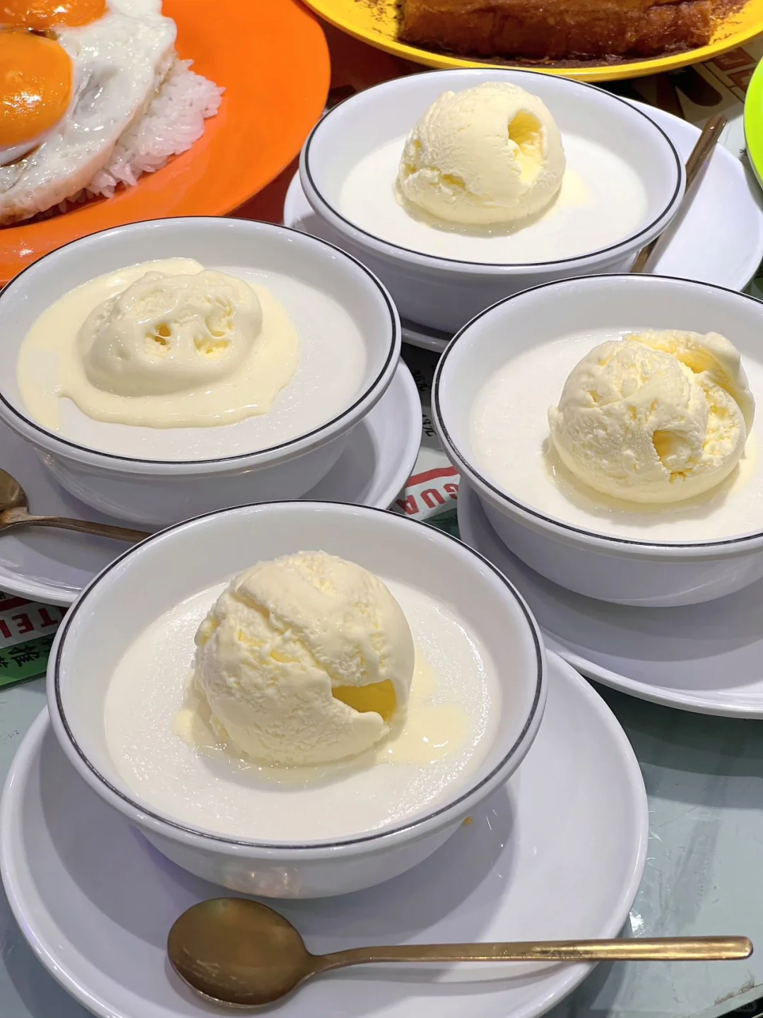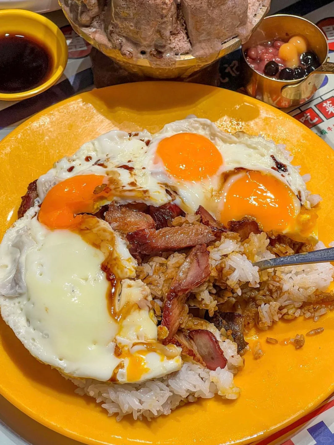 1. 牛乳绵绵冰 2.抹茶芝士豆腐 3.法式布丁包 4.黄油柿饼 5. 三眼仔太阳叉烧饭 6.冰淇淋双皮奶 7. 漏奶华