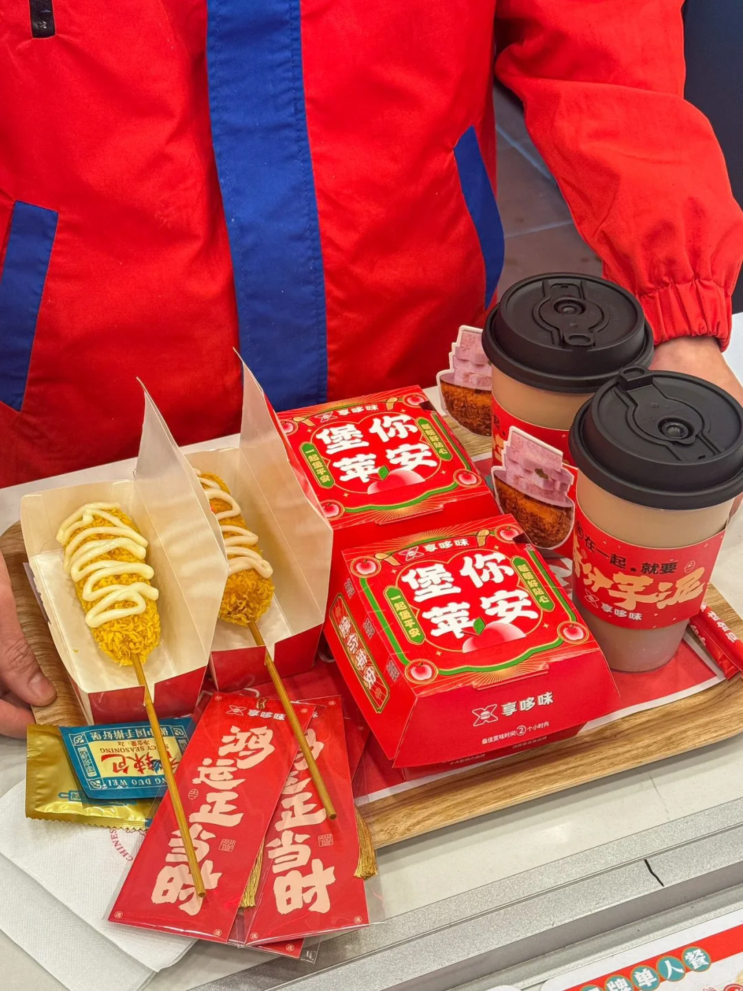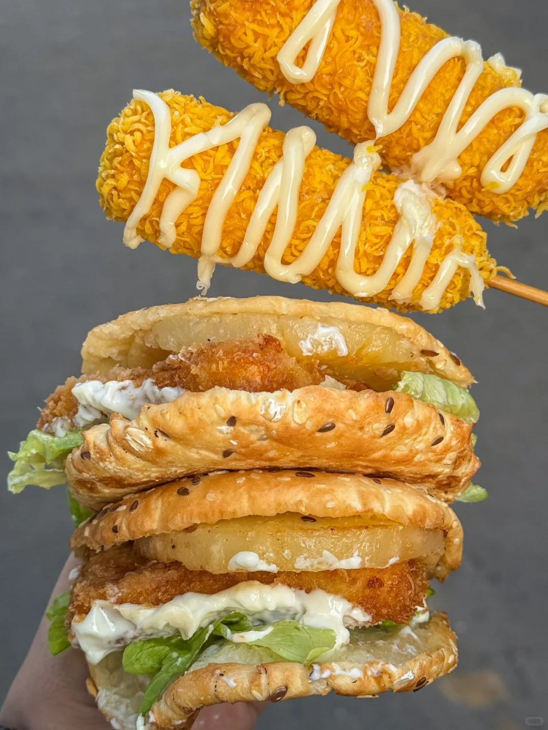 最近上新套餐了!流心吉士虾排中国汉堡🍔十芝芝高升热狗棒+满分芋泥奶茶🥤流心吉士虾排,Q弹厚实的虾排吃到嘴里好满足😭浓厚的芝士香气,搭配了一整块菠萝🍍口感很丰富,吃进嘴里直呼:好吃又不腻!还有热狗棒🌭趁热吃会拉丝!!真的好好吃啊!!