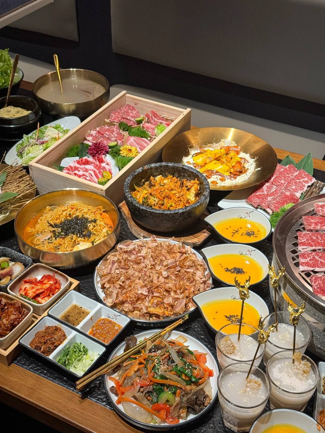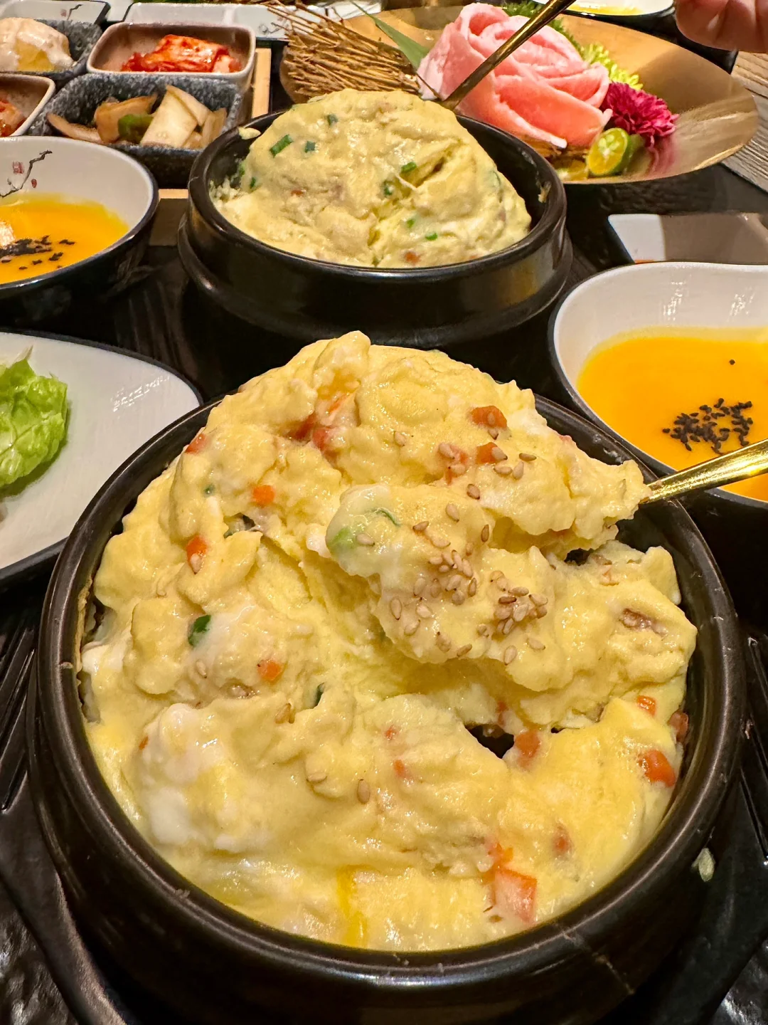 海鲜奶油芝士烤年糕、鸡蛋羹、木鱼花海鲜饼、杂菜炒粉丝、蜂巢米酒…该怎么形容这家烤肉店有多香😭😭 回头客巨巨巨多!!种草这家店(两班宅)好久了!特意早早就预约来吃!吃过长沙n家韩式烤肉店了,只有这里的让人惊艳住了,喜欢这口的真的要去试试啊啊,不会失望😭… 烤肉全程都有服务员帮忙烤,品质也高,无论是雪花黑猪猪五花还是和牛横膈膜都没踩雷欸,吃的很满意!!搭配了生葱很好的激发了烤肉的味道!非常nice!他们家特别适合食肉星人,肉的份量真的好扎实… 还有很多小料和南瓜羹都好好吃🤤还能无限续!强推啊啊啊…