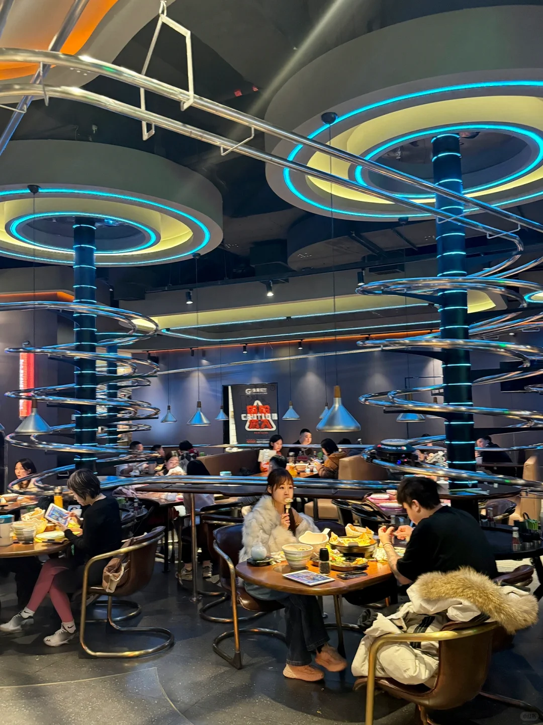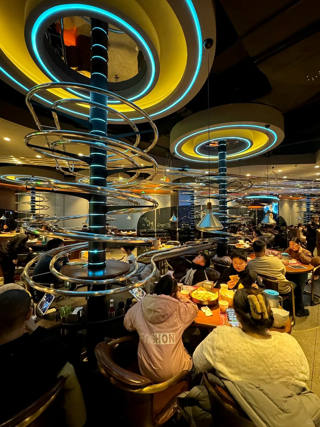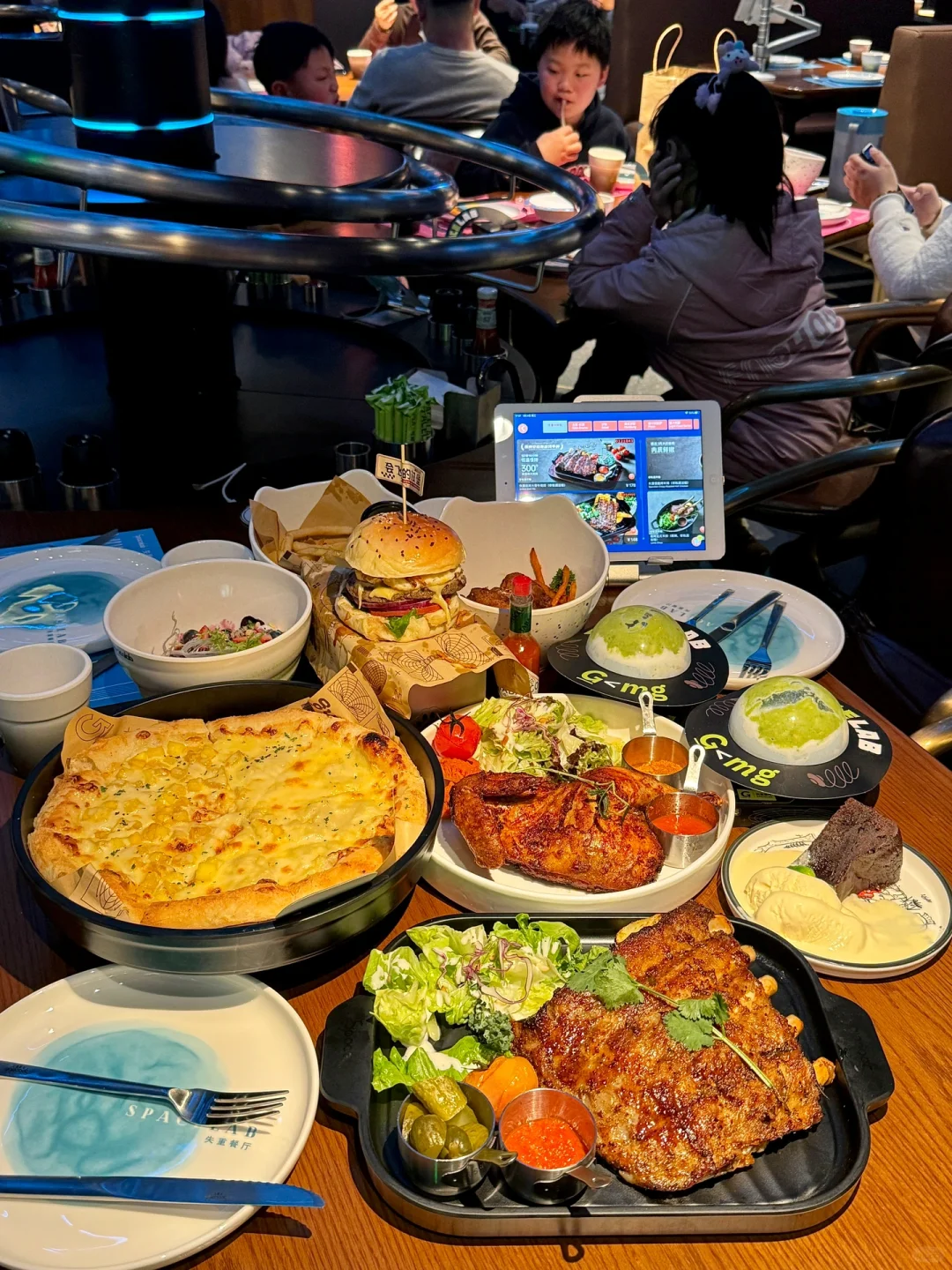 德思勤新开的失重餐厅!!太有意思了!! 怪不得能🔥遍北上广啊…仿佛来到未来世界🌍整个餐厅科技氛围感十足!!送餐都是机器人🤖+UFO轨道环绕,仿佛飞碟🛸一样旋转下来太哇塞了!! 菜品也好吃、点了满满一桌都没踩雷:伊比利亚烤黑猪肋排巨巨巨香~食肉星人强推!!还有:失重香酥烤半鸡、榴莲芒果双拼披萨、甜香鸡翅配红薯条、流浪地球酸奶昔…亲测每道都精致好吃😋! 总而言之,真的很适合带小朋友或者约会!!