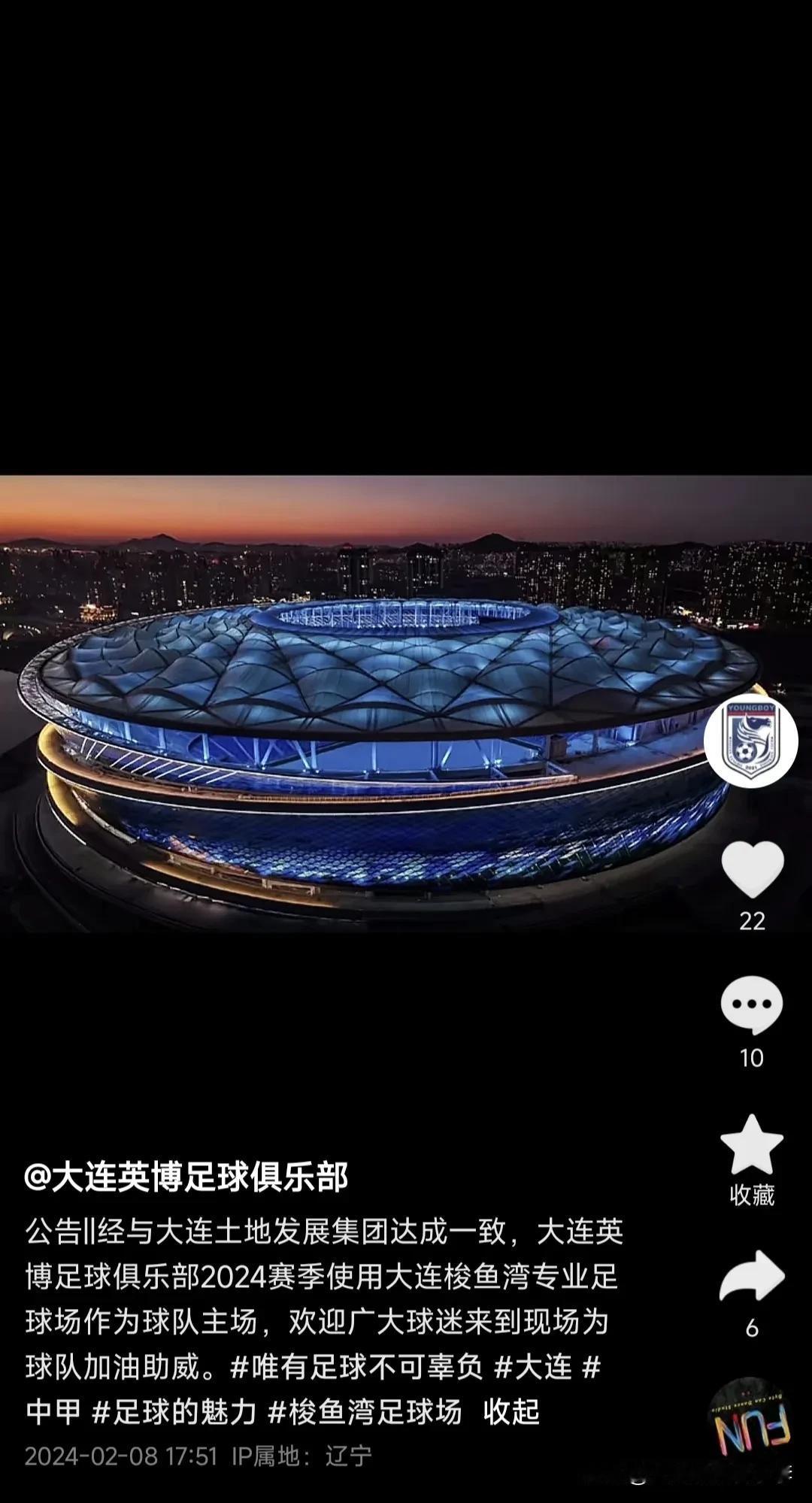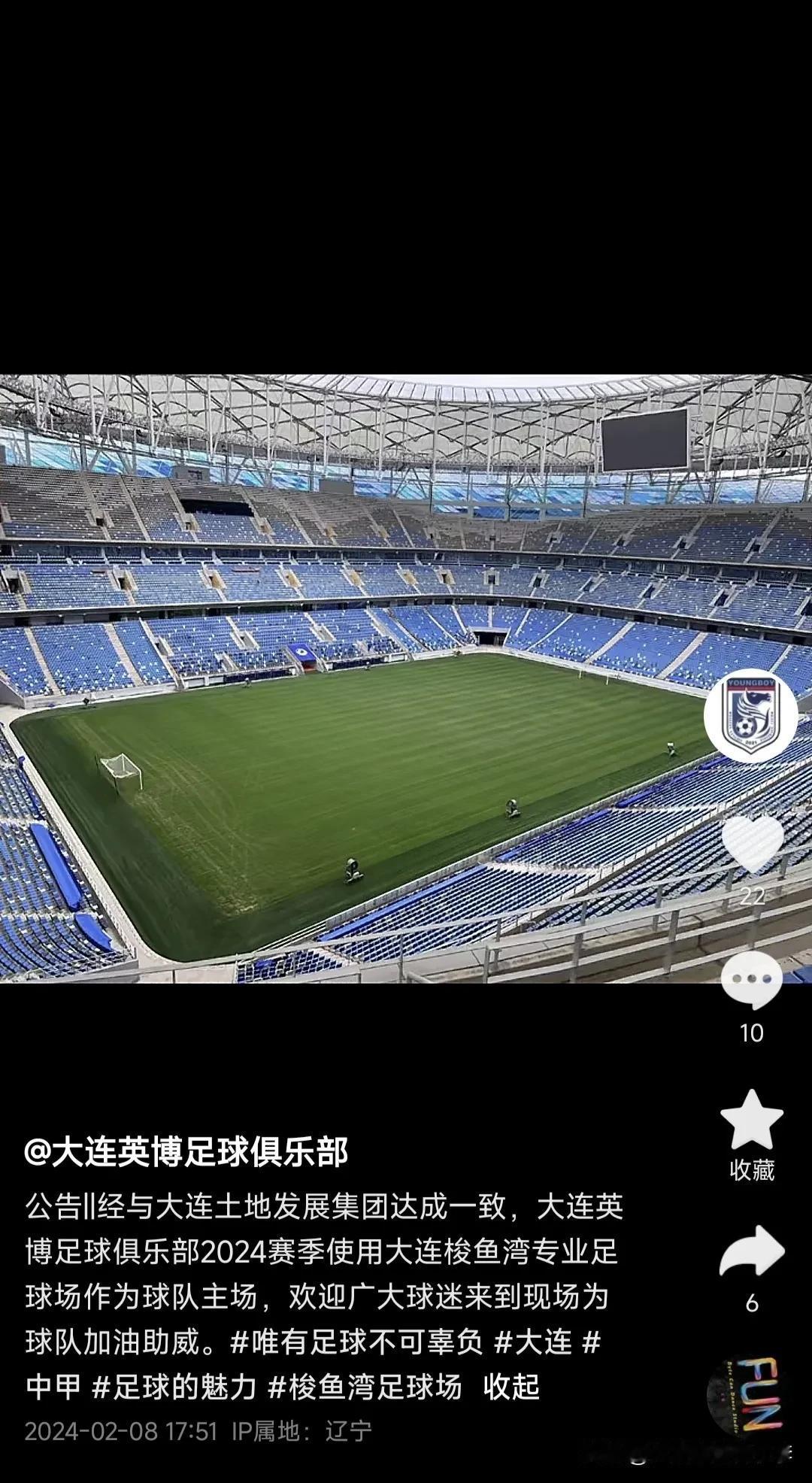 大连英博足球俱乐部官宣:2024中甲联赛大连英博队的主场为大连市梭鱼湾足球场。 今年又可以在梭鱼湾看球了,虽然是中甲但大连球迷要多支持家乡的球队,去梭鱼湾喊起来燥起来! 还有一个月的时间新赛季的中甲联赛就开打了,有些期待!