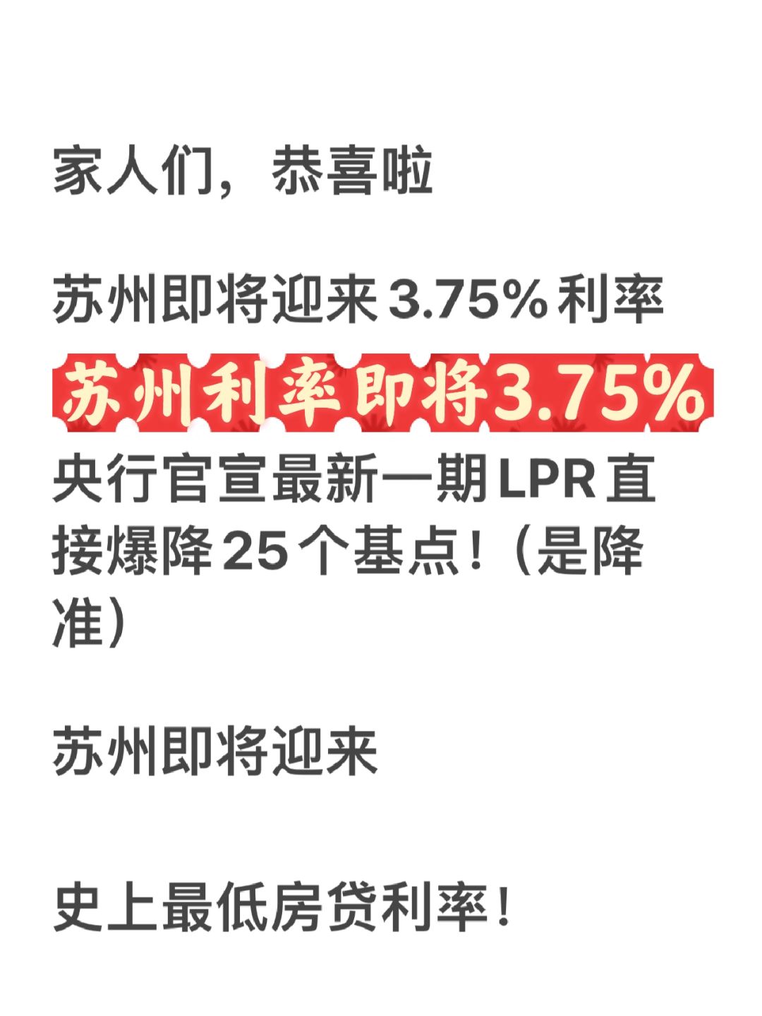 刚刚央行官宣最新一期LPR直接爆降25个基点 苏州即将迎来史上最低房贷利率! 大家一起降,降,降 开心吗