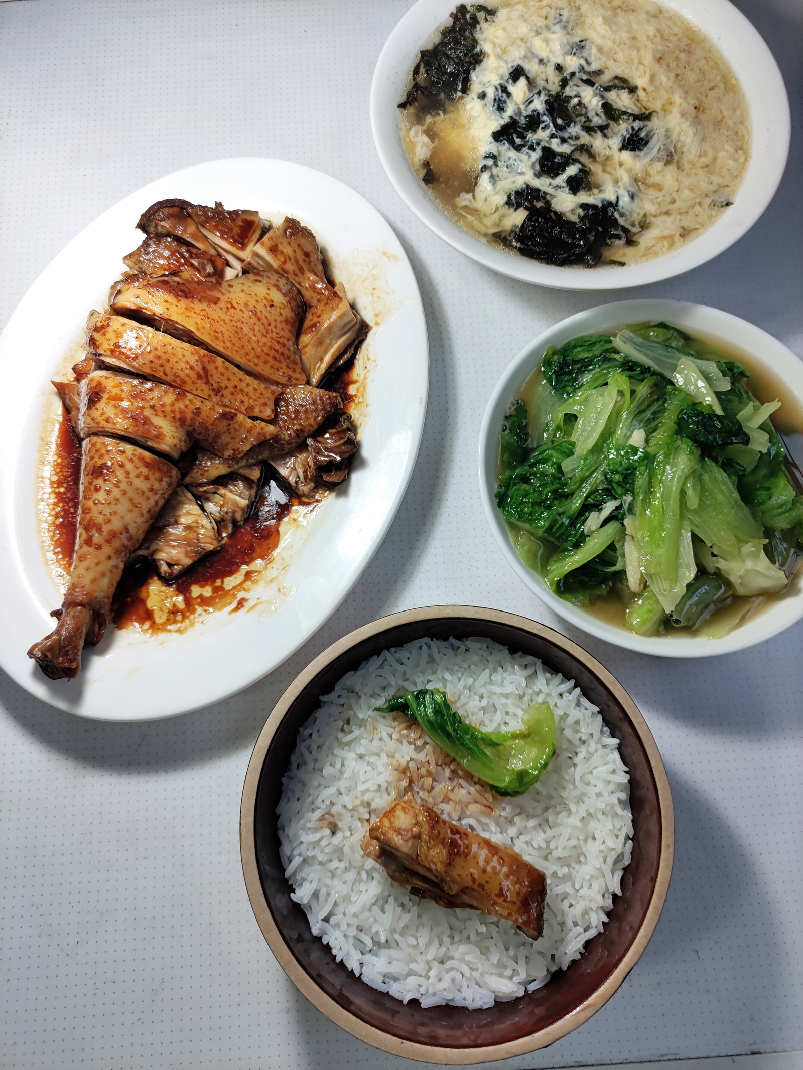 晚餐,豉油鸡,炒生菜,紫菜蛋花汤,米饭。今年只带了一只鸡,过年的余韵到此结束。又