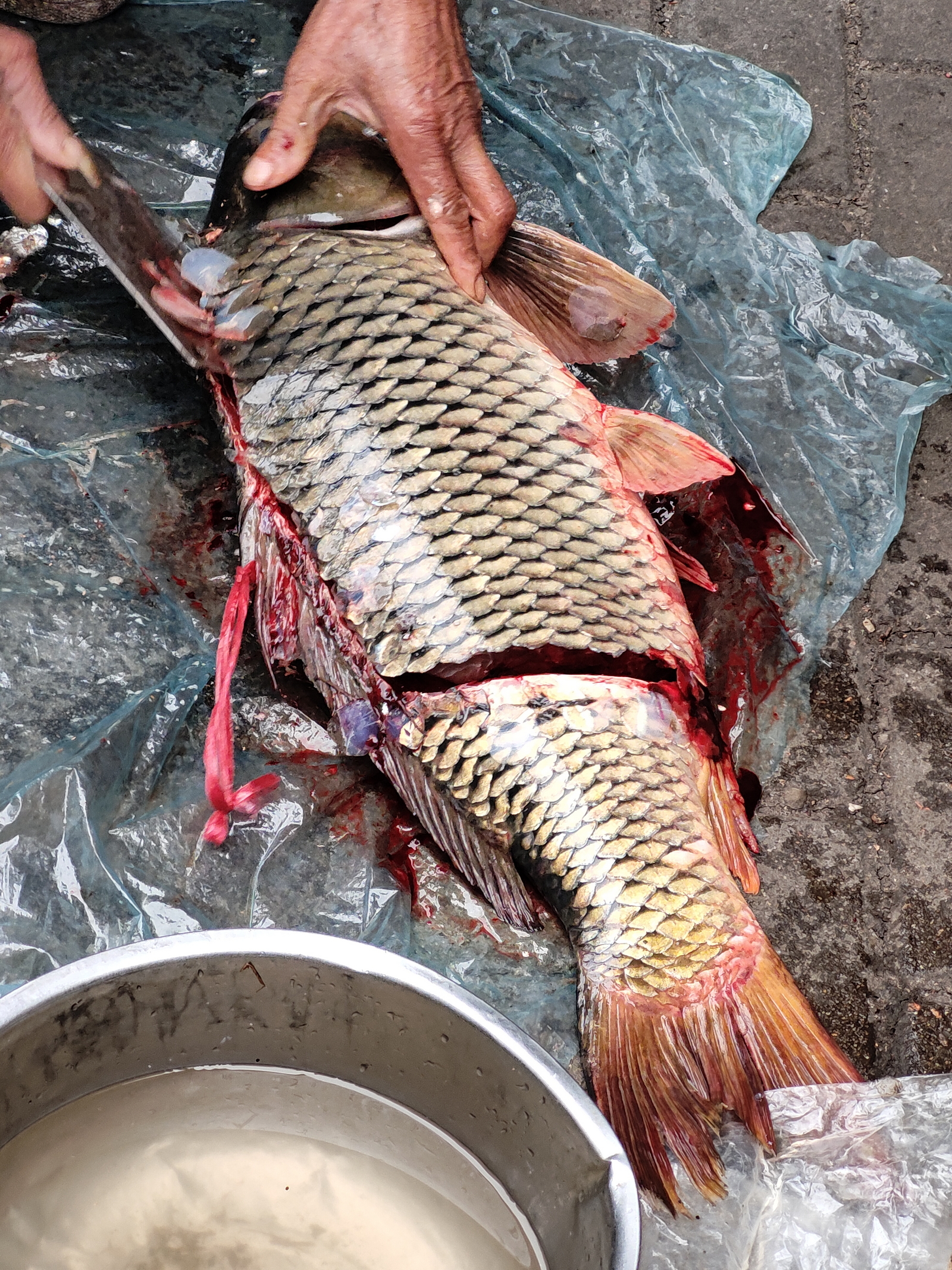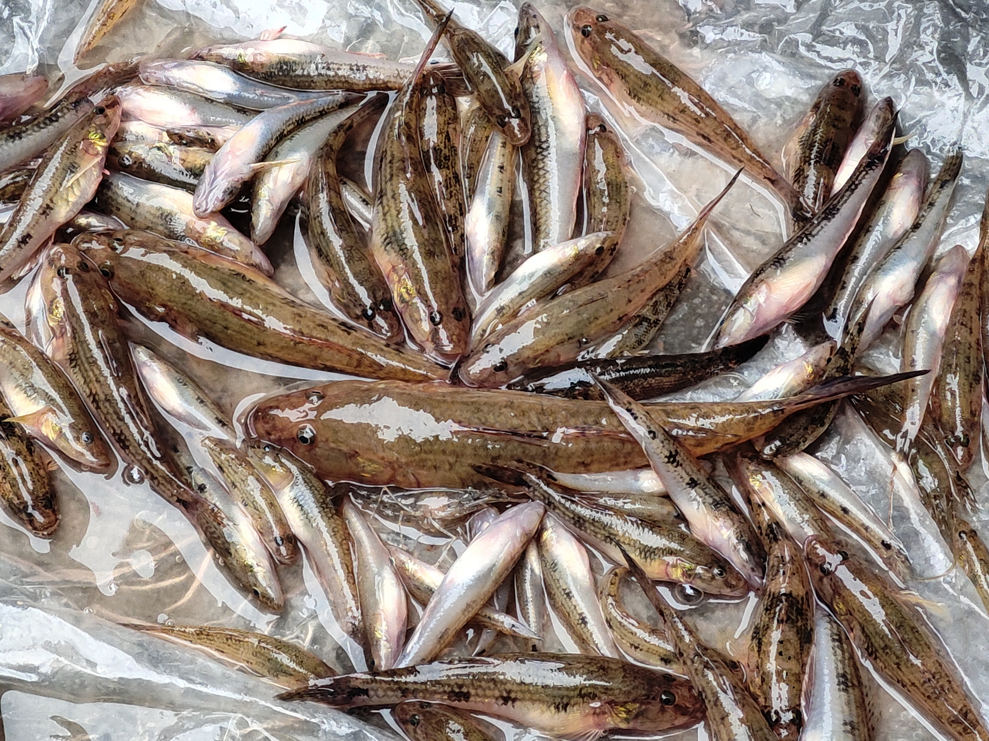 广州海珠区细岗早市,野生鱼档。最引人注目是大河鲤鱼,无人感兴趣问价,大约5元一斤吧。鳊鱼是15元,最多人买。有条网笼大黄鳝不错,可惜死了,开价15,活的老板说要30,野生30算便宜。野生笋壳(舌虾虎,也有小塘鳢)鱼60一斤,贵了,除了那两条大的接近,其他太小不值。还有水鱼60一斤(可能养殖)、估计是养殖的虎纹蛙、还有小个的野生毛蟹。#广州#