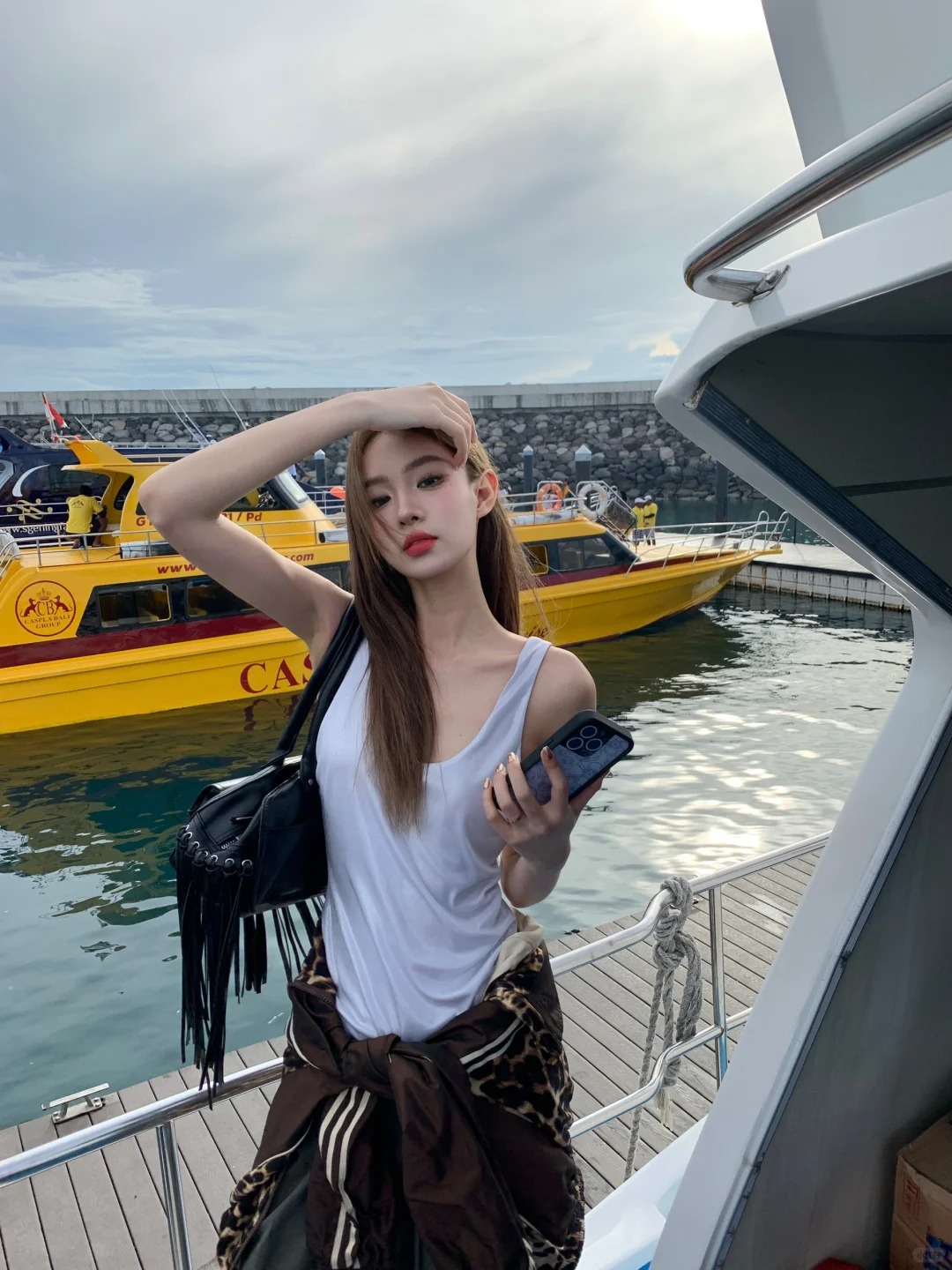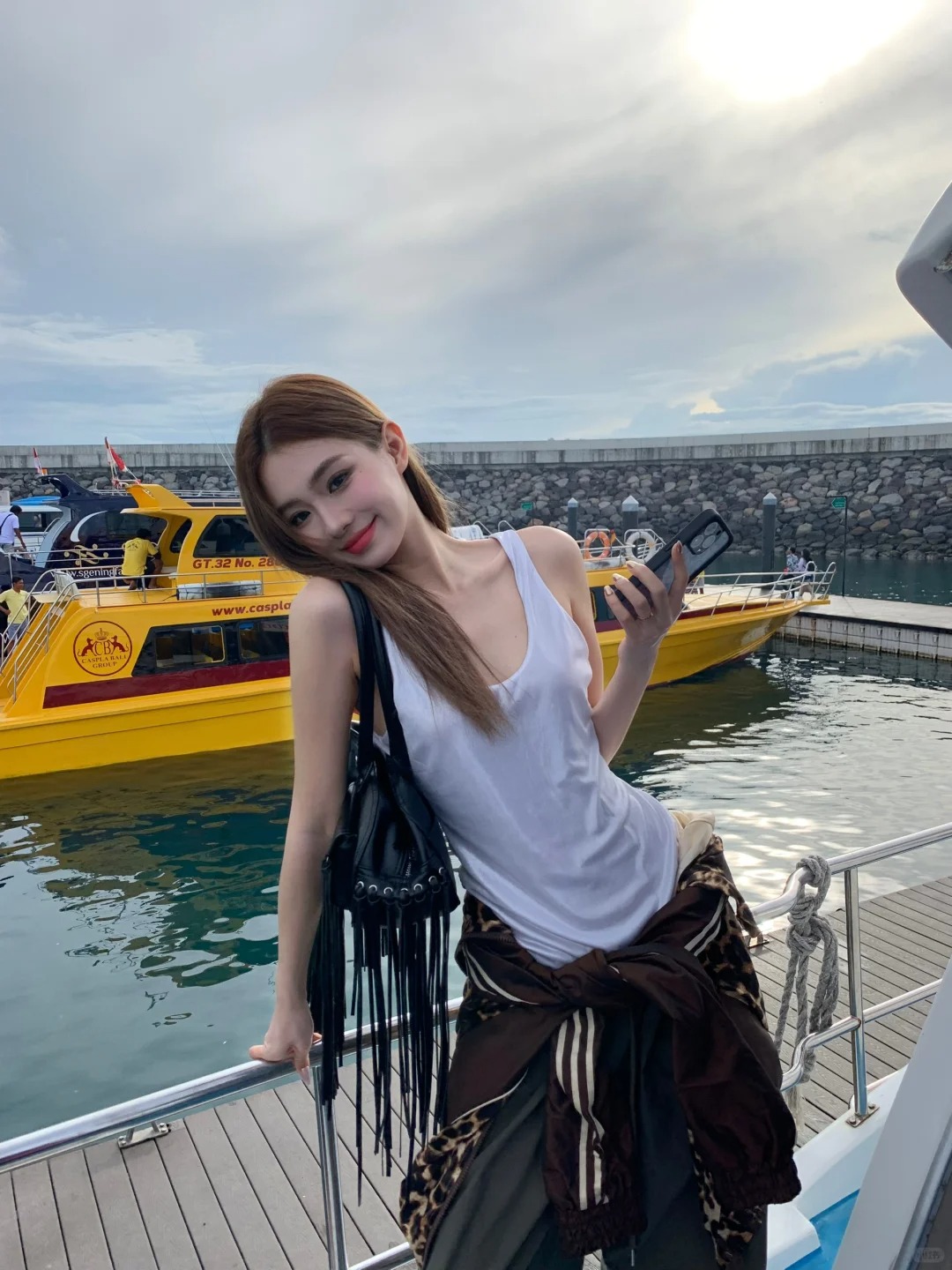 去佩妮达的船上 小黄轮船意外的出片 和国内不一样 船上没有管理员 可以随意躺在甲板上 要注意安全哦 这套豹纹look我太喜欢了 焊死在身上