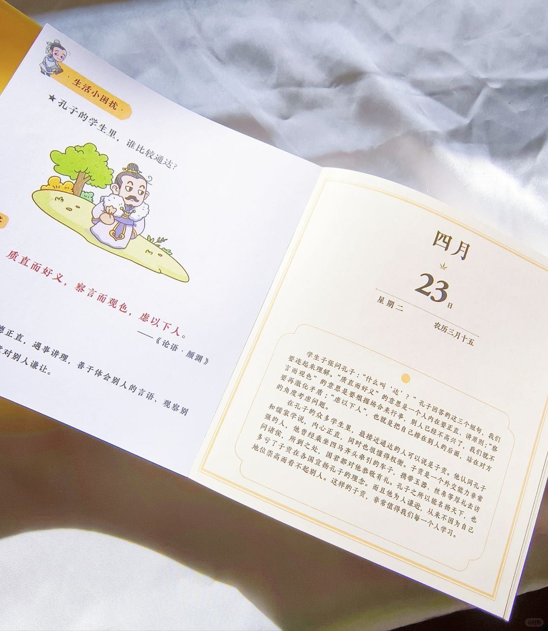 《青少年漫画国学》 ~ 人民邮电出版社 ~ 这是一本日历与国学知识于一体,每天一个国学典故,用漫画的形式呈现出来,对于孩子了解国学,学习国学很有好处! ~ 比如:孔子的学生里,谁比较通达? 日常生活中怎么处理自己的情绪? 中秋的由来,古人是怎么过中秋的?等等系列问题,让孩子每天学习一点小知识,日积月累就会学到很多国学知识,而且以漫画的形式,孩子也不会觉的枯燥无味! ~ 我把这本日历作为中秋礼物送给了妹妹,她非常喜欢拽着我看了一下午呢!