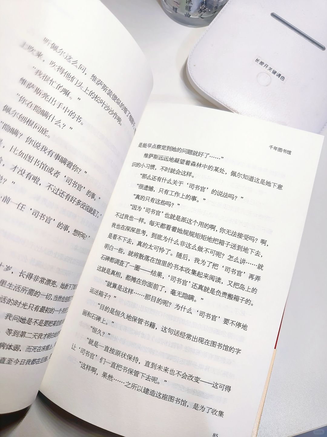 全书一共五个故事,分别为来自回首谷的呼唤、千年图书馆、今夜的月亮是一丝一缕的吗?末日的玻璃瓶、献给倒悬少女的钢琴奏鸣曲。每一个故事都有他的温柔也同时拥有他的反转与惊吓。是从一座山谷回来时一定不要回头,不然灵魂就会留在那里的惊悚。也是外星人入侵地球,月亮变成了唱片的奇怪脑洞。或是一个玻璃瓶能预言人们的埋葬方式。还是一首禁止弹奏的钢琴曲呢?在这其中我最喜欢的是千年图书馆。村子里选一名司书馆献给这座前年图书馆。佩尔最为这一次被选者遇到了上一次的司书馆,她们神秘的故事以一个符号结束,故事的后续该是如何呢?让人联想不断!