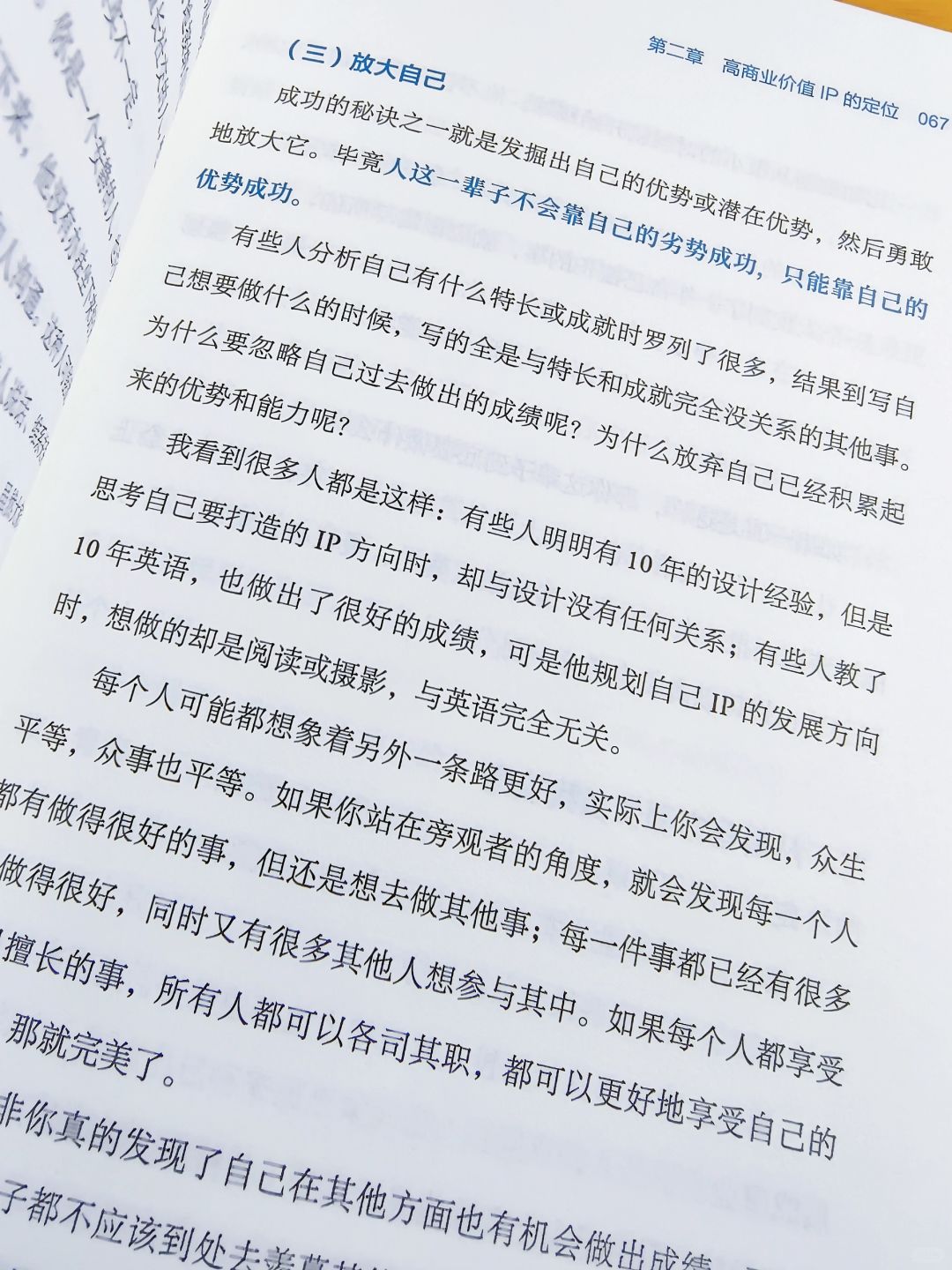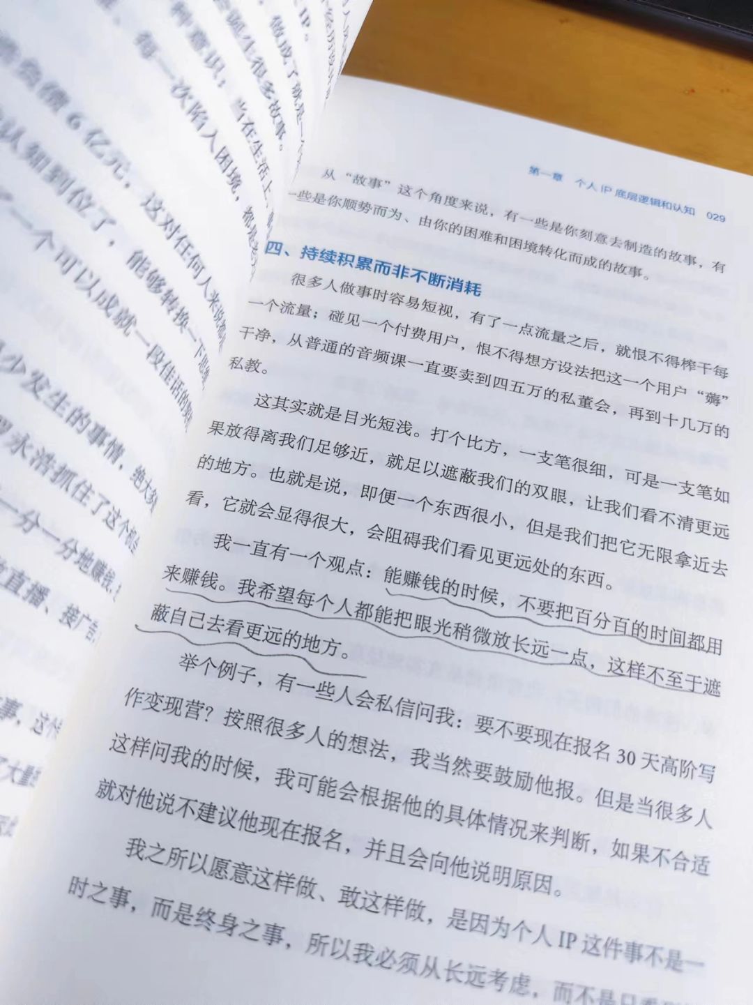 书中的一段话让我的印象很深,甚至在读的当天我还发了一条朋友圈:能赚钱的时候不要把百分之百的时间都用来赚钱,我希望每个人都能把眼光稍微放的长远一些,这样不至于屏蔽自己去看更远的地方。