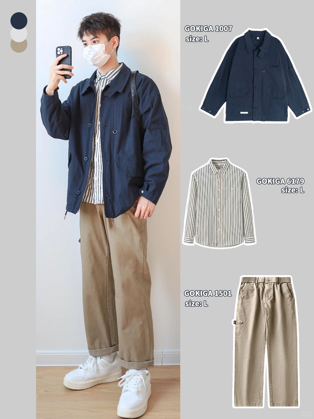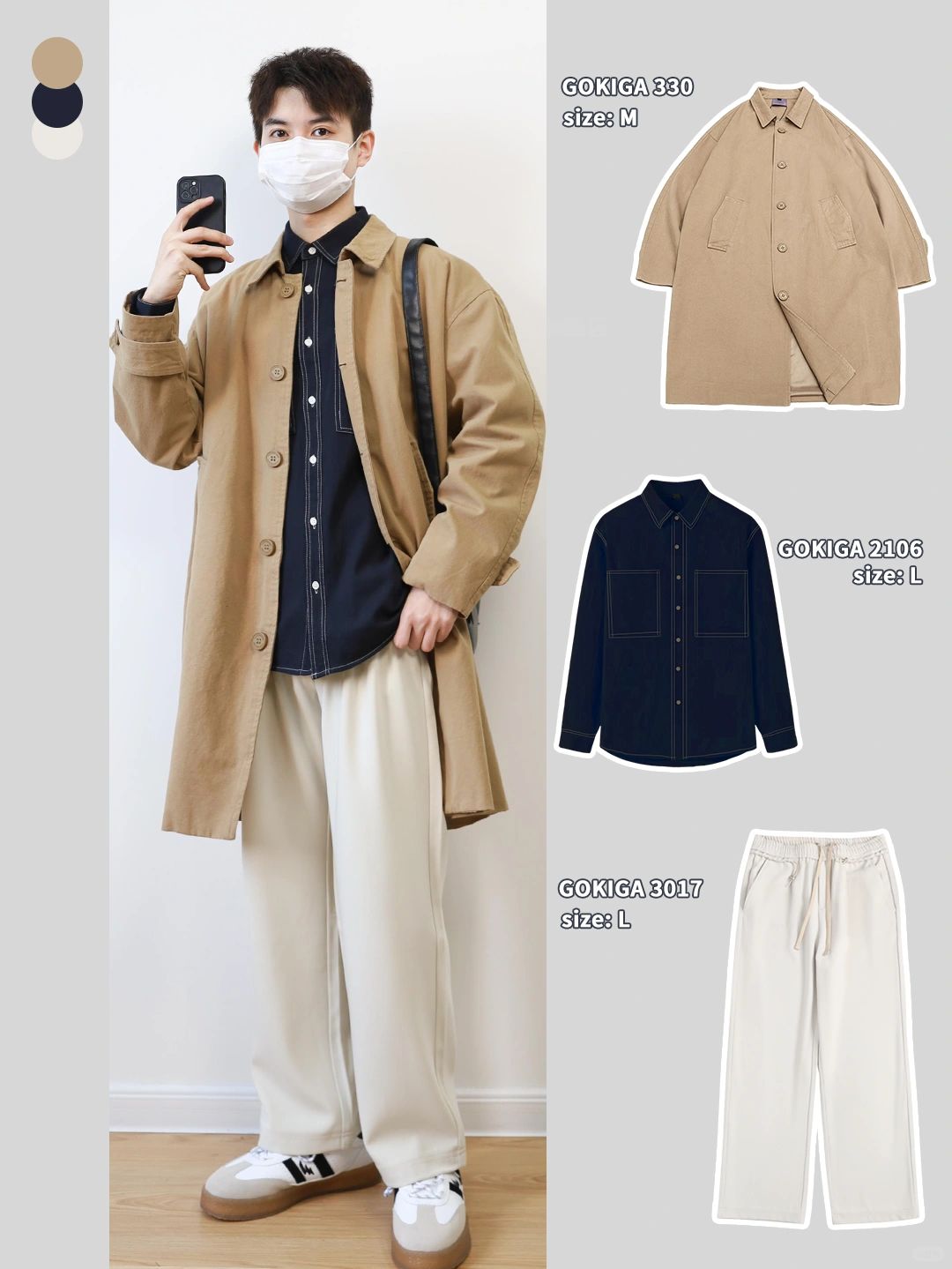 🔘卡其风衣搭配米白休闲裤,内搭深蓝色,内深外浅整体不怕出错!