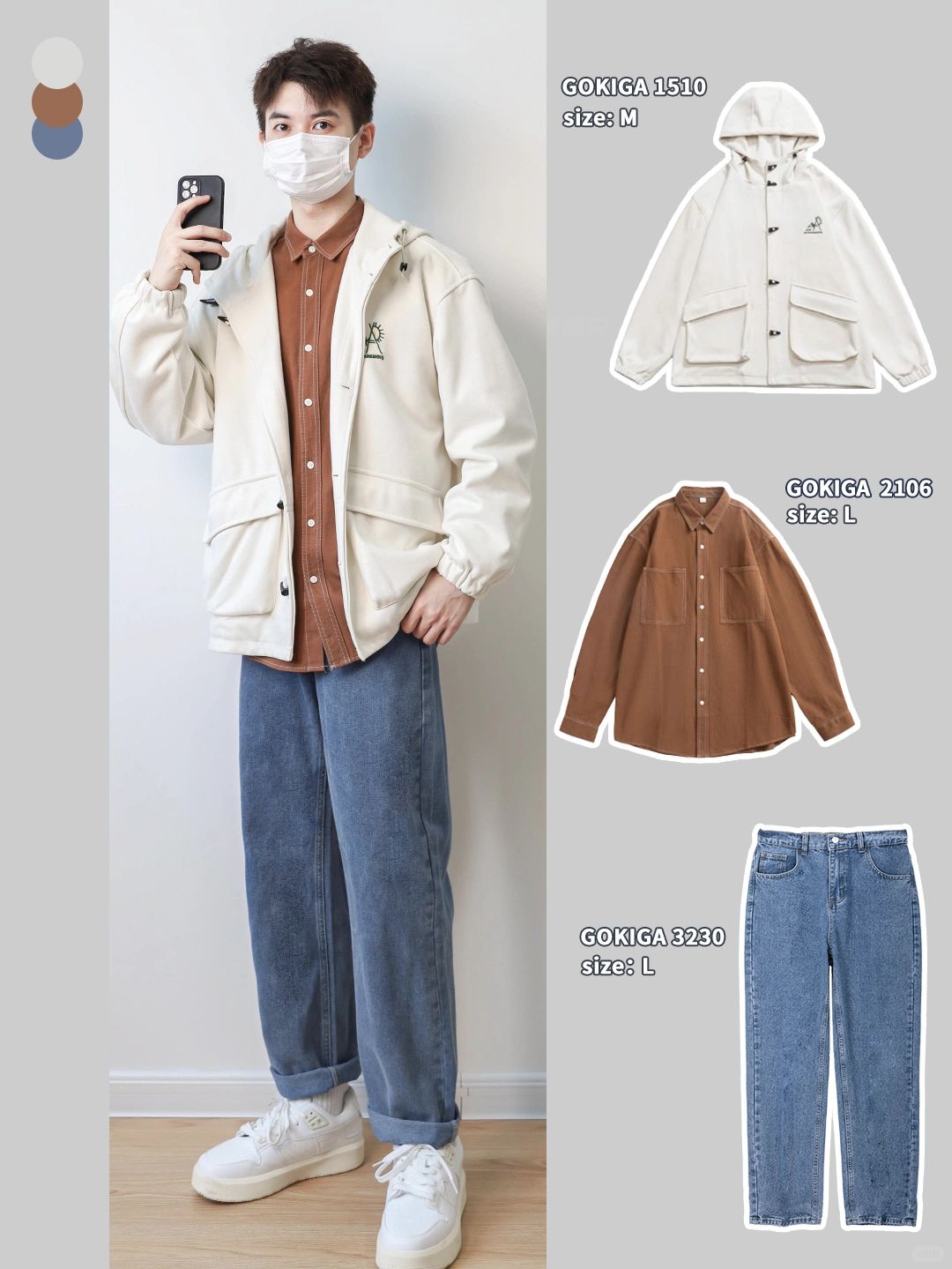 🔘咖色和中蓝色为互补色搭配,整体视觉感强,加上浅色外套增加层次!