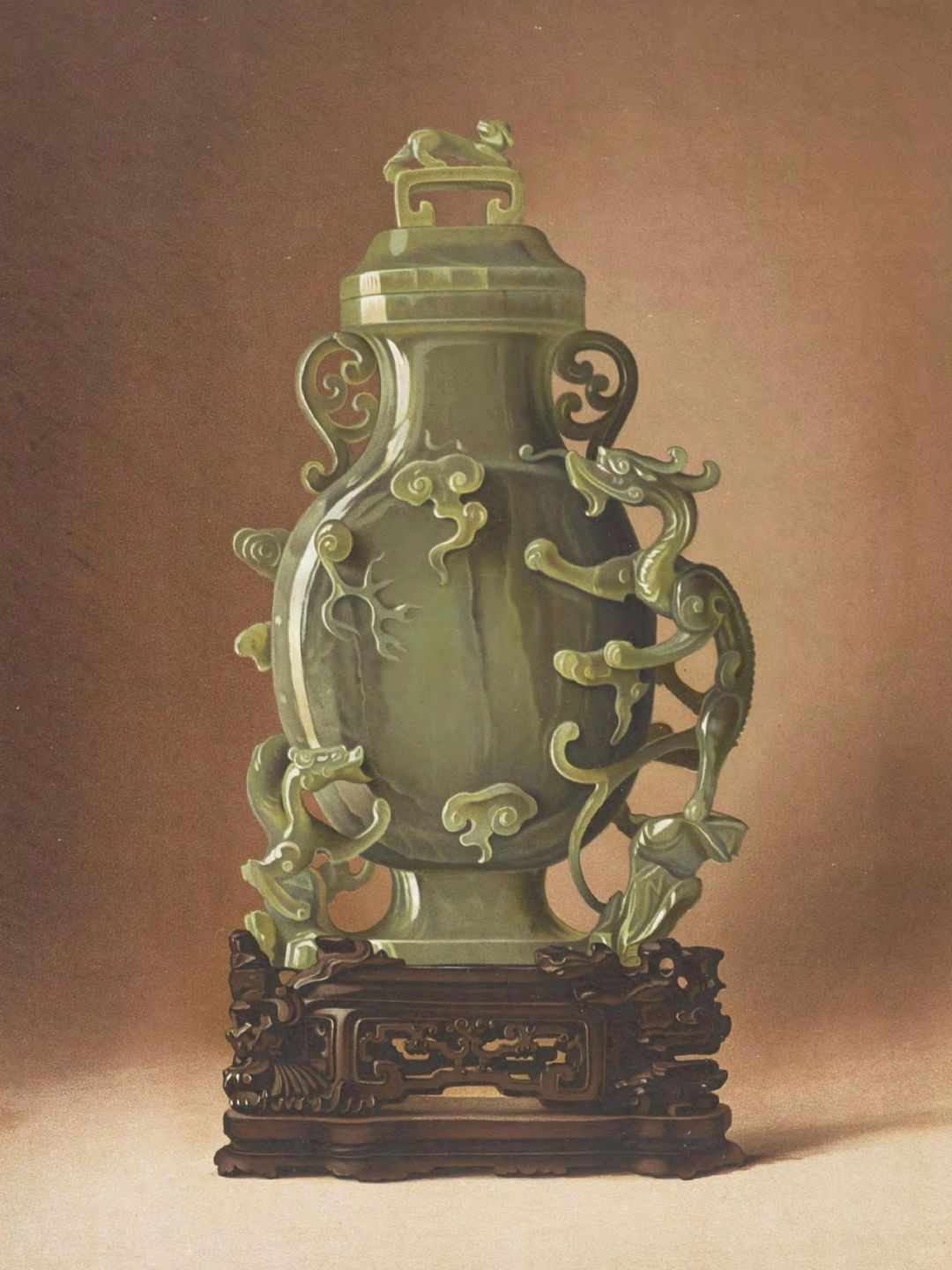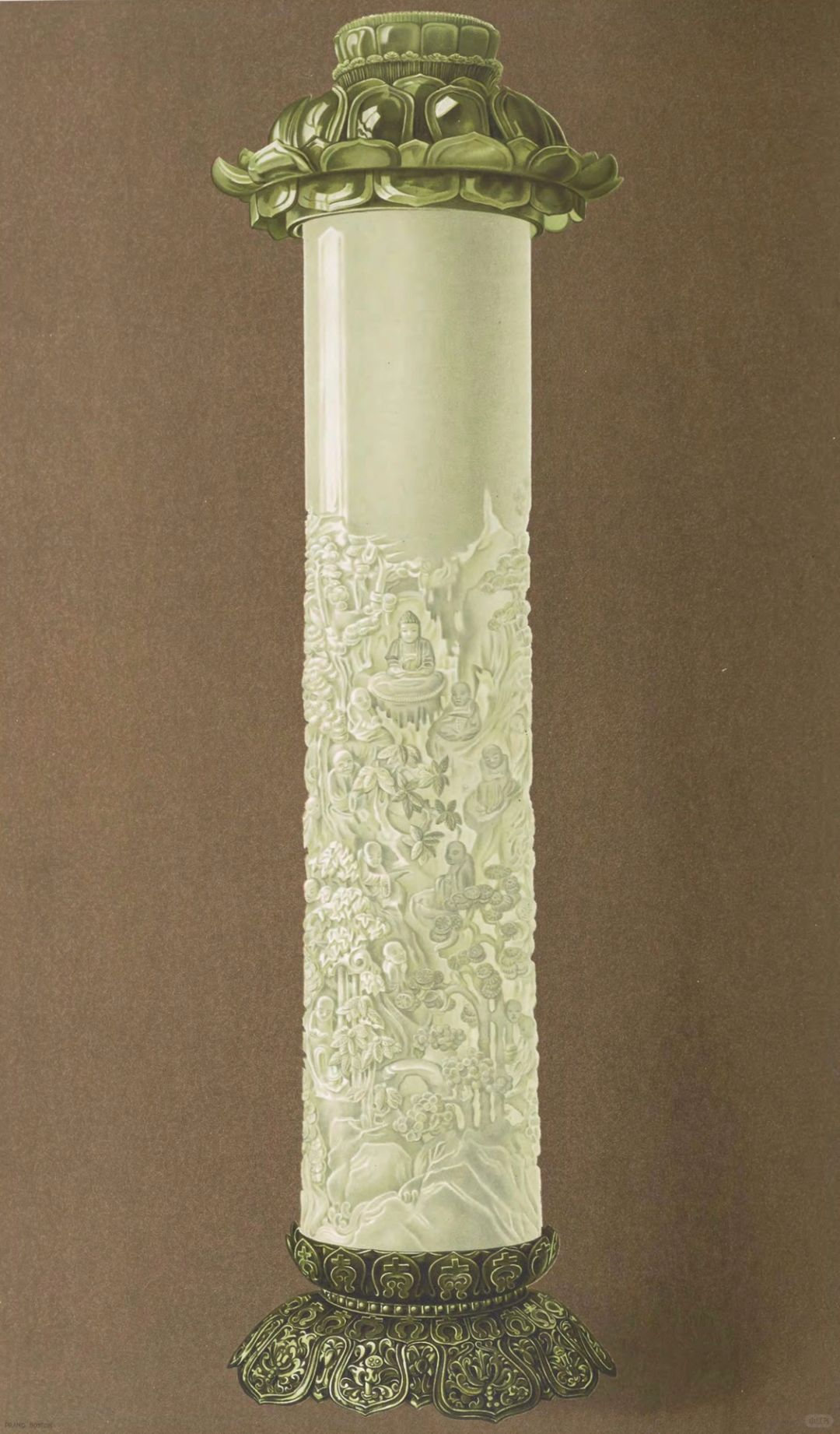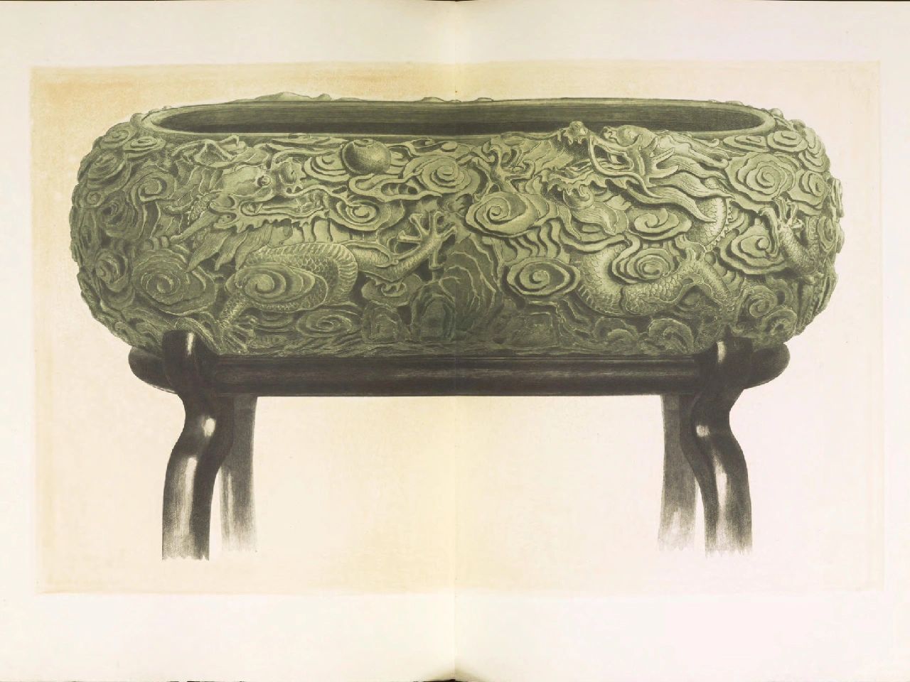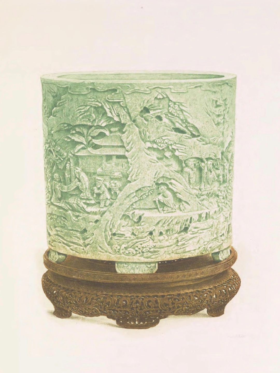 此玉器图源自G.F. Kunz 等人编著的《玉器的调查与研究》(The Bishop Collection: Investigations and Studies in Jade),内有许多美国收藏家 H.R.Bishop 收藏的精美的中国玉器,器型涉及笔筒、仿古青铜觚、仿生白菜、三足鼎、尊、卣、瓶、水呈、插屏、香筒等。“有器必有工,有工必有意,有意必吉祥”,器物上多有寓意丰富的纹饰,如曲水流觞、松间高士图、驱邪除魔的饕餮纹、白菜谐音“百財”、七佛水呈、达摩过江、龙凤呈祥、福禄寿、福禄万代等。此书出版于 1906 年。