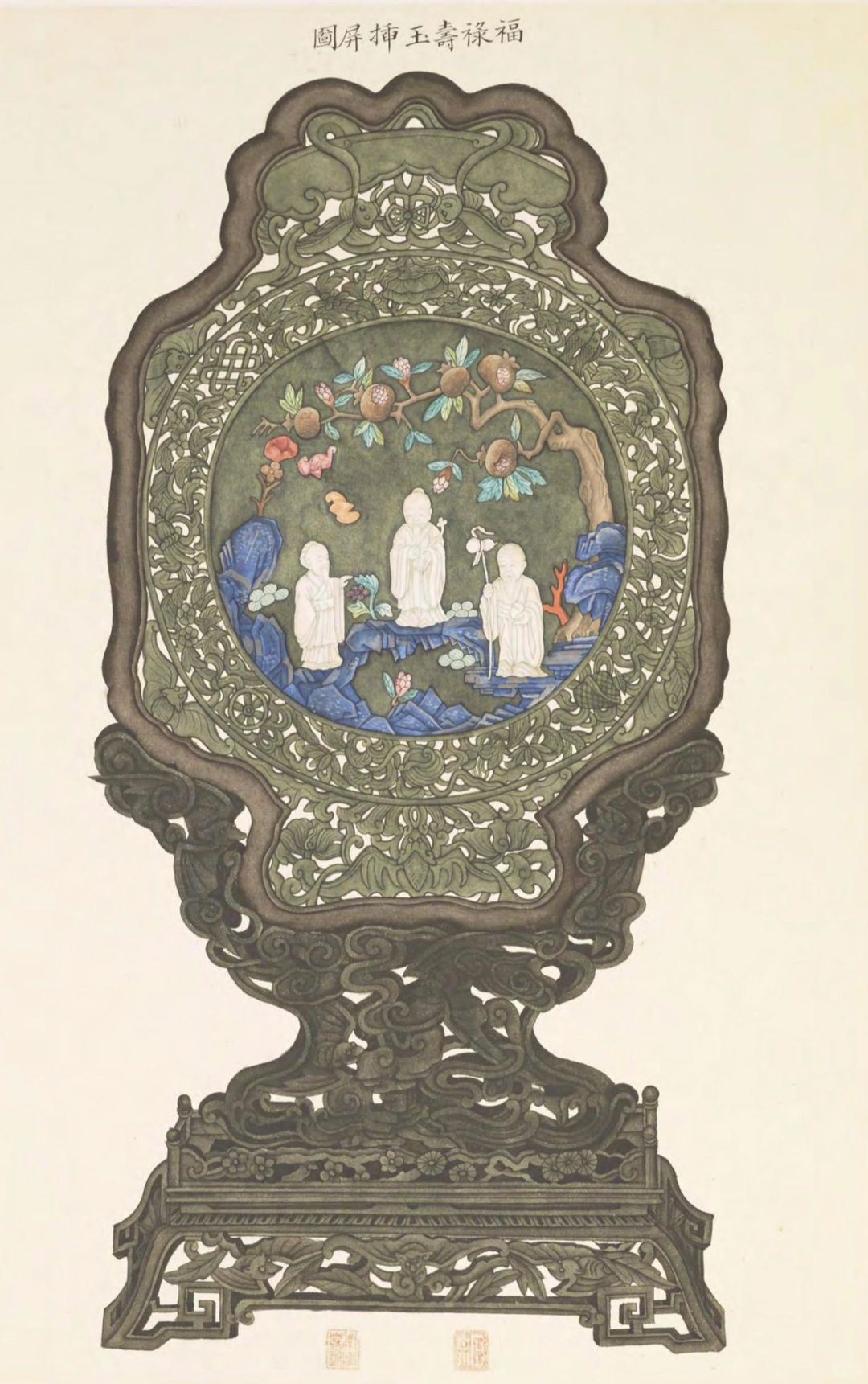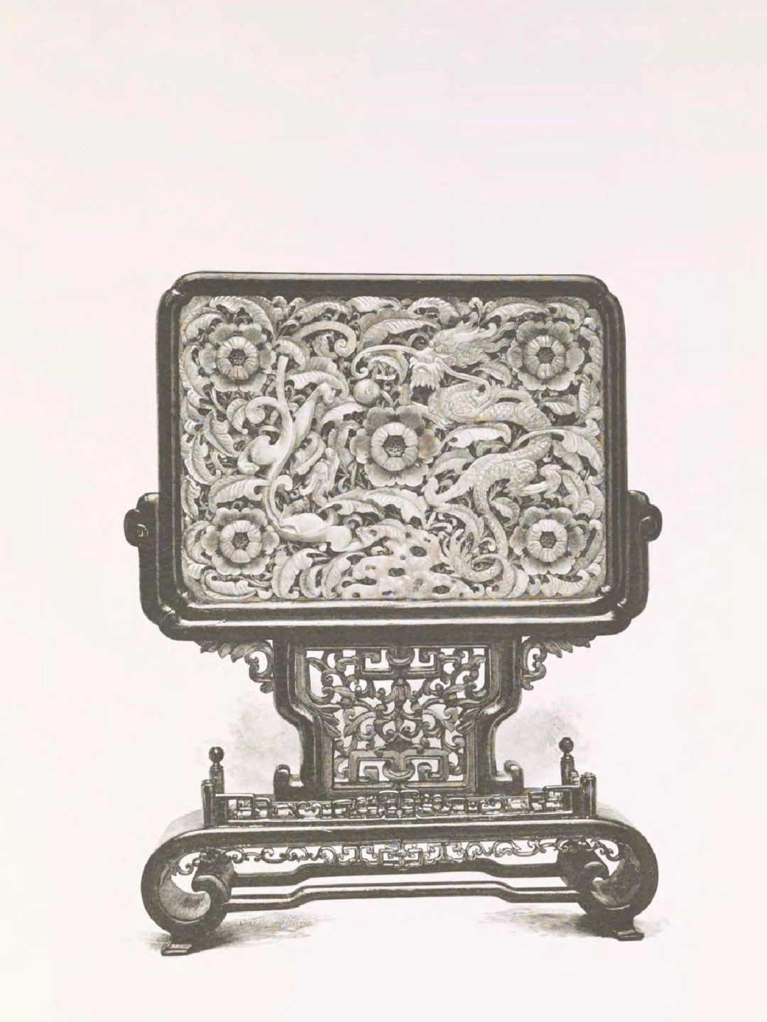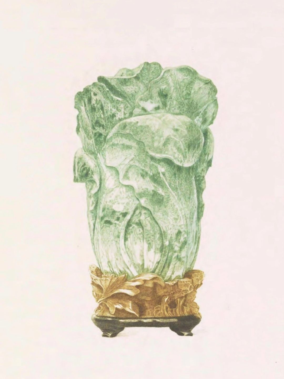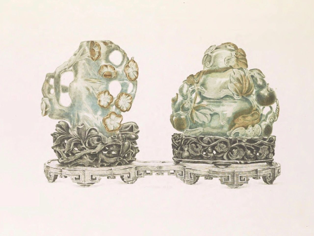 此玉器图源自G.F. Kunz 等人编著的《玉器的调查与研究》(The Bishop Collection: Investigations and Studies in Jade),内有许多美国收藏家 H.R.Bishop 收藏的精美的中国玉器,器型涉及笔筒、仿古青铜觚、仿生白菜、三足鼎、尊、卣、瓶、水呈、插屏、香筒等。“有器必有工,有工必有意,有意必吉祥”,器物上多有寓意丰富的纹饰,如曲水流觞、松间高士图、驱邪除魔的饕餮纹、白菜谐音“百財”、七佛水呈、达摩过江、龙凤呈祥、福禄寿、福禄万代等。此书出版于 1906 年。