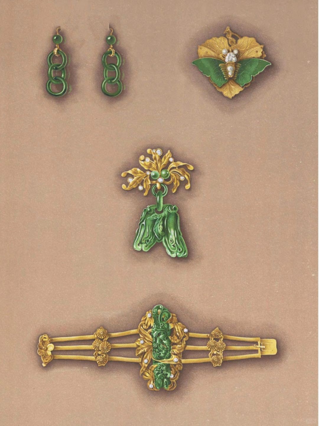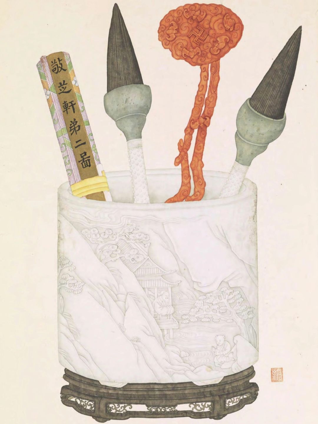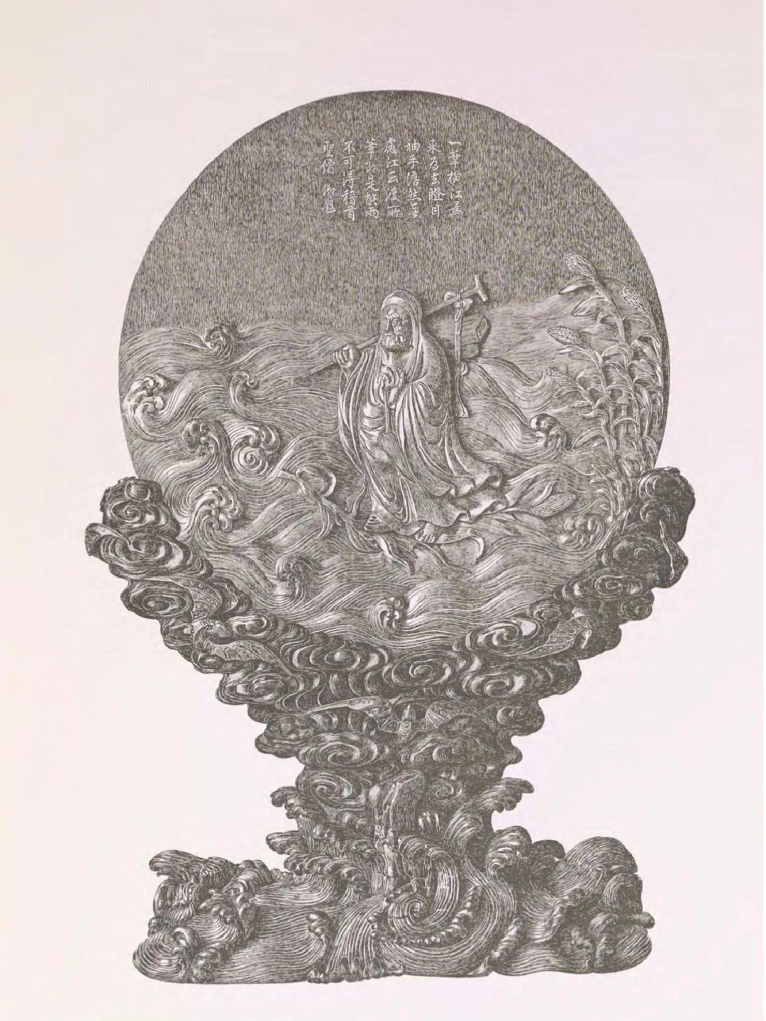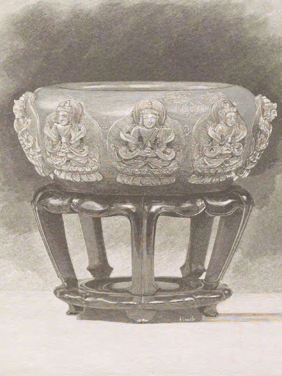 此玉器图源自G.F. Kunz 等人编著的《玉器的调查与研究》(The Bishop Collection: Investigations and Studies in Jade),内有许多美国收藏家 H.R.Bishop 收藏的精美的中国玉器,器型涉及笔筒、仿古青铜觚、仿生白菜、三足鼎、尊、卣、瓶、水呈、插屏、香筒等。“有器必有工,有工必有意,有意必吉祥”,器物上多有寓意丰富的纹饰,如曲水流觞、松间高士图、驱邪除魔的饕餮纹、白菜谐音“百財”、七佛水呈、达摩过江、龙凤呈祥、福禄寿、福禄万代等。此书出版于 1906 年。