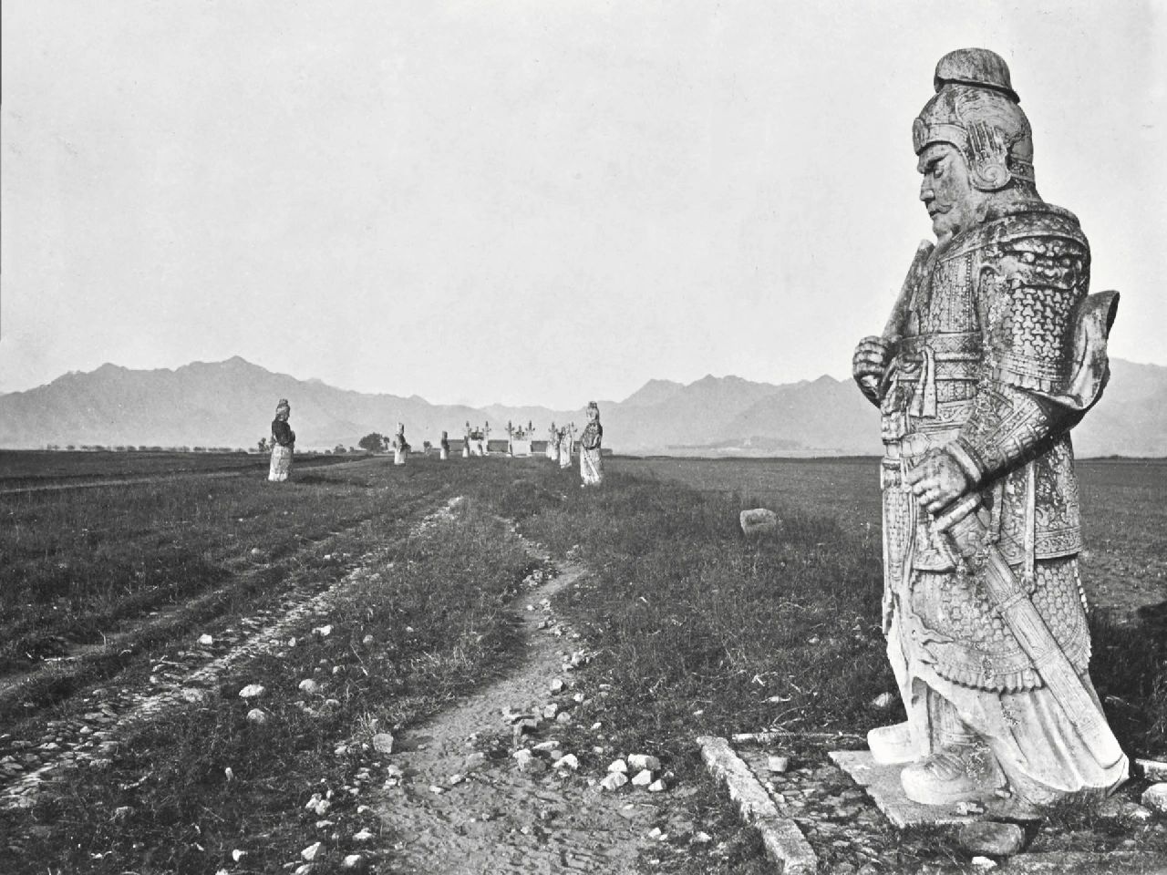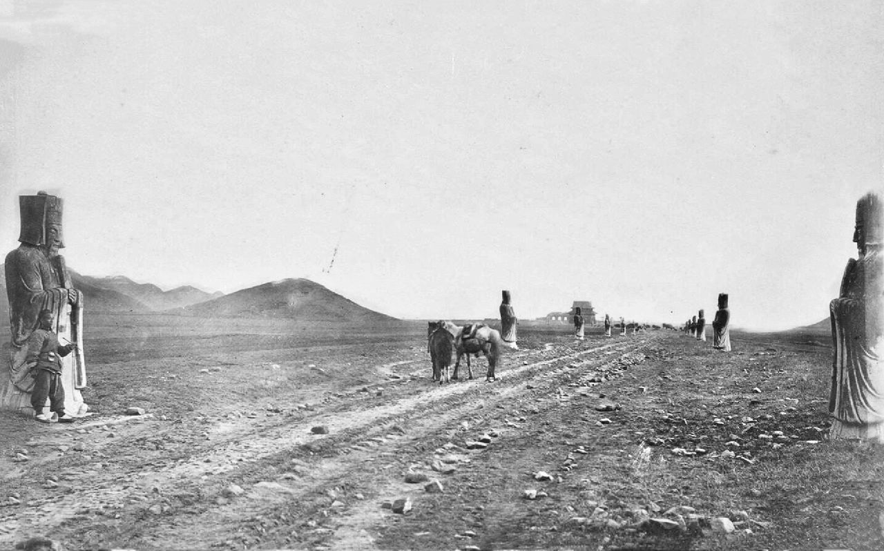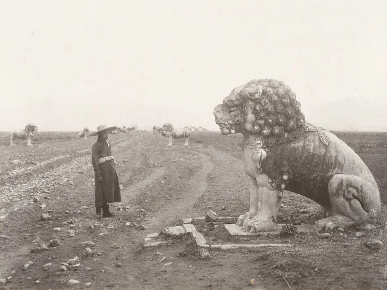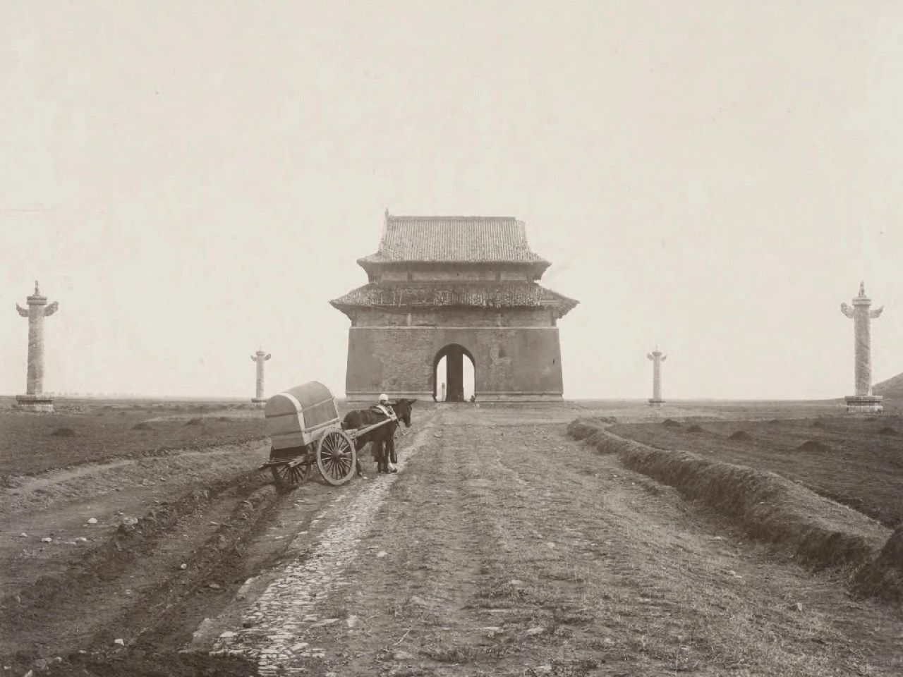 明十三陵的神路完整地讲应该有七公里长,完整的明十三陵遗址,其实是包括明嘉靖年修建的石牌坊,石牌坊是明十三陵的起点,它是中国现存最大、最早的石坊建筑,也是整个十三陵区最前端的领头建筑。石牌坊为汉白玉仿木结构,修建于明嘉靖十九年(1540年),五门六柱十一楼,高十四米,阔近三十米。可惜很多游人来十三陵游览都错过了。神路由南向北依次是:石牌坊,三孔桥,大宫门(俗称大红门)、碑亭(内立“大明长陵神功圣德碑”)、石像生、龙凤门(棂星门)、南五孔桥、七孔桥、北五孔桥。神路景观从清末民初的破败但有完整的天际线到园林公园的绿树成荫,整洁整齐,似乎缺少了什么东西。老照片分别由中外摄影师拍摄于1879-1906年间。