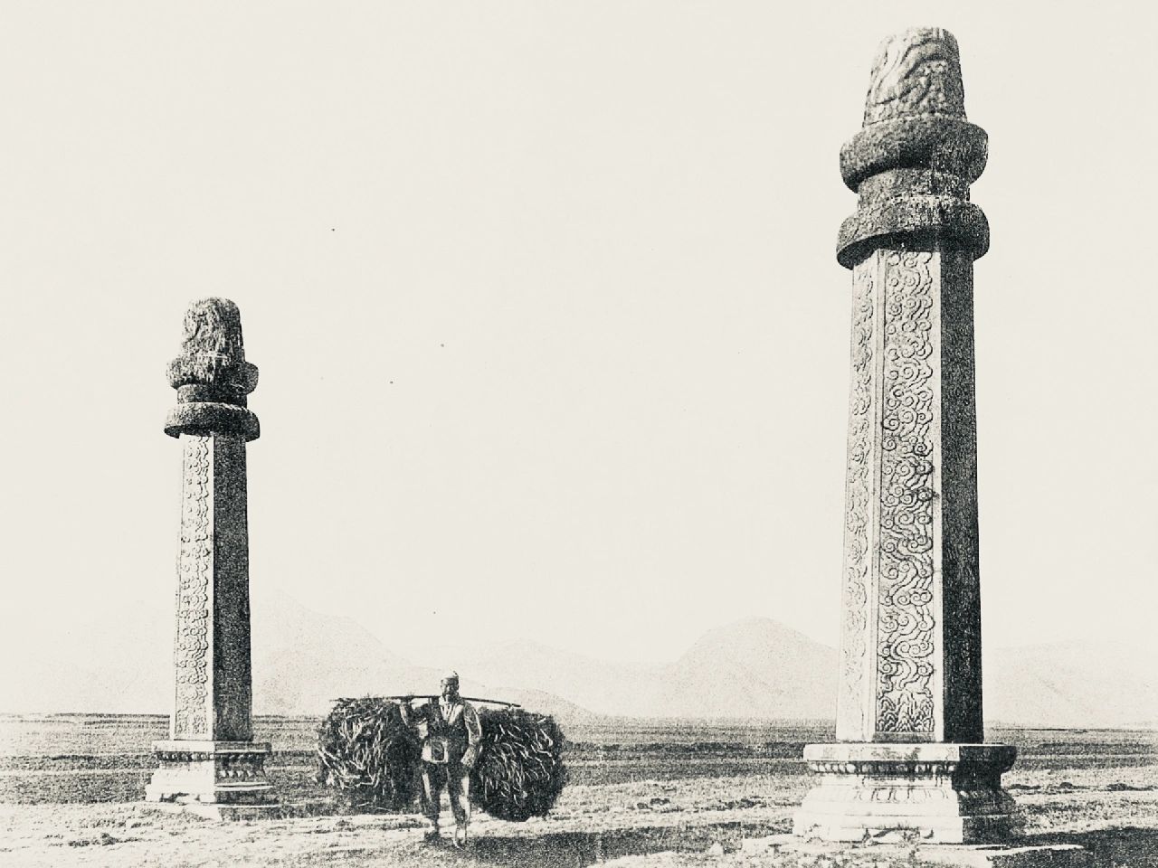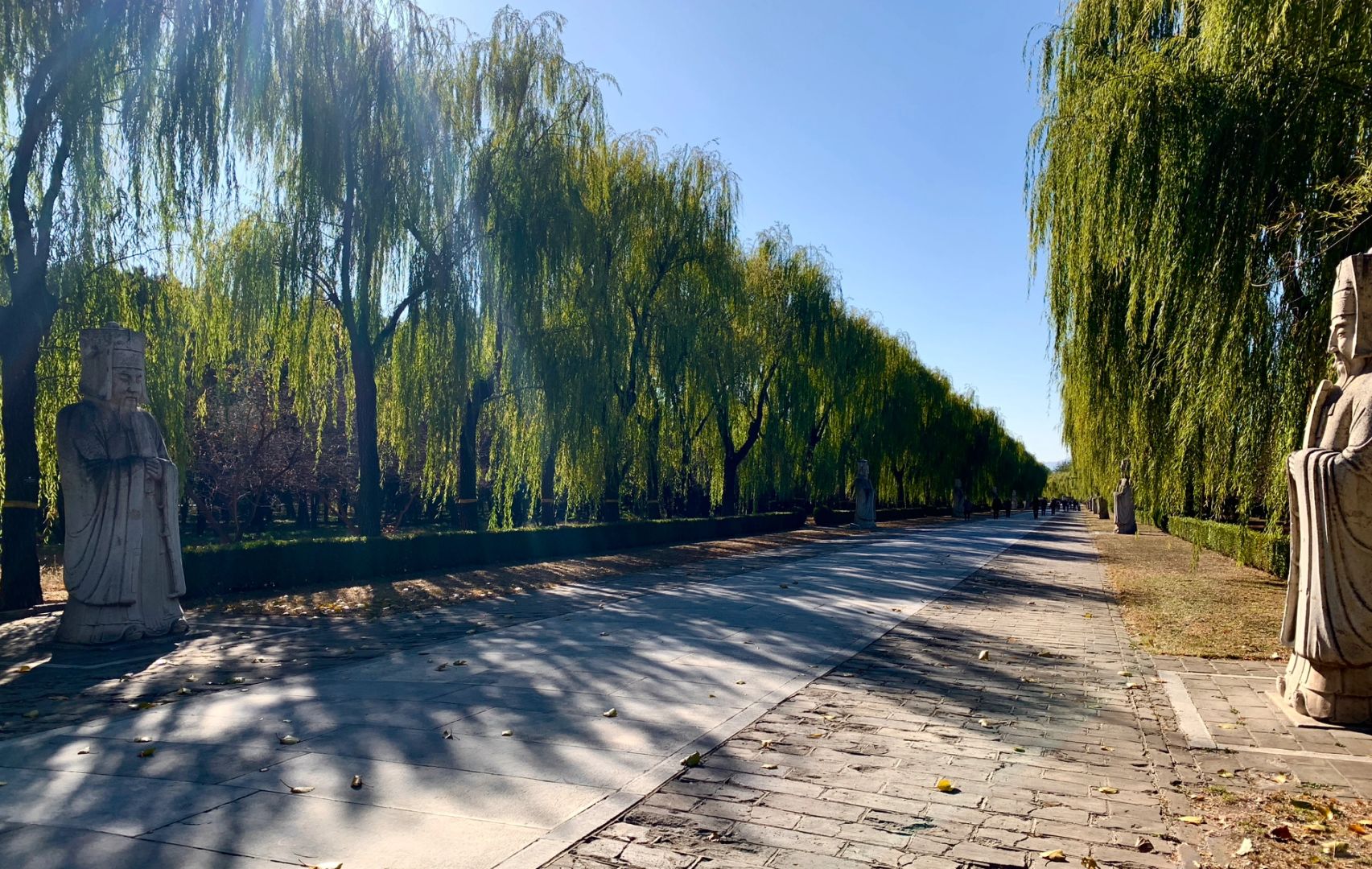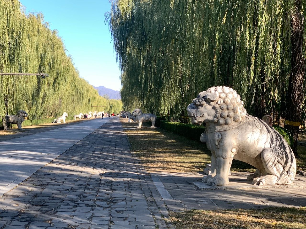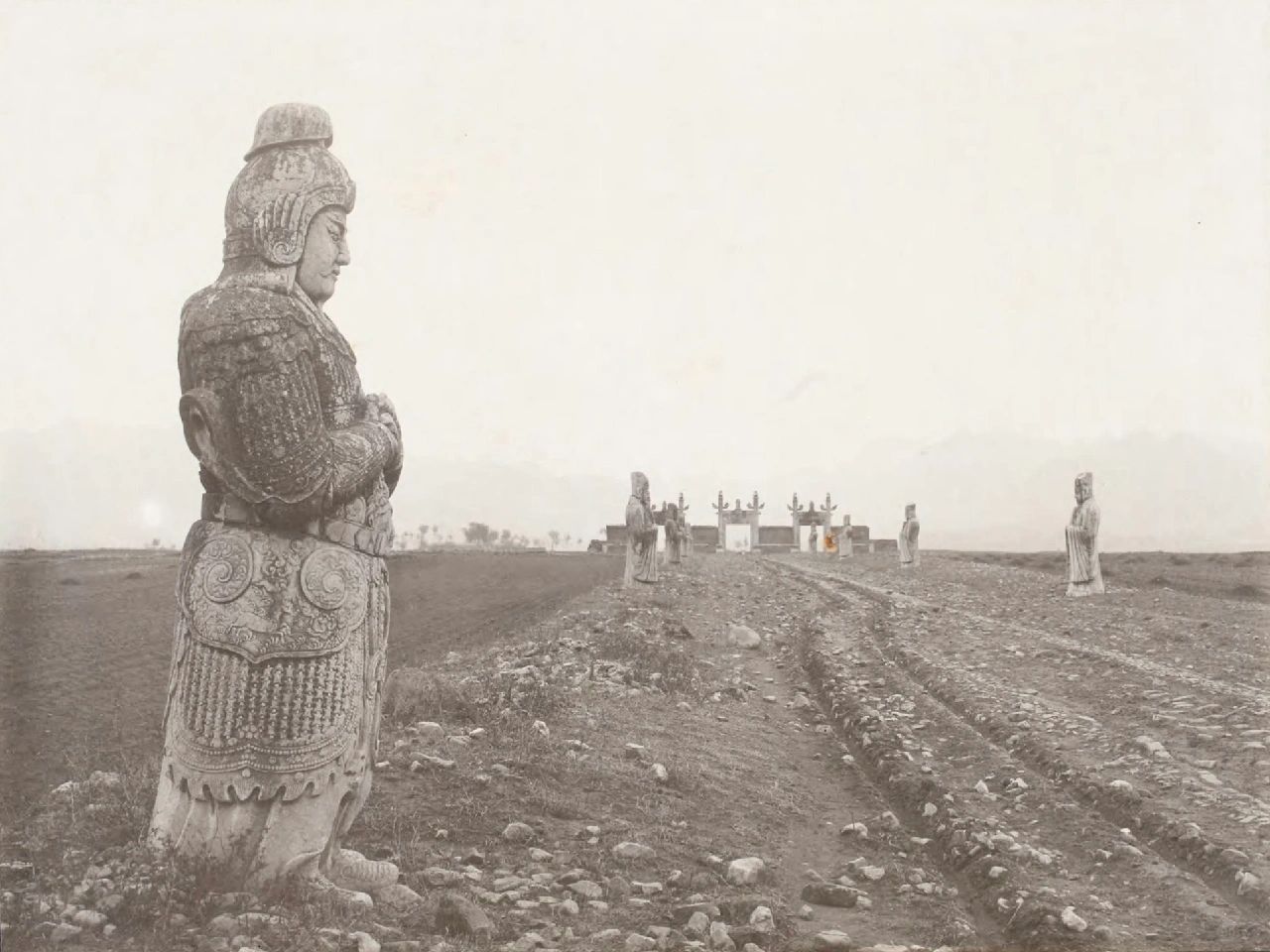 明十三陵的神路完整地讲应该有七公里长,完整的明十三陵遗址,其实是包括明嘉靖年修建的石牌坊,石牌坊是明十三陵的起点,它是中国现存最大、最早的石坊建筑,也是整个十三陵区最前端的领头建筑。石牌坊为汉白玉仿木结构,修建于明嘉靖十九年(1540年),五门六柱十一楼,高十四米,阔近三十米。可惜很多游人来十三陵游览都错过了。神路由南向北依次是:石牌坊,三孔桥,大宫门(俗称大红门)、碑亭(内立“大明长陵神功圣德碑”)、石像生、龙凤门(棂星门)、南五孔桥、七孔桥、北五孔桥。神路景观从清末民初的破败但有完整的天际线到园林公园的绿树成荫,整洁整齐,似乎缺少了什么东西。老照片分别由中外摄影师拍摄于1879-1906年间。