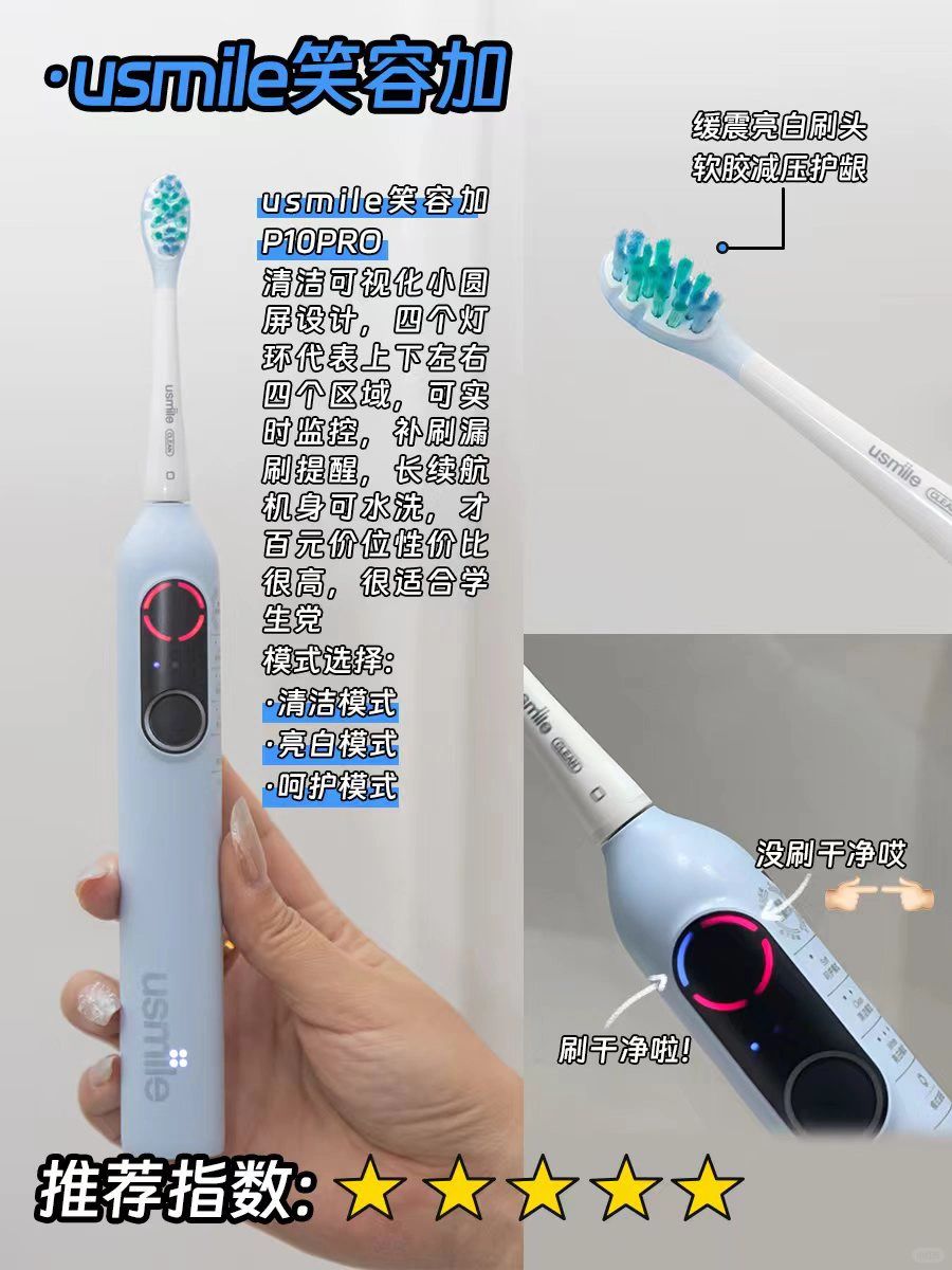 usmile笑容加是专门做电动牙刷的品牌,拥有独立品牌口腔研究院,是专业做口腔护理的品牌,产品能打!颜值超高,云青蓝配色高级,质感也很棒,现在大学生几乎人手一支,性价比很高的一款。