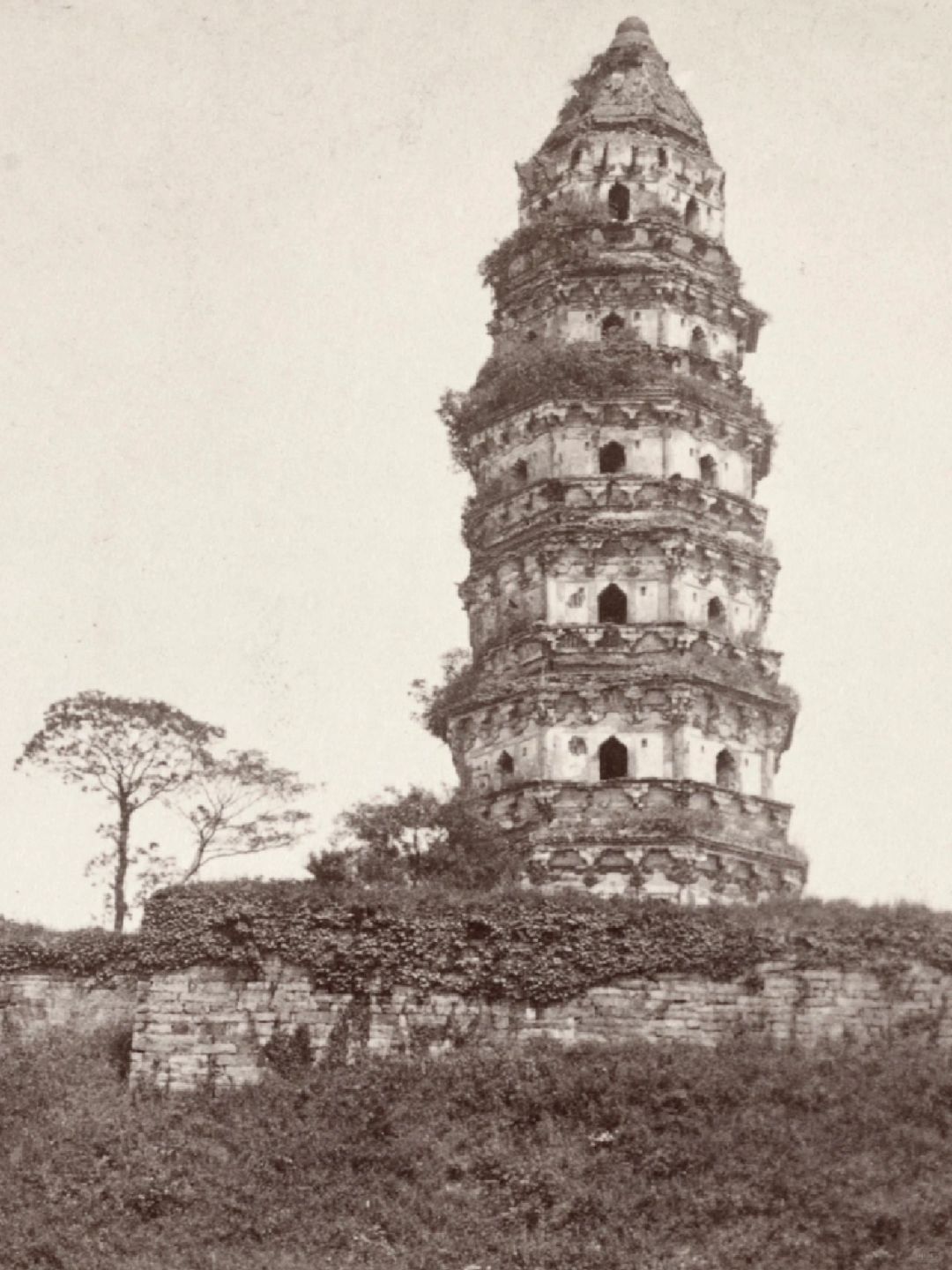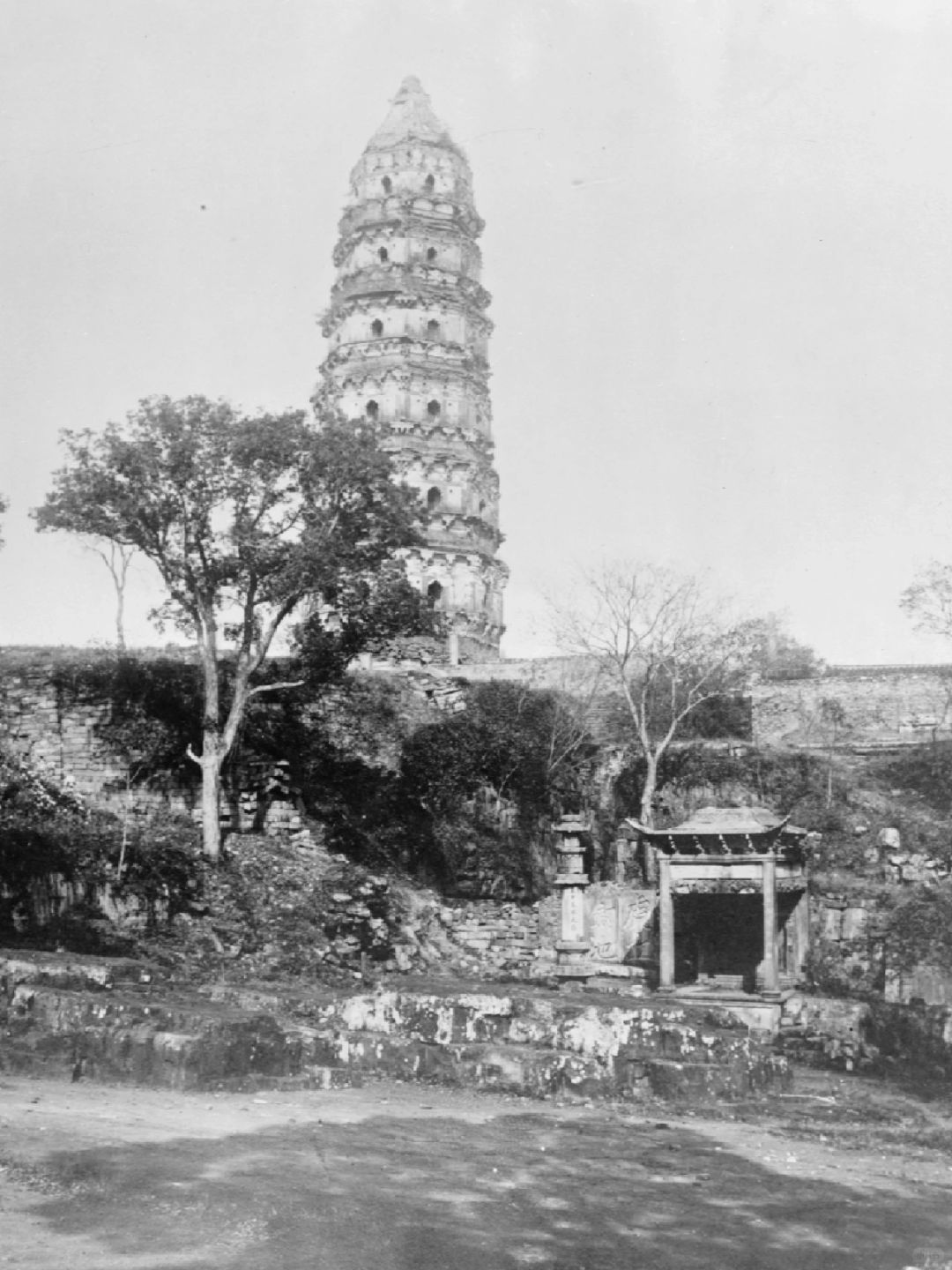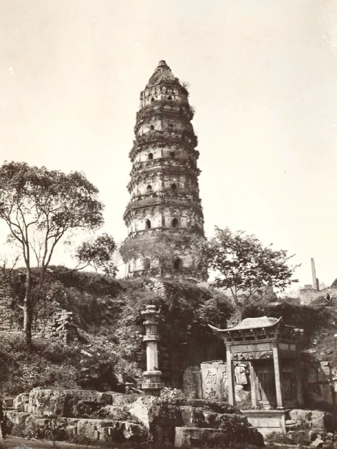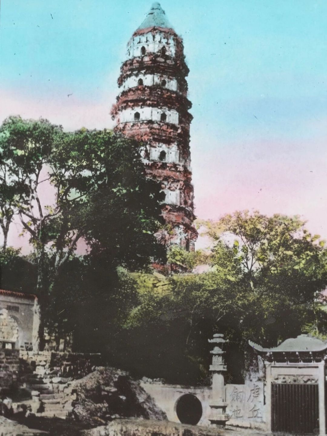 🍀图10-13、苏州云岩寺塔,俗称虎丘塔,塔体倾斜,被誉为“中国的比萨斜塔”。始建于五代后周显德六年(959年),是一座七层八角形仿木结构阁楼式砖身木檐塔,老照片由Ricalton,James,拍摄于1900-1933年间。