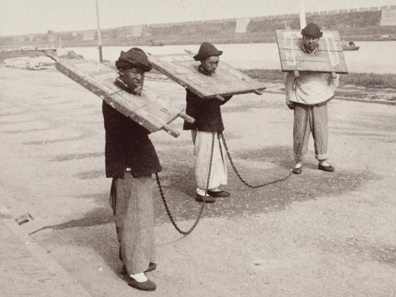 🍀图15、晚清三男子被铁链锁在一起戴枷示众,老照片由Ricalton,James拍摄于1900年。